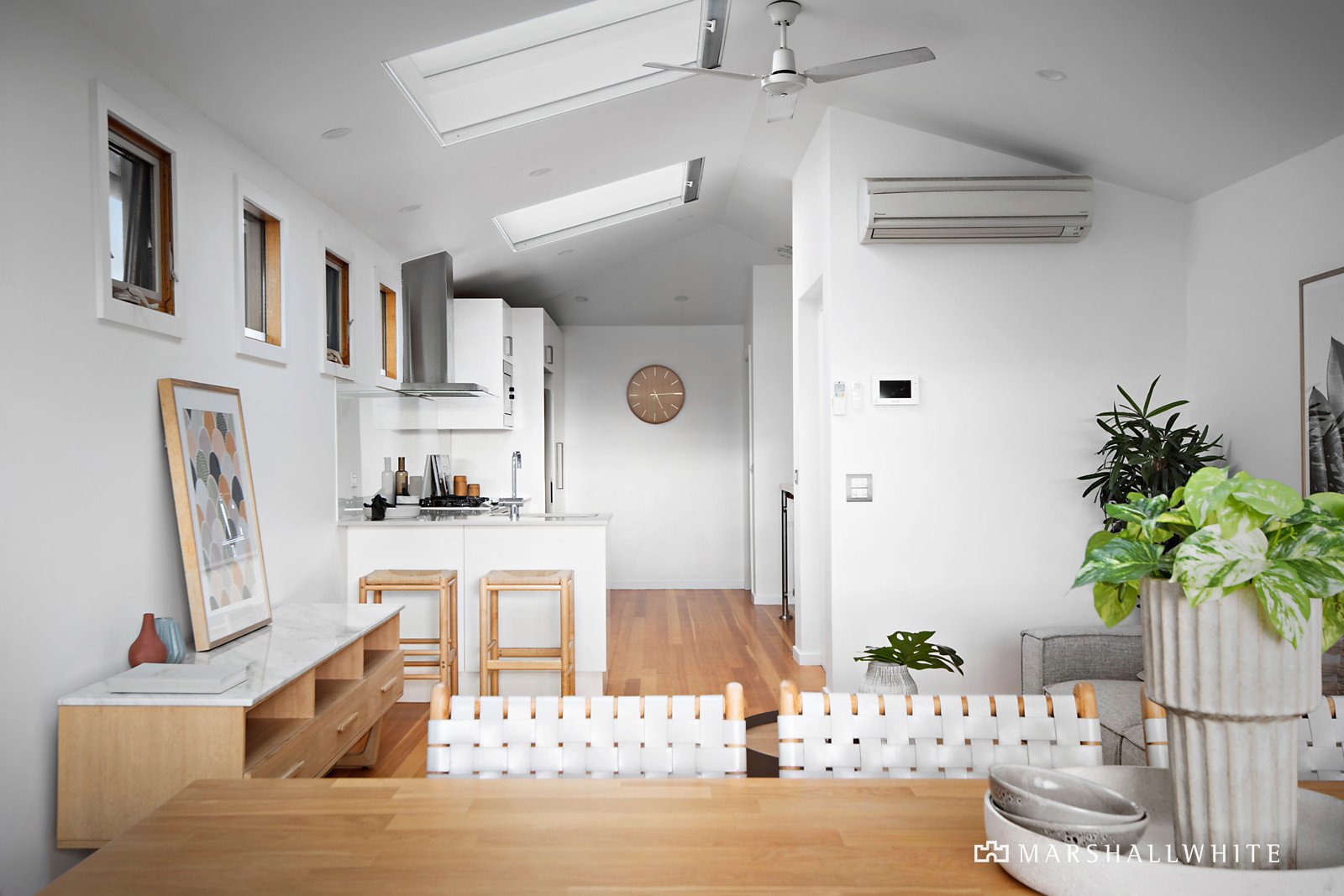 Light-filled and spacious, the generously proportioned home has been custom-designed for relaxed family living and impressive entertaining. A series of large-format skylights, and a cleverly positioned lightwell add to the home's contemporary coastal architectural appeal, enhanced with Tasmanian Oak hardwood flooring and floor-to-ceiling glass stacker doors that connect the mid-level living space to the private, decked alfresco courtyard, which has a large retractable awning.