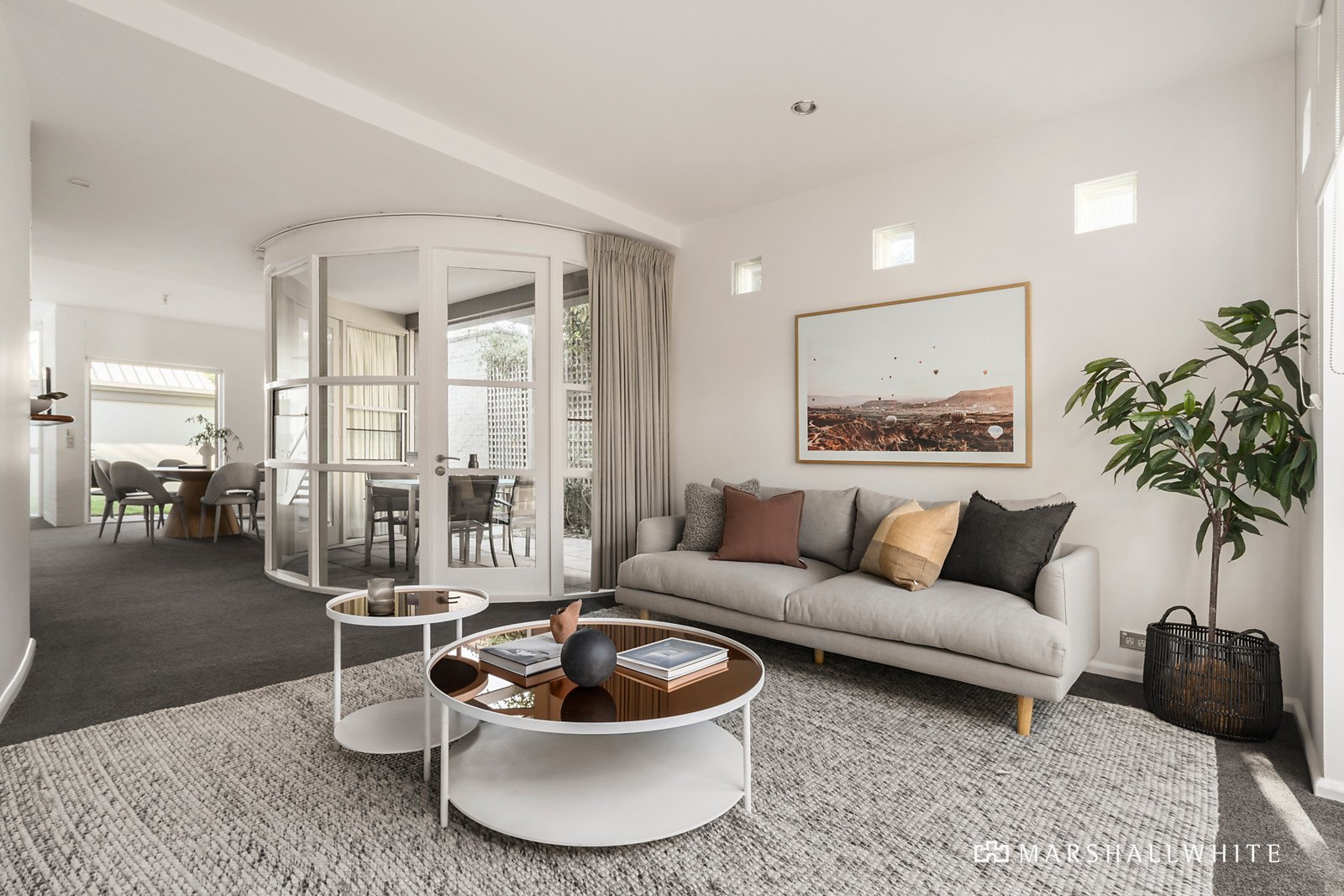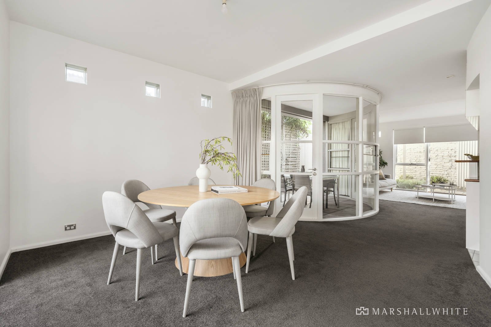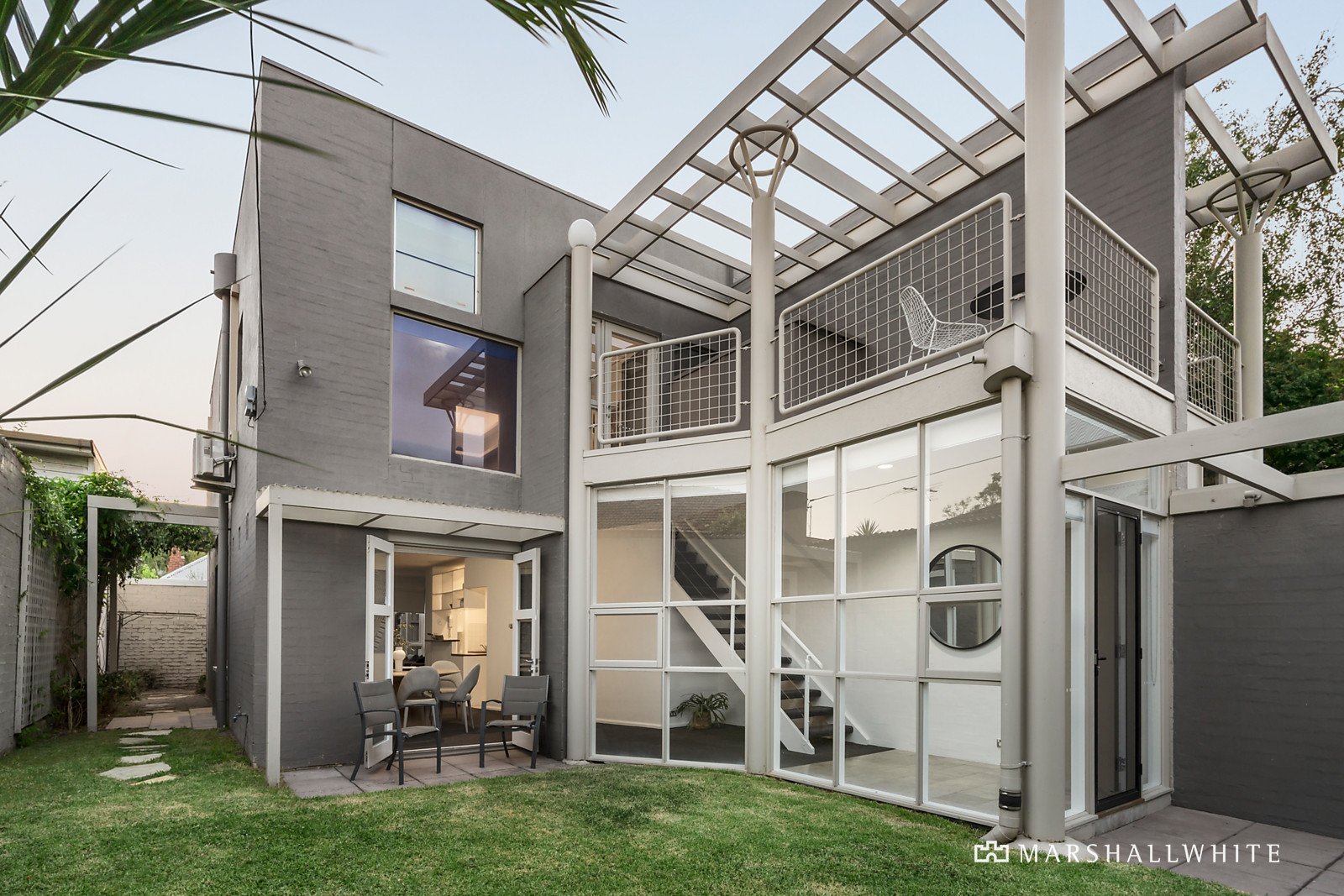 Saturated in year-round northern light, the inviting dining room featuring bagged brick walls overlooks the private north-facing garden. A well-appointed European kitchen and spacious living room open to a semi-circular undercover al fresco terrace and the private rear garden. Upstairs, the gorgeous main bedroom with stylish en suite and walk in robe accesses its own north-facing balcony. There are also two additional double bedrooms with robes and a designer bathroom.