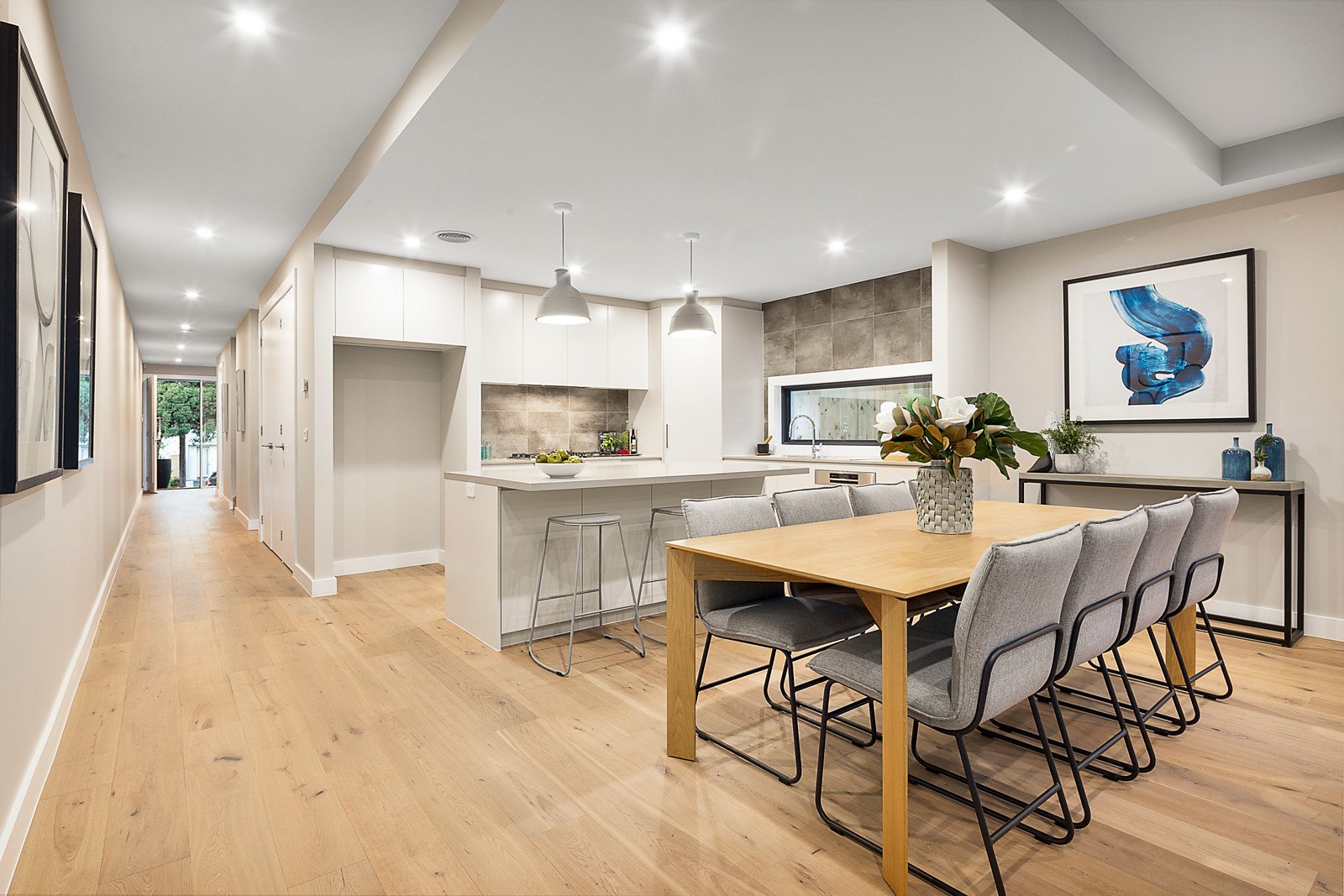 Oak floors flow through the welcoming entrance hall with a clever study nook, a sublime gourmet kitchen appointed with premium Bosch appliances and stone benches and an exceptionally spacious living and dining room. Sliding glass doors open the living space to a large covered al fresco terrace and the private northwest garden. A convenient downstairs bedroom with built in robe and a stylish bathroom are matched upstairs by a lovely main bedroom with chic en suite and built in robe, two additional bedrooms with built in robes, a stylish bathroom and generous light filled retreat.