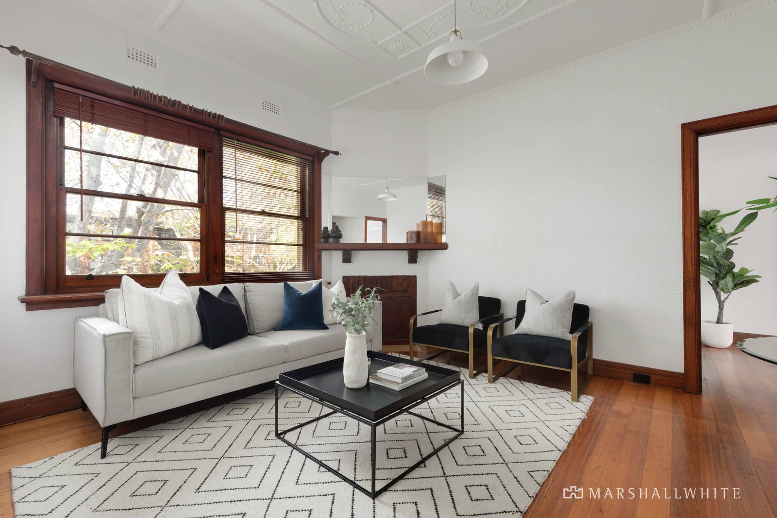 Polished hardwood flooring is complemented by dark timber accents, decorative ceilings and dappled Deco plasterwork, as the dining and living is arranged around an easily reinstated fireplace, all of which is semi-attached to a bright kitchen that serves in style. Meanwhile, the bedrooms are each well-proportioned and the bathroom retains some heritage in this securely accessed first floor apartment with leafy outlooks and intercom entry.