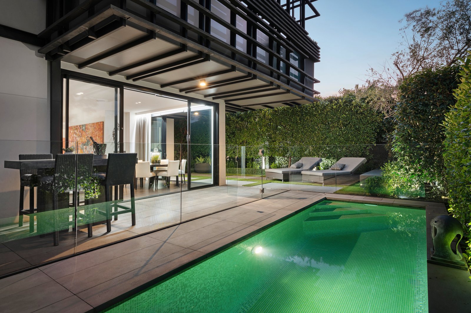 Befitting its esteemed Golden Mile location, a high-end bespoke transformation has lavishly enhanced both the interior and exterior spaces of this single-level ground-floor residence in Brighton’s celebrated ‘Sanctum’ domain, further distinguished by a private north-facing wraparound alfresco terrace and a stunning emerald Bisazza glass-mosaic tiled swimming pool.