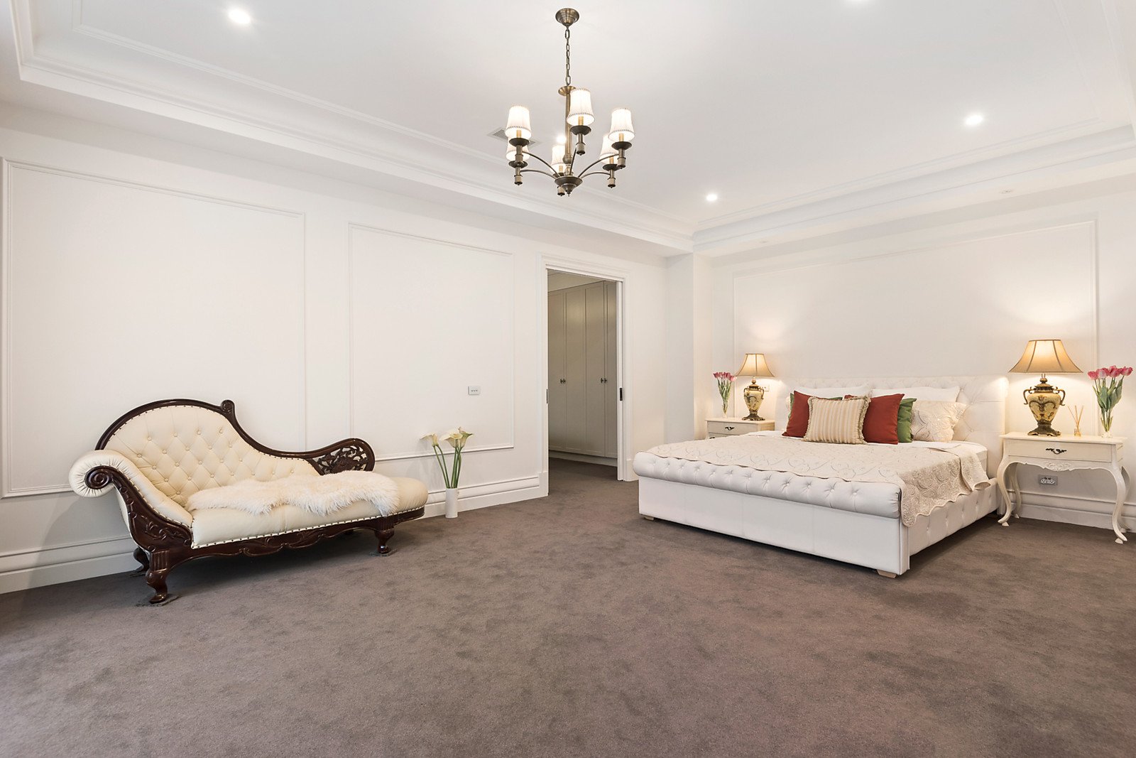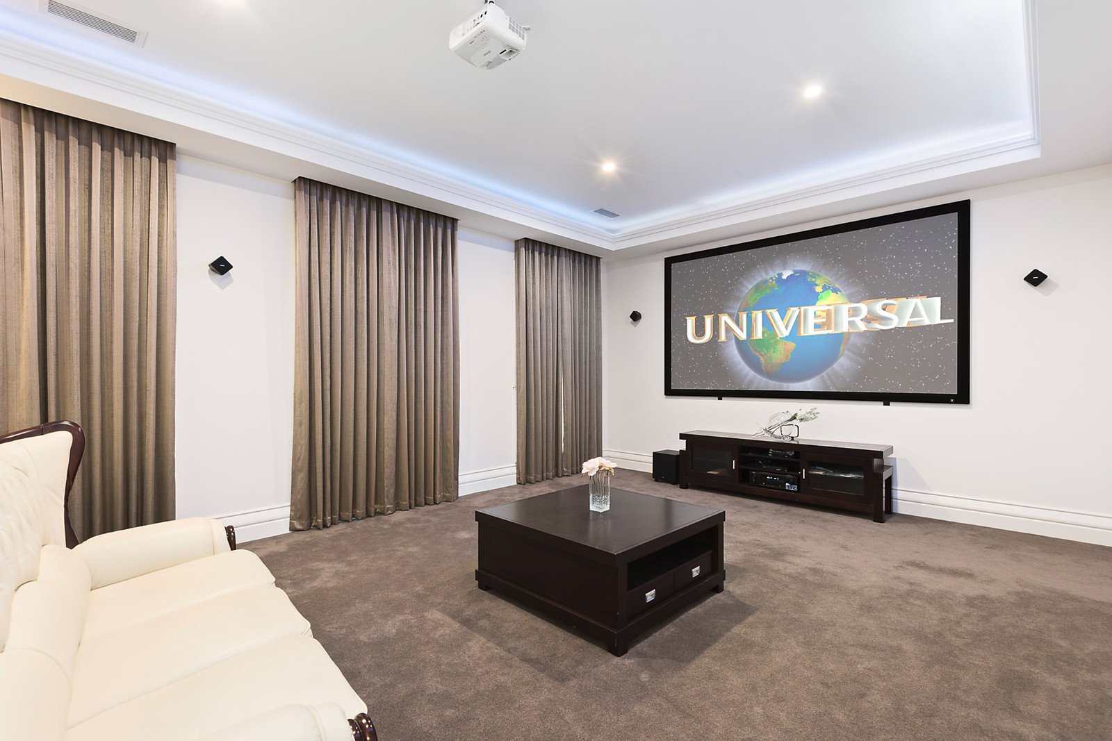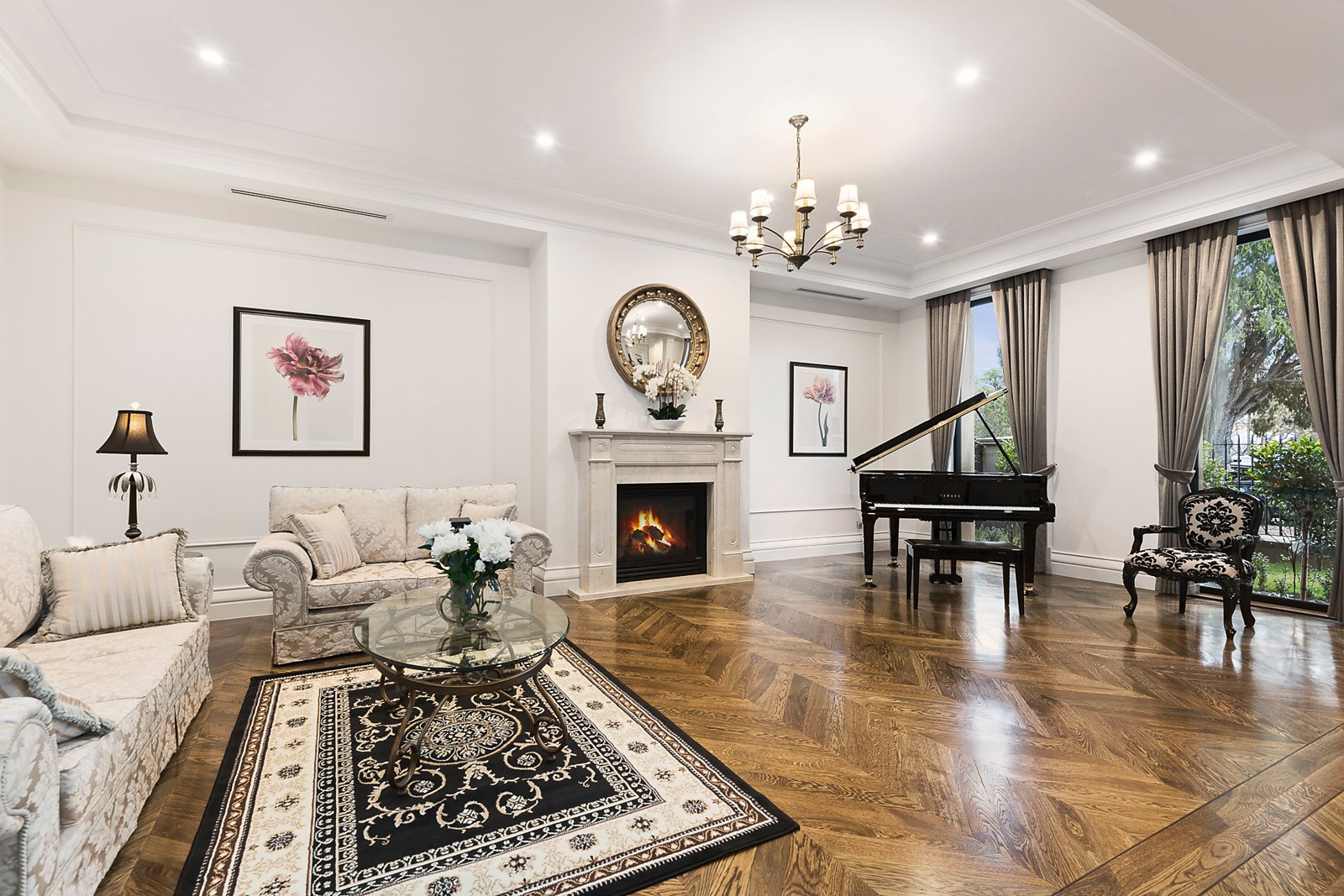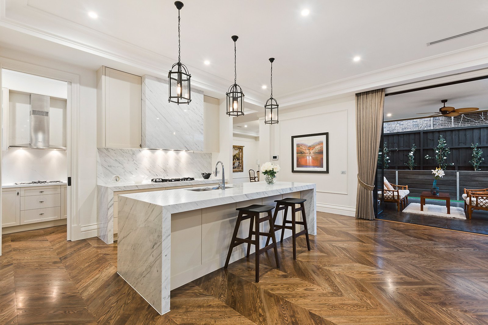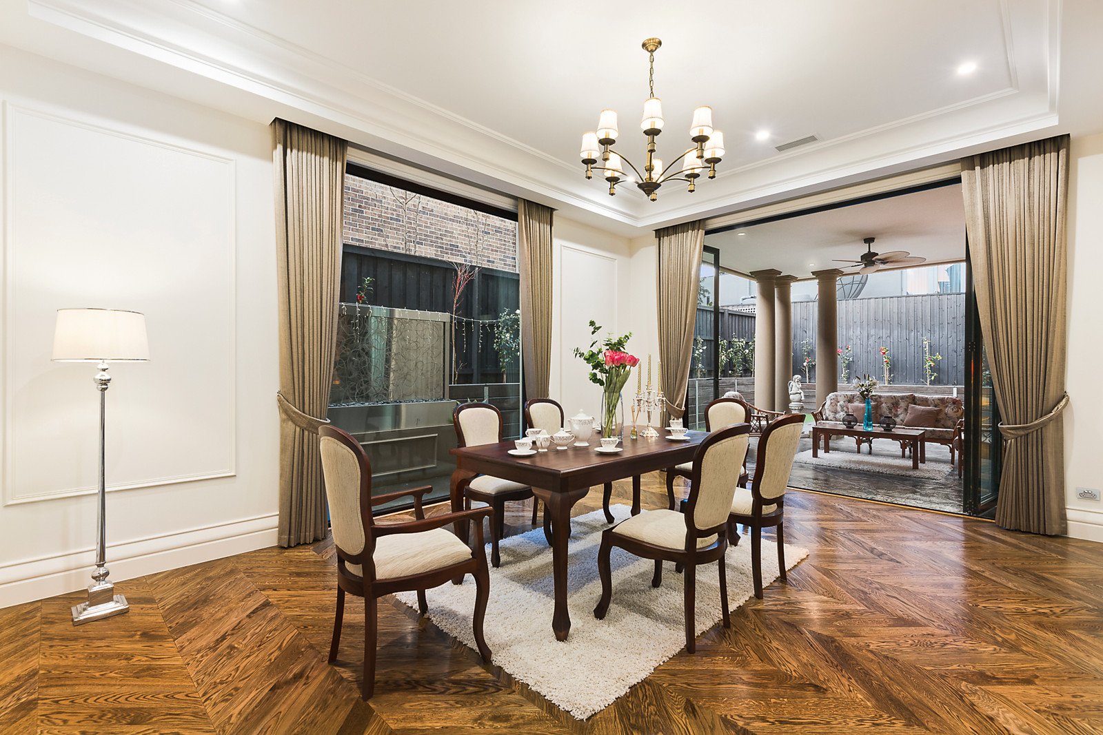 A double door entry introduces 3.4 metre ceilings and American oak parquetry floors through the refined sitting room with gas fireplace and an inviting formal dining room. Spectacular in scale, the light-filled living and dining room with a premium Miele kitchen boasting marble benches and a full butler's pantry open to a sensational covered al fresco dining terrace and landscaped northeast garden surrounds. A convenient downstairs guest bedroom is appointed with en-suite and walk in robe. A seductively curved staircase leads up a fabulous fully fitted media room and five beautiful double bedrooms all with Spanish Travertine en-suites and walk-in/built-in robes including an opulent main bedroom suite.