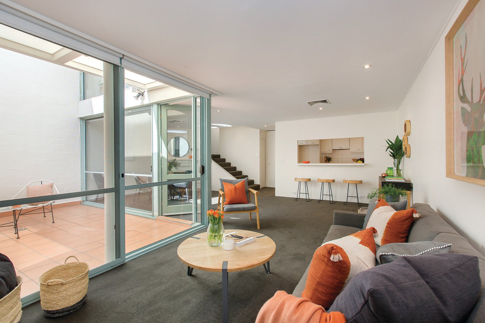 Equipped with Bosch appliances, the vast open-plan kitchen/dining/lounge wraps around a beautiful courtyard entrance that acts both as an al fresco setting and a light-loving atrium. Freshly carpeted throughout, the home flows upstairs to two lovely bedrooms with mirrored robes, another secluded courtyard and a bathroom/laundry that has separate wc. Secure intercom entry, basement parking and terrific storage complete the picture of sublime convenience in this blue ribbon position.