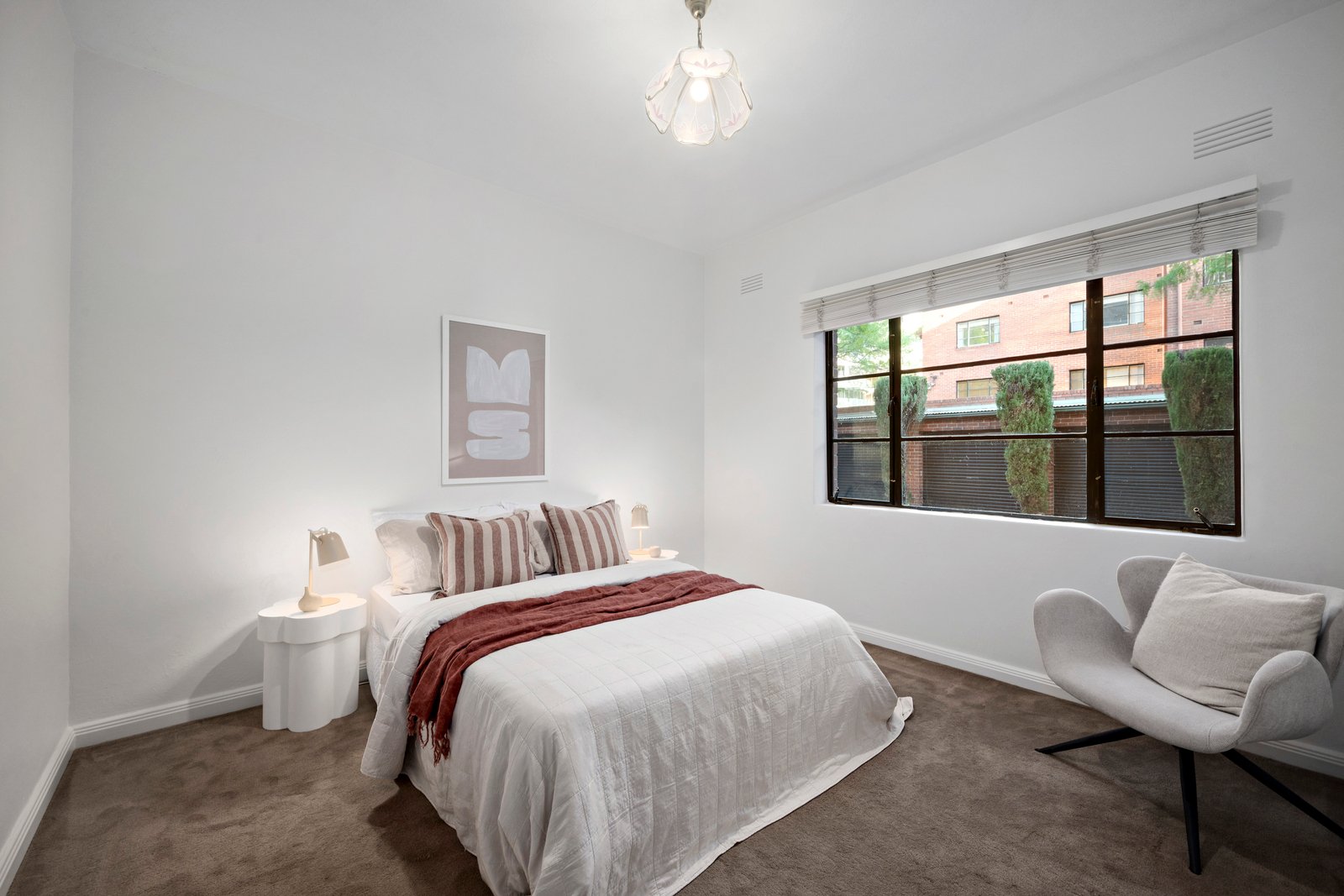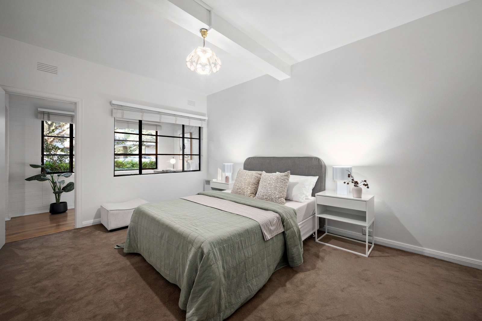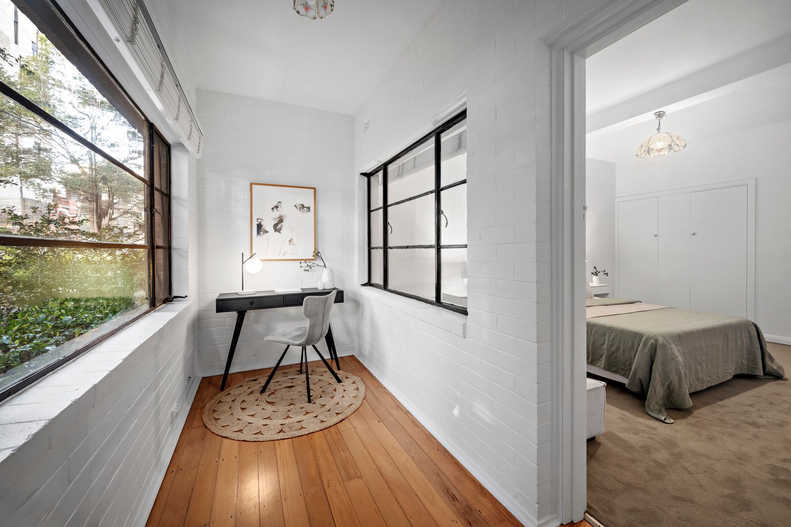 An exceedingly rare discovery on the city’s thriving southern fringe, this tastefully updated two bedroom plus study apartment enjoys a privileged northern orientation within the circa-1930s Art Deco ‘Glen Eagles’ building. Securely accessed via Beatrice Street and with the extraordinary prize of its own gated lock-up garage that is accessed effortlessly via Queens Lane, the home offers a surprising sense of sanctuary, well removed from Queens Road and within immaculately tended gardens that directly overlook Albert Park parkland.
