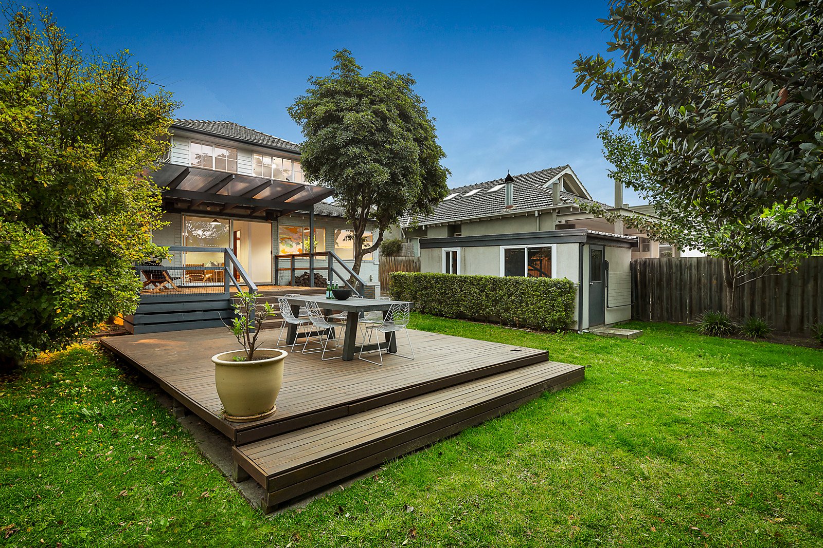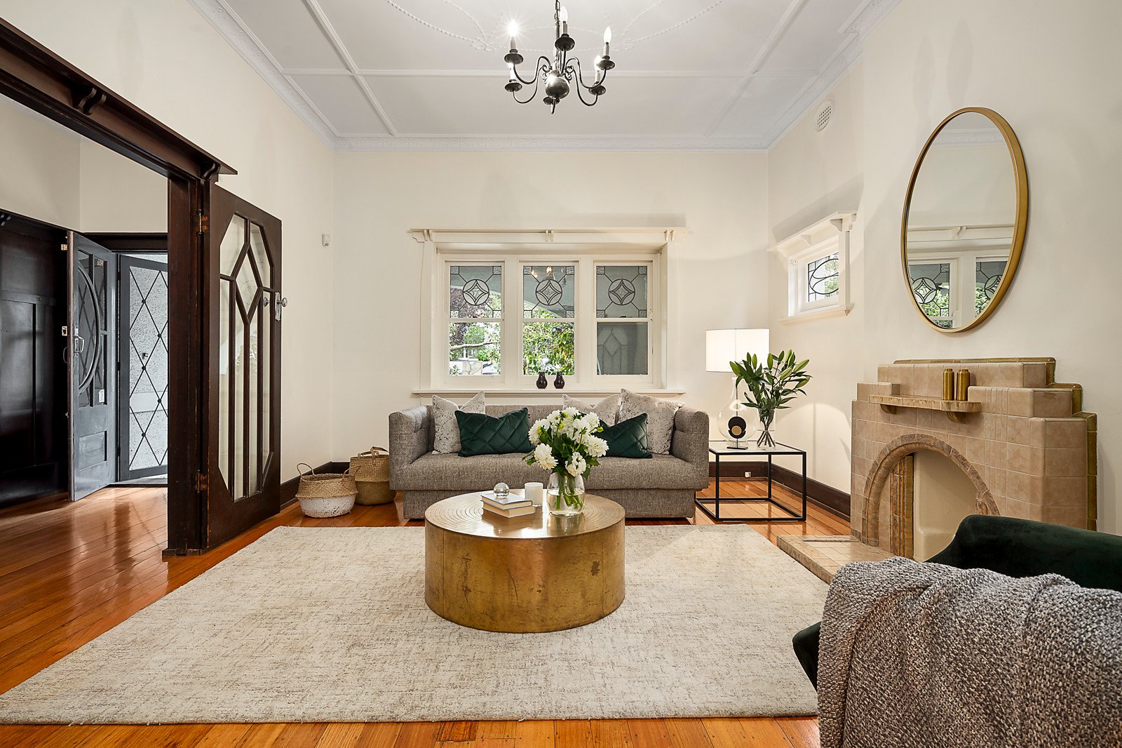 Generous proportions, ornate ceilings and timber floors highlight the period allure in the wide central hall and the gracious sitting and formal dining rooms both with original marble tiled Deco fireplaces. The well-appointed kitchen and light-filled living and dining room open to large entertaining decks and the deep private north-facing garden. Two double bedrooms with robes and a bathroom are downstairs while a spacious children's zone upstairs comprises two additional bedrooms with a shared en suite and a retreat.