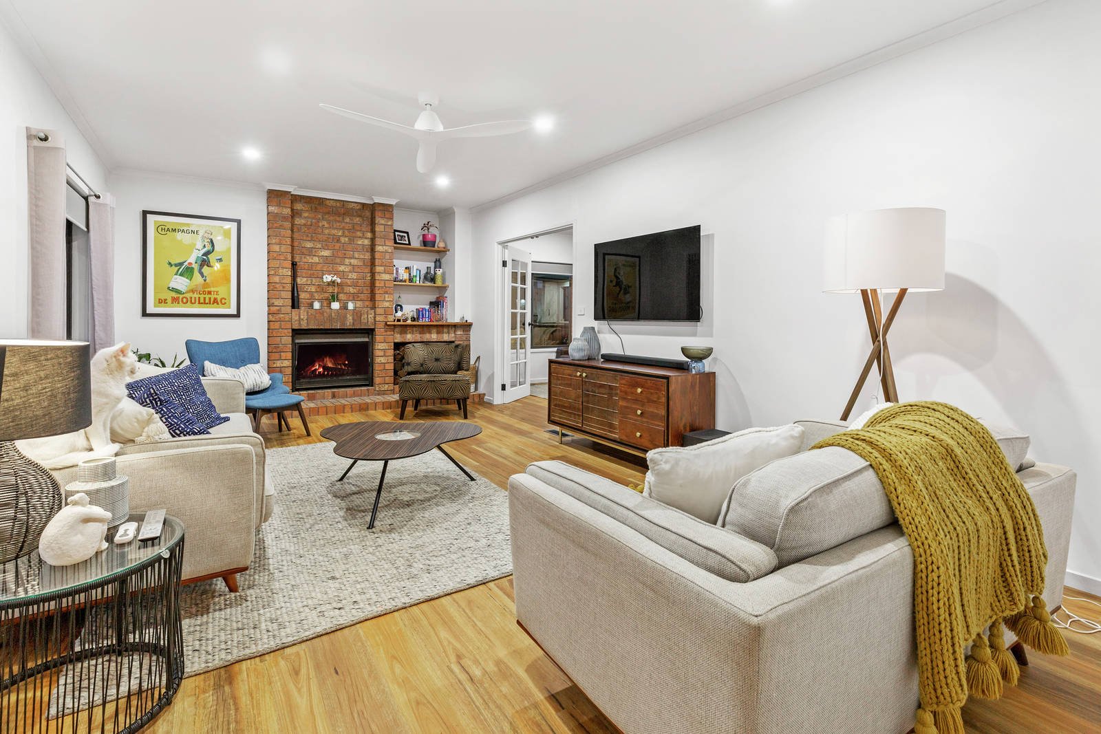 Freshly landscaped gardens with a sparkling inground pool surround the single-level design, complemented inside by a light drenched family/dining room and a formal lounge that invites you to relax and unwind by the brick open fireplace after a long day.