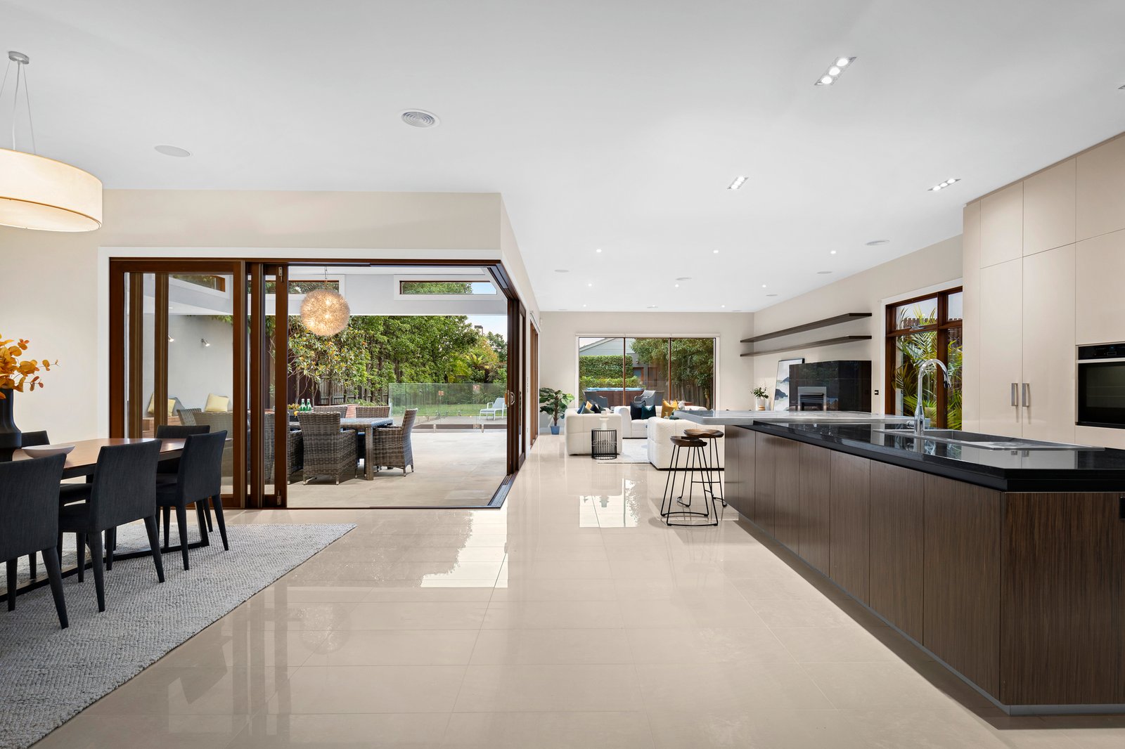 Heading the open-plan zone, the gourmet chef's kitchen has natural stone countertops plus a stainless-steel workbench and is fitted with Neff double ovens, a Miele gas cooktop and integrated fridge/freezer. Receiving plenty of northerly light, with sliding glass doors opening out on two sides, the living/dining area with gas log fire, seamlessly connects to the undercover alfresco zone, inviting all-weather indoor/outdoor free-flowing entertaining. The outdoor kitchen has a barbecue, hot/cold taps and sink, and a drinks fridge, while additional outdoor amenities include an expansive decked area with a lap pool and hot-tub spa, an outdoor shower and pool bathroom/changing pavilion, plus a good-sized lawn area all privately encased in lovely established gardens.