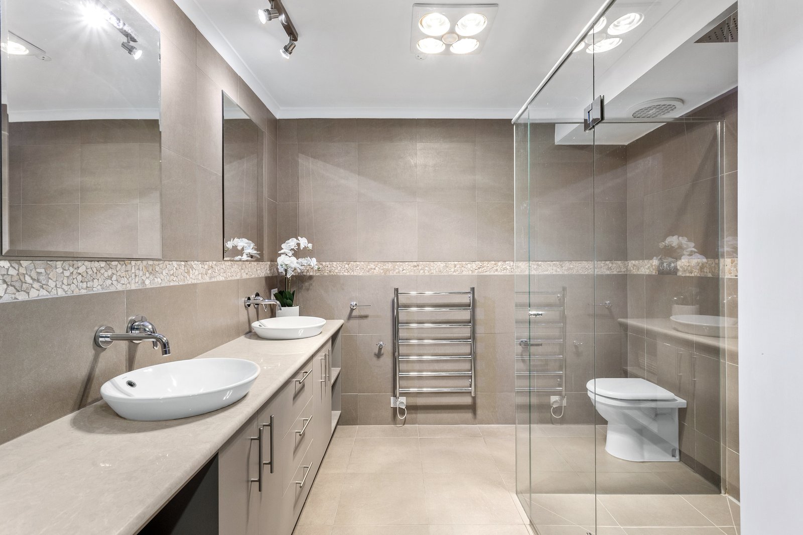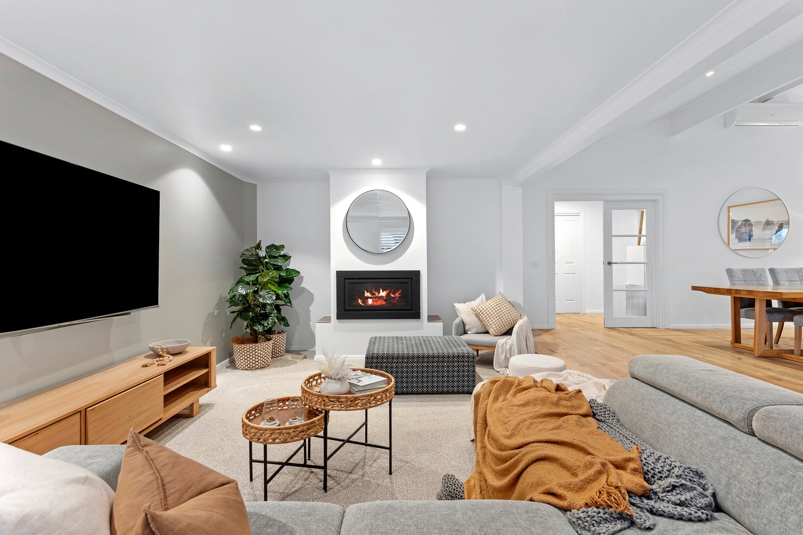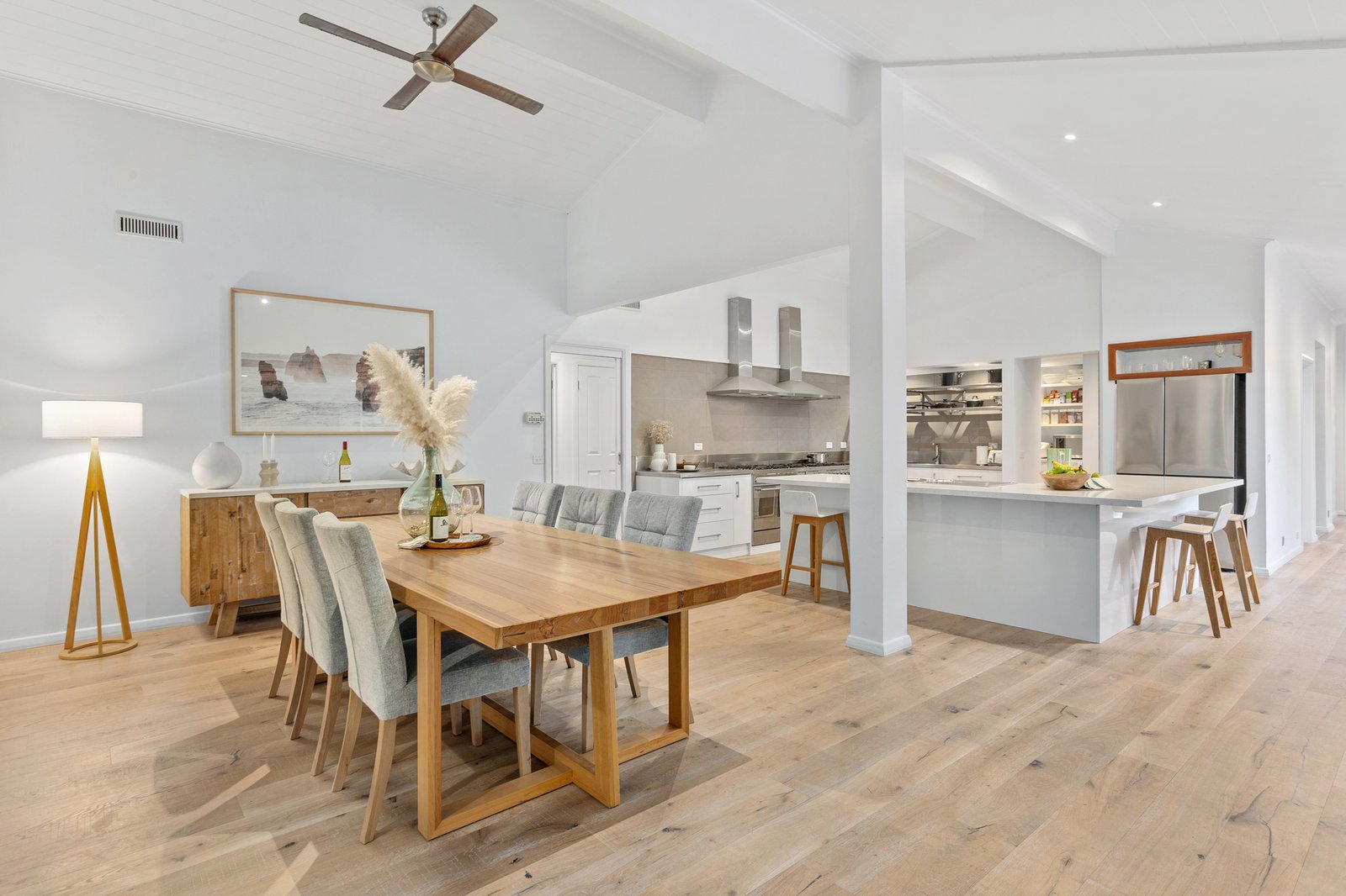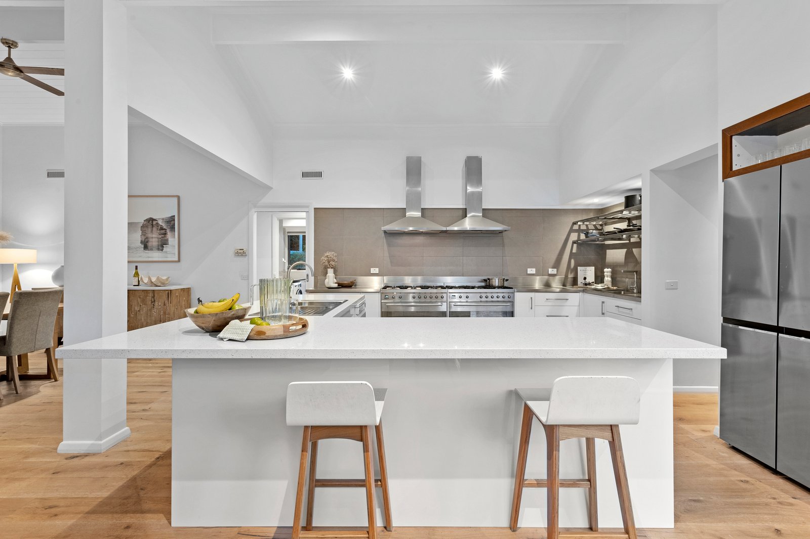 Set over a generous single-level layout with high-raked ceilings that maximise the light throughout, it's an oasis of style and substance, with a calming coastal exterior welcoming you into interiors fuelled by natural light and a flawless alfresco connection. Open-plan living and dining areas connect seamlessly at the home's heart, anchored by a chef-worthy kitchen featuring two 900mm Smeg stoves, a butler's pantry, and sleek stone benchtops. The sunken lounge, adorned with premium carpet and a gas log fire, is designed for ultimate relaxation, whilst sliding doors reveal the front-facing deck, an idyllic spot for basking in the sun. In the back, a sensational entertainer's oasis unfolds into the perfect year-round base, fully integrated with a BBQ kitchen, towering pergola and fully automated salt chlorinated solar-heated pool.