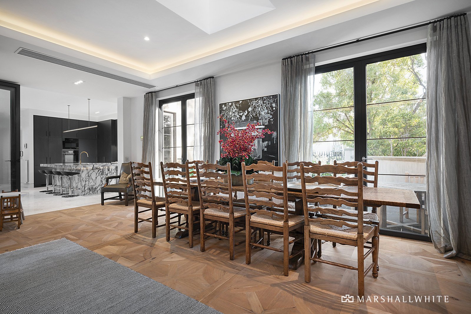 As you enter the home, you'll immediately be impressed by the grandeur and quality of the interiors. The open-plan living and dining area creates a warm and welcoming atmosphere. The modern kitchen features high-end appliances, plenty of storage space and a large island bench.