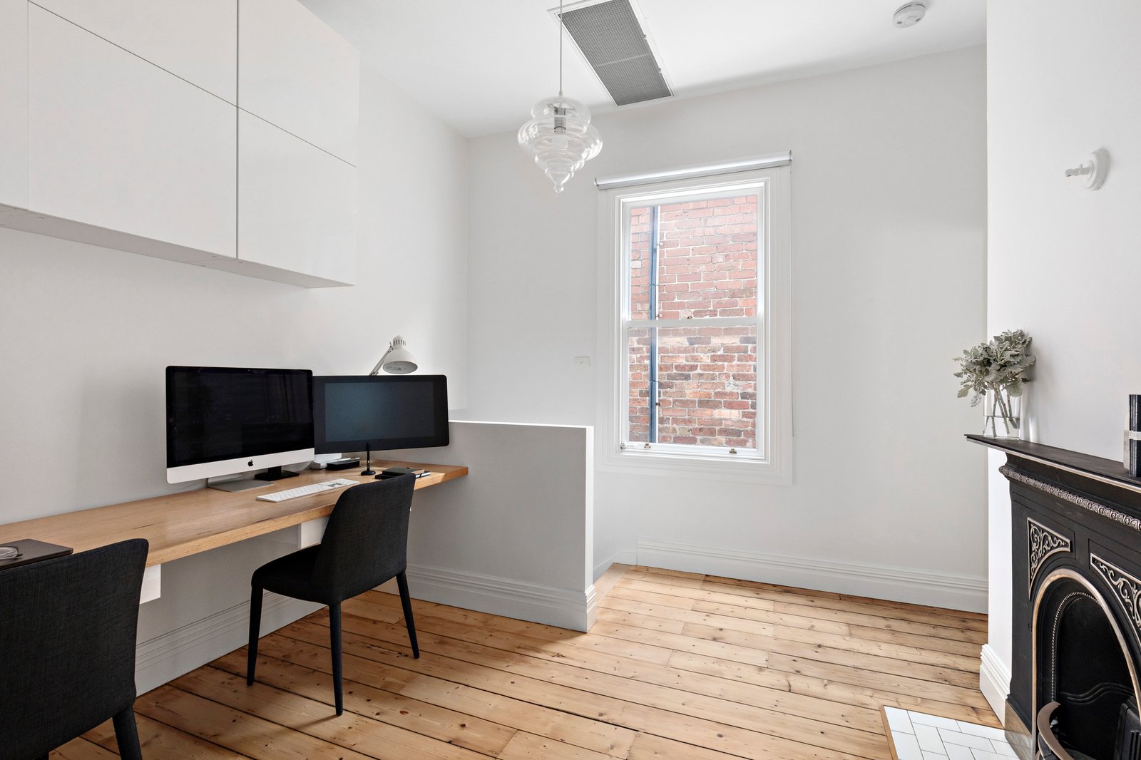 A tessellated-tile verandah and established garden introduce a wide, arched hallway, creating a layout of distinct living zones filled with natural light and focused on flexibility. Vaulted sky-lit ceilings soar above the rear open-plan living and dining domain, supported by a marble-finished kitchen with Miele induction cooking, an Asko dishwasher and integrated refrigeration. Bi-fold doors open to the expansive L-shaped backyard, where greenery provides privacy and shade, accentuating the incredible serenity that allows for outdoor living, entertaining or something more substantial over time. At the front of the home, a formal sitting room or bedroom with original fireplace and period detailing sits alongside a second ground-floor bedroom and bathroom/laundry. Upstairs, two robed bedrooms with en-suite bathrooms include the main suite, which takes in city glimpses from the balcony and is complemented by a skylit ensuite and a light-filled study or sitting room with its own fireplace.
