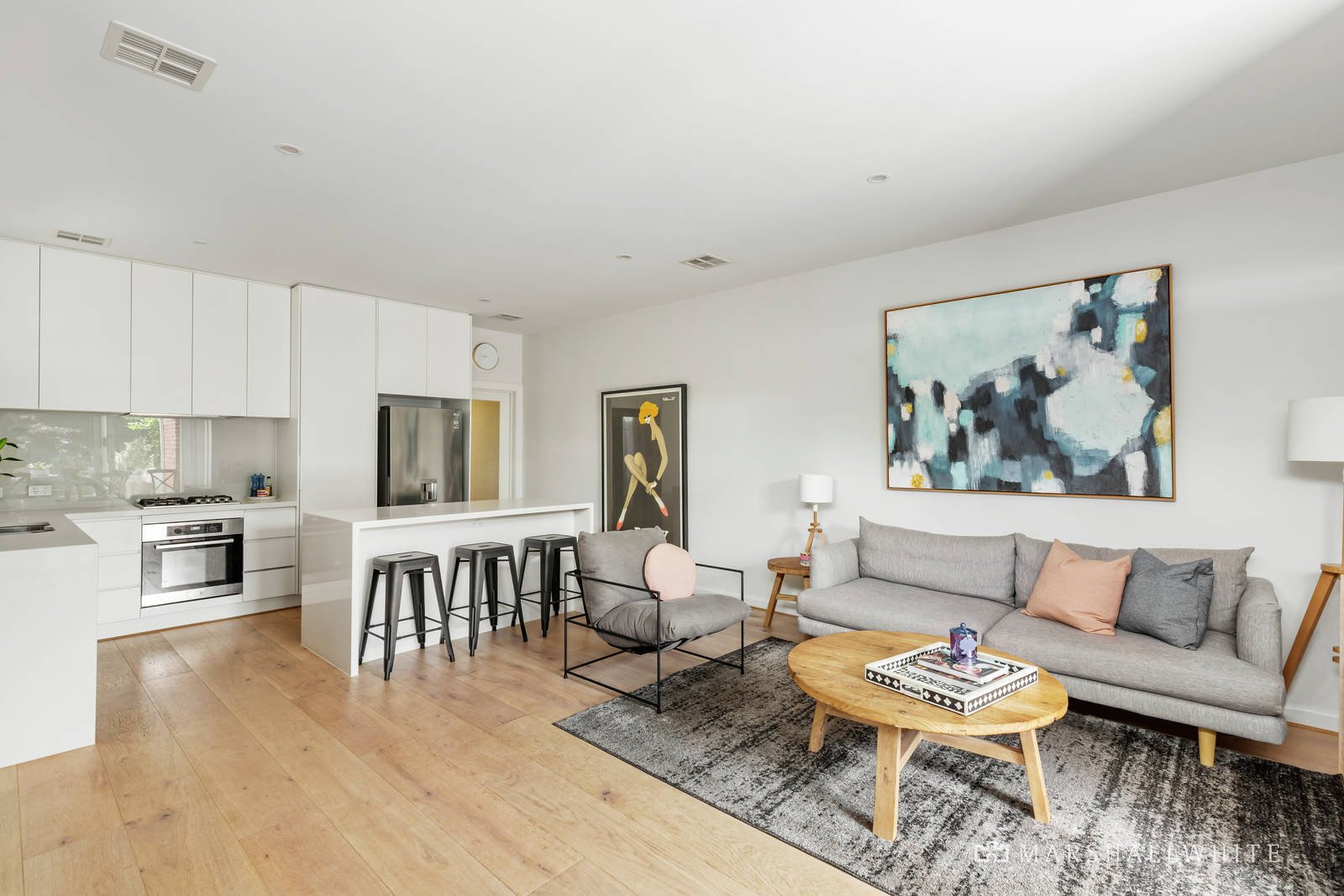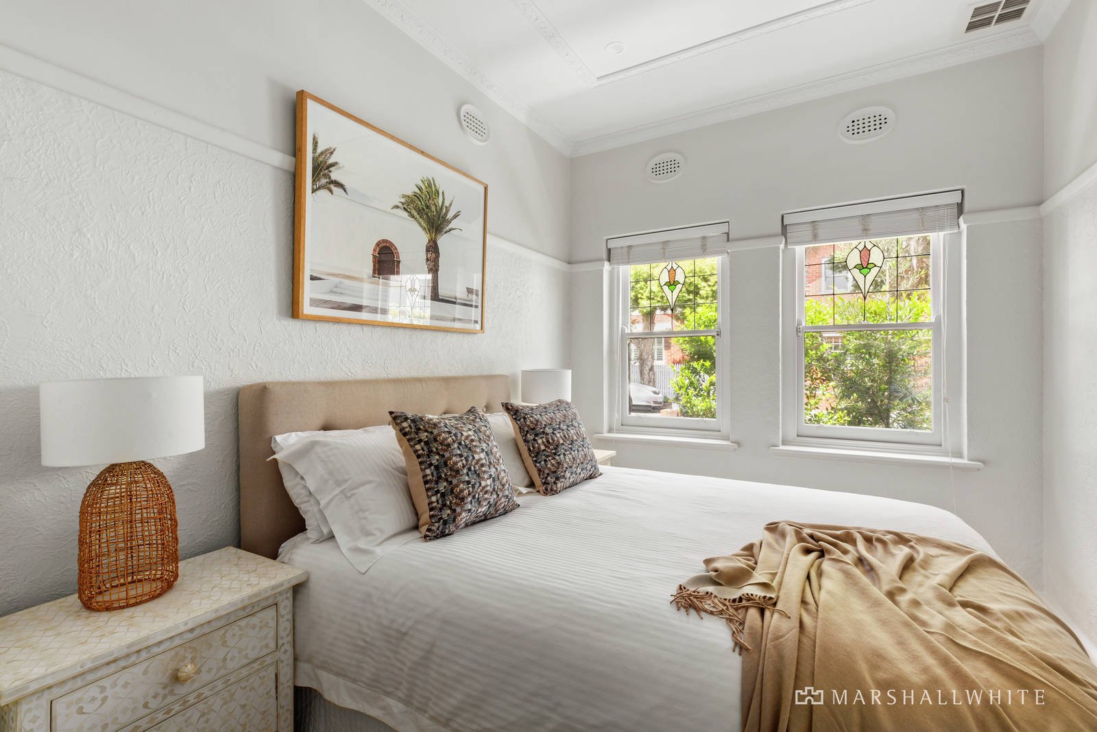 Ornate plaster ceilings and leadlight windows highlight the period charm whilst wide oak floorboards add refinement to the entrance hall which flows through to two gorgeous double bedrooms and a chic bathroom. Northern light streams through to the sleek gourmet kitchen boasting European appliances and stone bench tops and the generous open-plan living & dining room. Large glass sliders extend the living and entertaining options out to a private landscaped north-facing garden surrounded by leafy garden beds.
