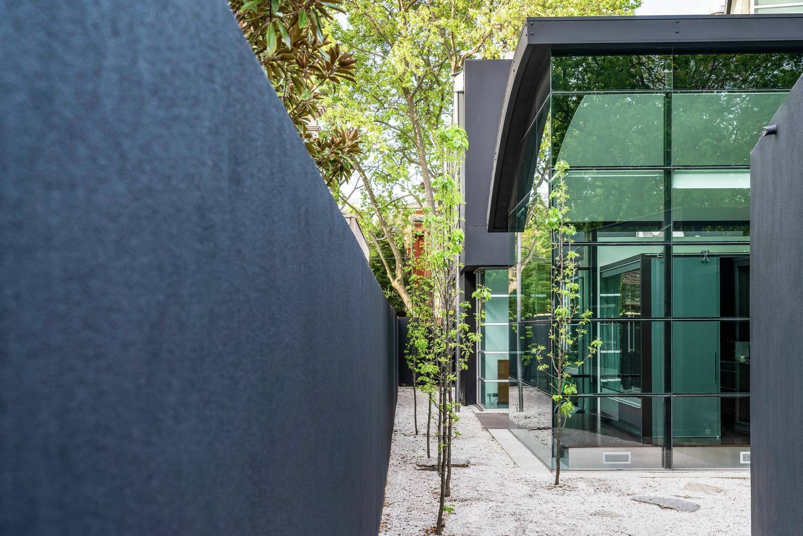 Come through the large pivot front door and enter the guest area: a sitting room with a wood-burning fireplace and access to exterior space, adjacent to a serene formal dining room with a view of miniature maples. Pass a large pocket door into the generous kitchen and family area, with fitted-out large home office and additional three bedrooms at back. Up a stunning staircase is a private master sanctuary with a sitting area, a sleeping area, a three-way fireplace, a romantic Jacuzzi, a balcony, and a large dressing area that integrates ample storage, including his and hers shoe cupboards.