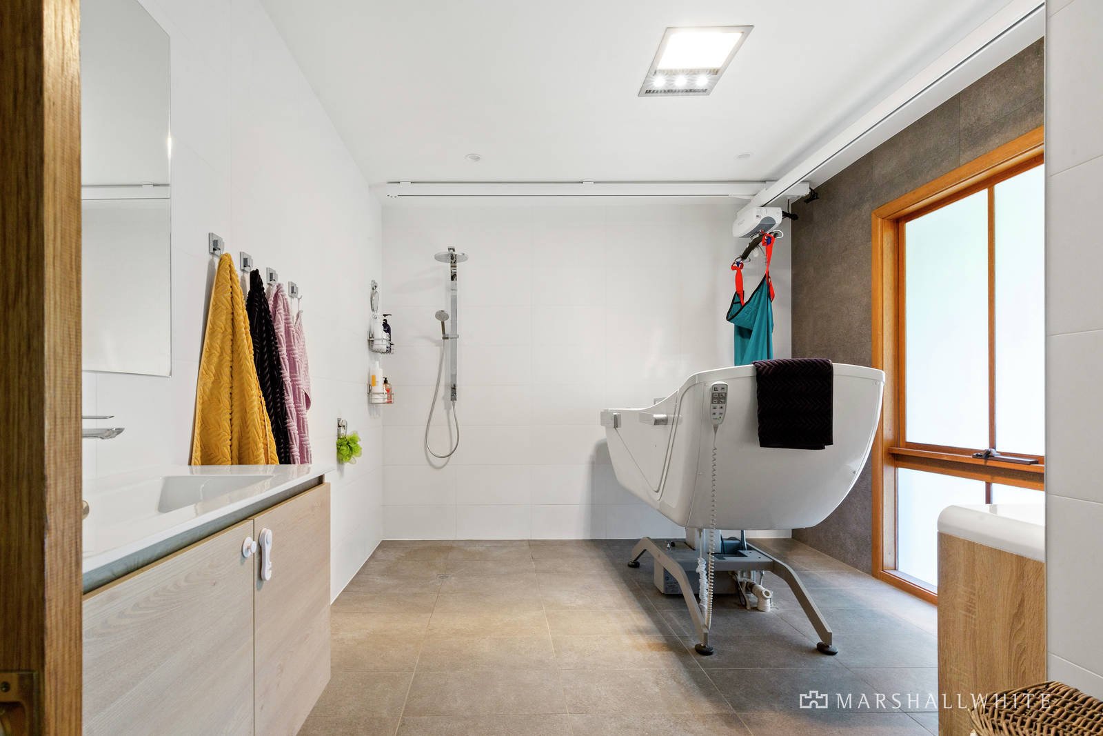 Custom designed to accommodate disability living, the home's considerations include immediate ramp access, whilst extra-wide doorways confirm functionality across the floor plan. A purpose-built wet room adjoins a secondary bedroom, where ceiling tracking and hoist ensure easy access to the high-low bath and open shower. The salt-chlorinated solar and gas heated pool and spa comes complete with hoist, offering access for exercise or enjoyment.