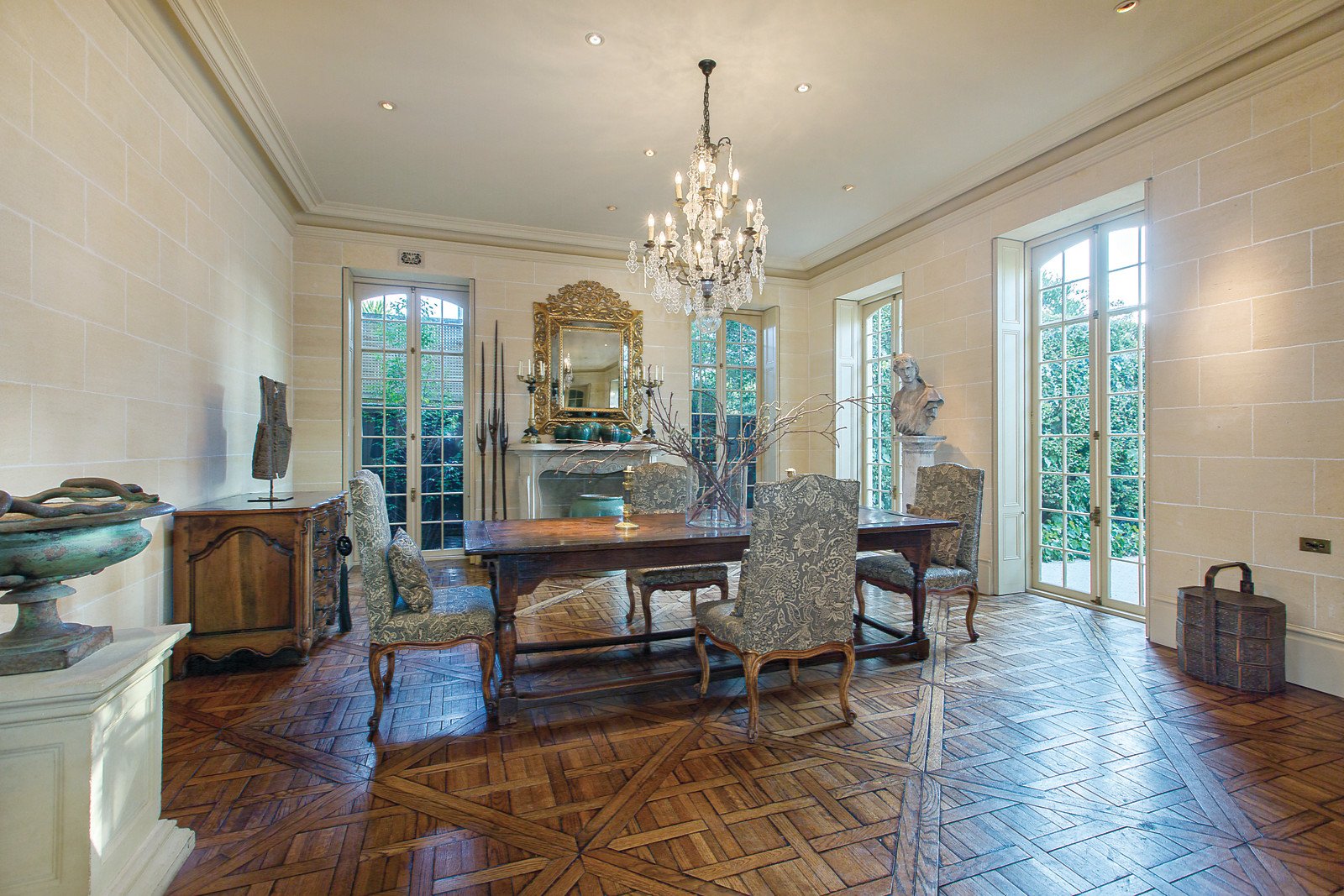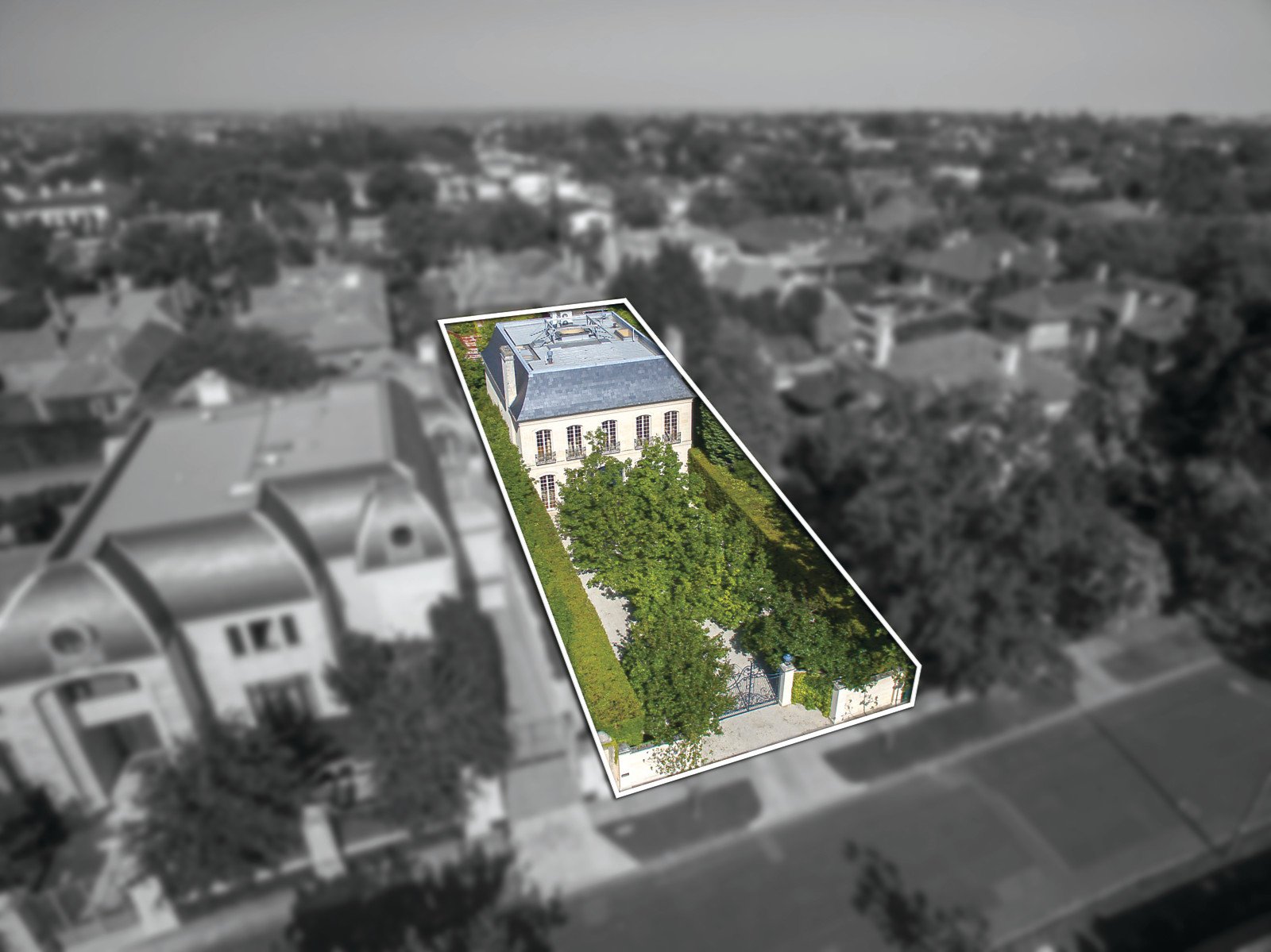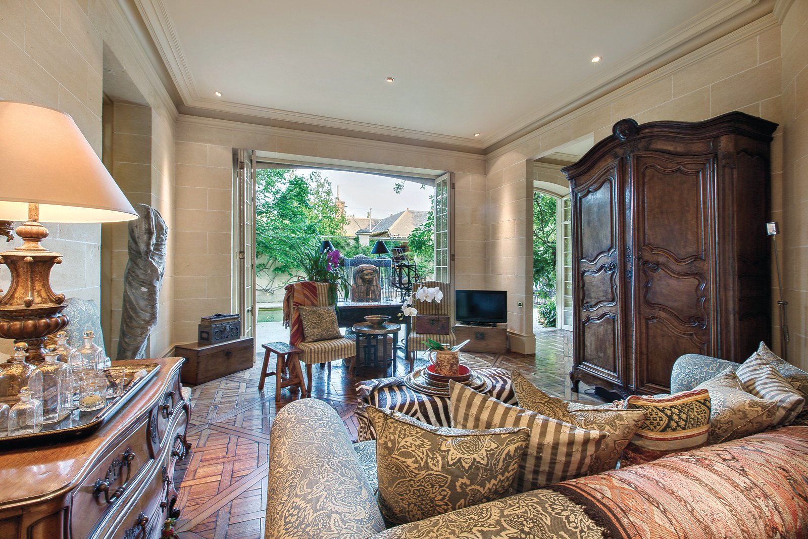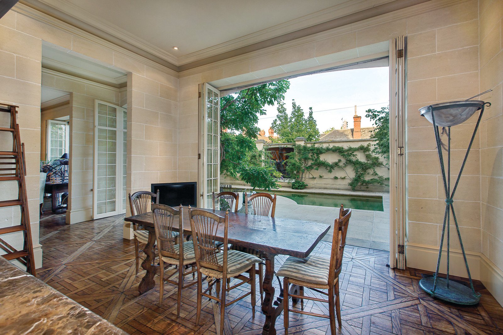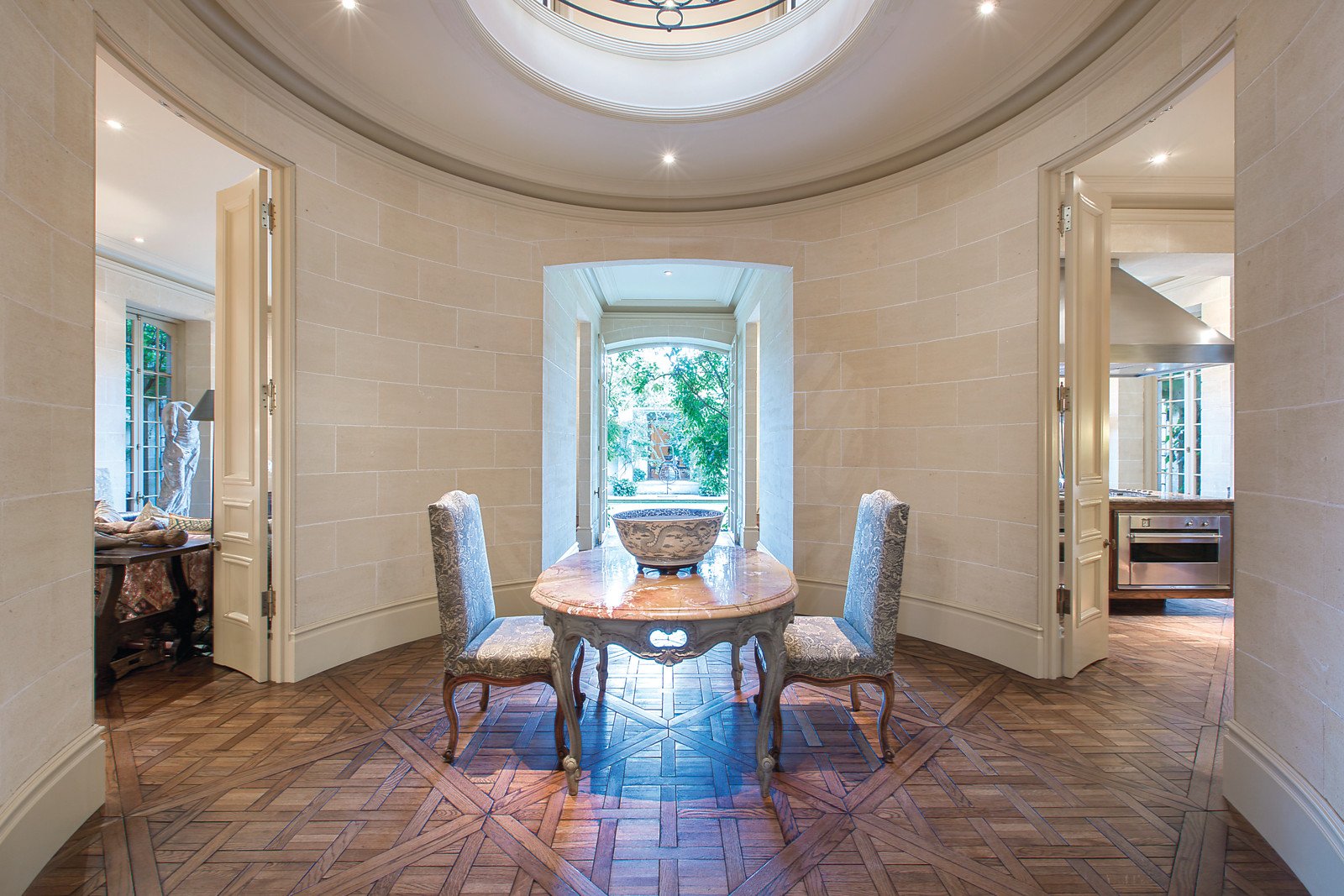 A formal park-style garden of Red Oak trees that change colour with the seasons provides both an evocative entrance and wonderful privacy. The remarkable attention to detail and uncompromised level of finish is evidenced by the Versailles pattern oak parquetry floors, soaring 3.5 metre ceilings, solid Limestone walls and authentic quality fixtures throughout. Purpose built for entertaining and relaxed living, the tasteful formal sitting and dining room creates a perfect banquet hall with antique Limestone fireplaces at each end and French doors opening to the garden. At the centre of the house, a circular vestibule beneath a dramatic 10 metre sky-lit void provides a more intimate dining space. A generously proportioned informal living room and separate casual dining room both open to a private paved northeast garden with heated pool and full width sun-awning. The French inspired kitchen is focused around an antique butcher's block. A superbly crafted Oak staircase leads up to a magnificent main bedroom with retreat, Limestone fireplace, concealed TV, walk in robe and Indian slate ensuite. A second double bedroom with stylish ensuite and walk in robe is accompanied by a third double bedroom with built in robe, study or office and a designer bathroom boasting a Neo Classical freestanding marble bath. A brilliantly designed hidden "James Bond-style" driveway leads down to a basement art gallery with capacity for parking 6 cars.