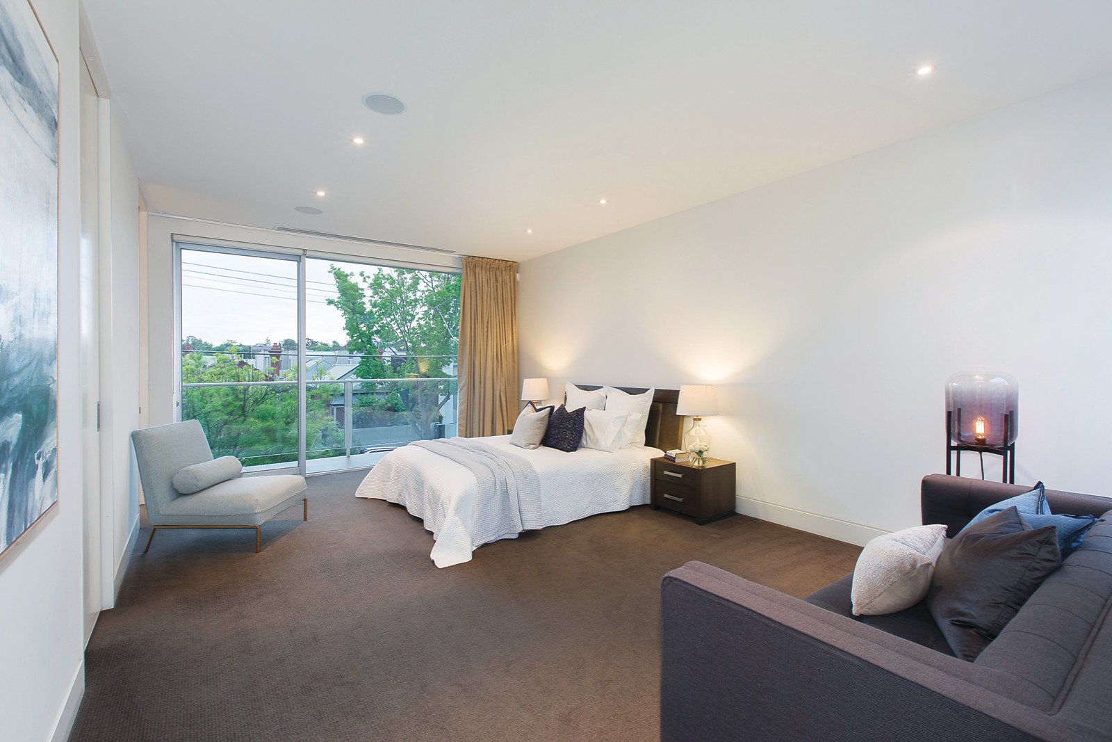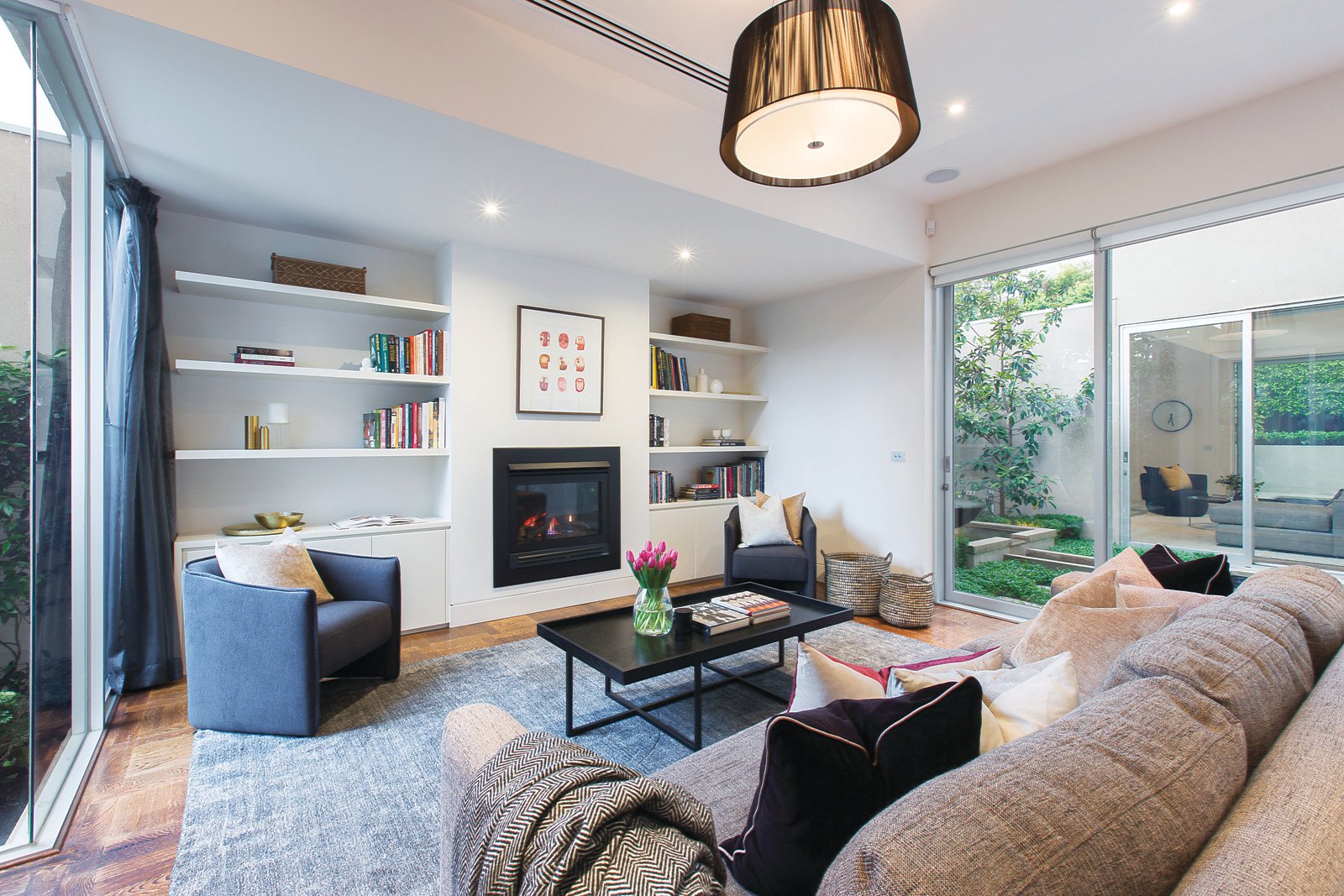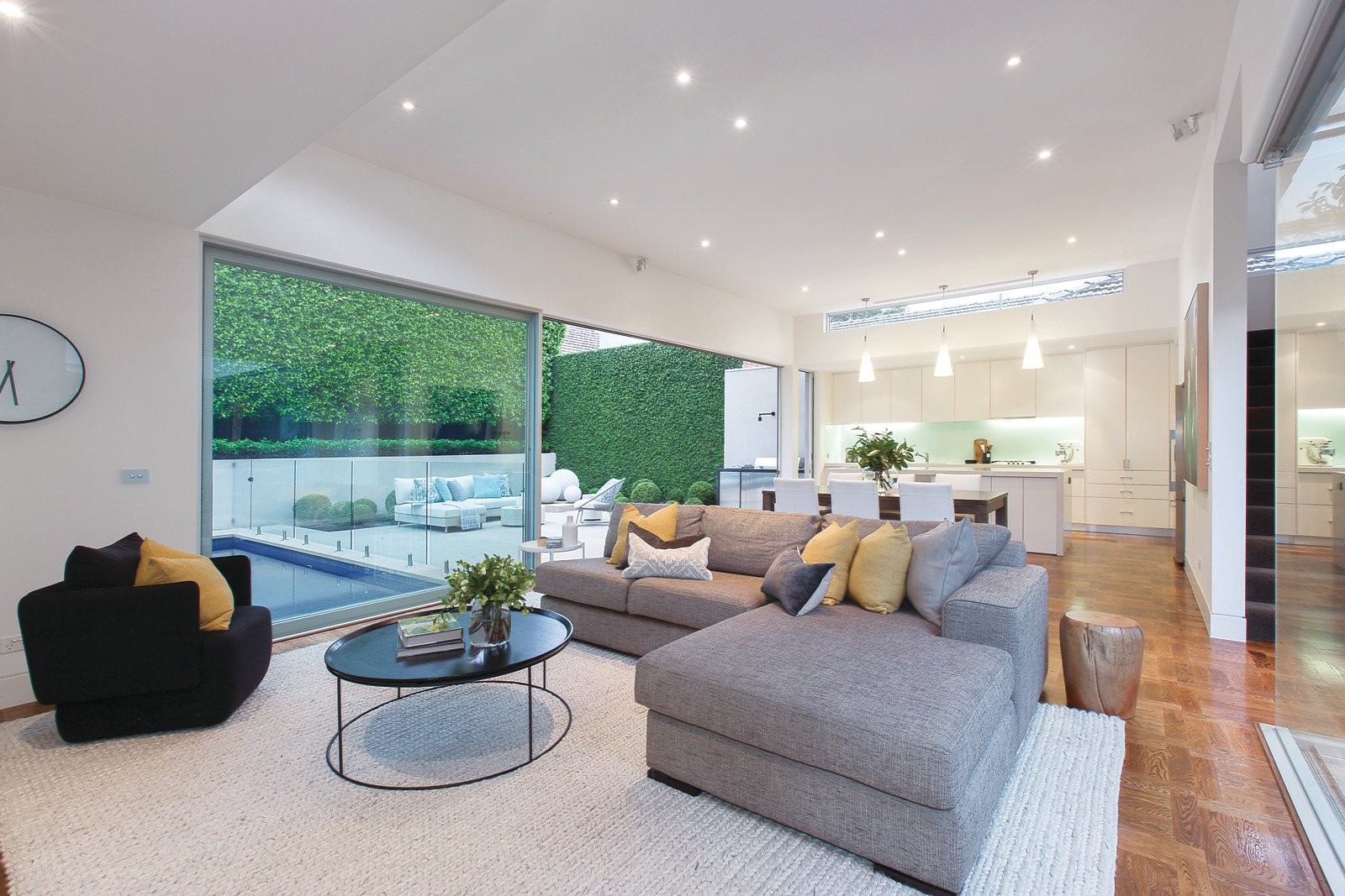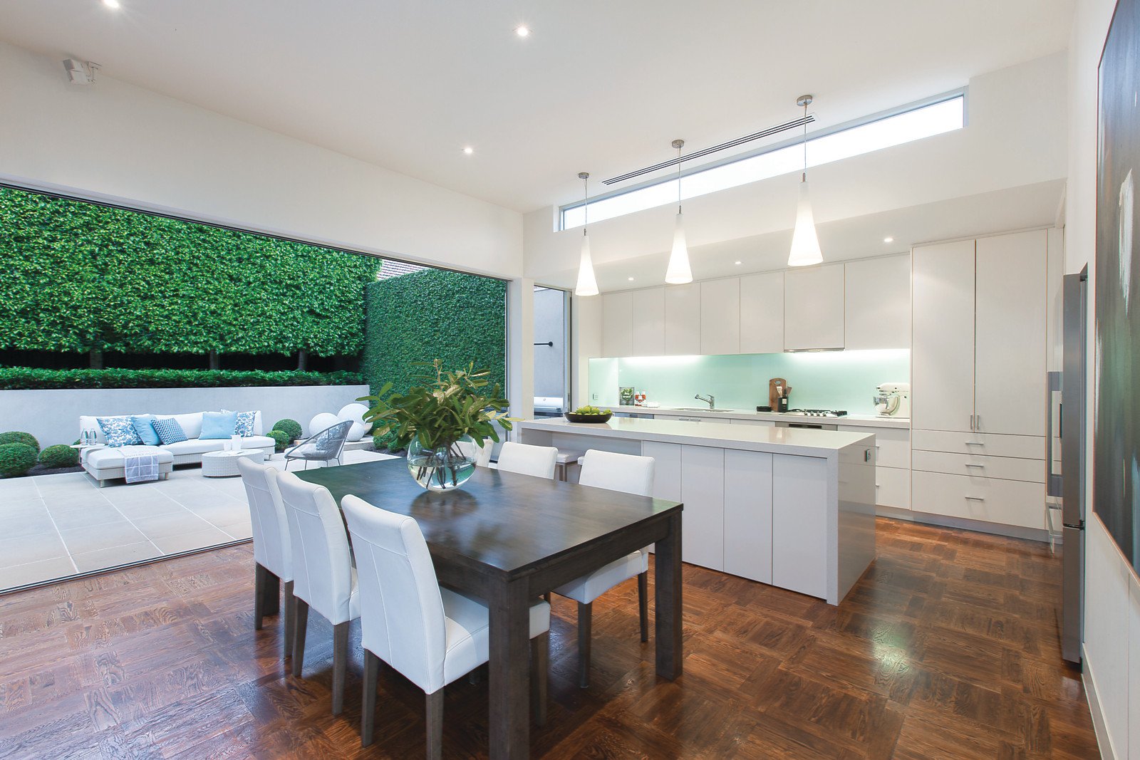 Designed to provide wonderful tranquil garden outlooks from every angle, the captivating interior spaces feature wide picture windows, high ceilings and oak parquetry floors. An inviting sitting room overlooks a serene internal courtyard with water feature and pond while the expansive living and dining room with a gourmet stone Miele kitchen open to the stunning Paul Bangay designed north-facing garden with heated pool and BBQ. Generous, light-filled accommodation upstairs comprises a gorgeous main bedroom with designer en-suite, balcony and walk in robe, two additional double bedrooms with built in robes, desks and a north-facing balcony, stylish bathroom and a study or 4th bedroom.