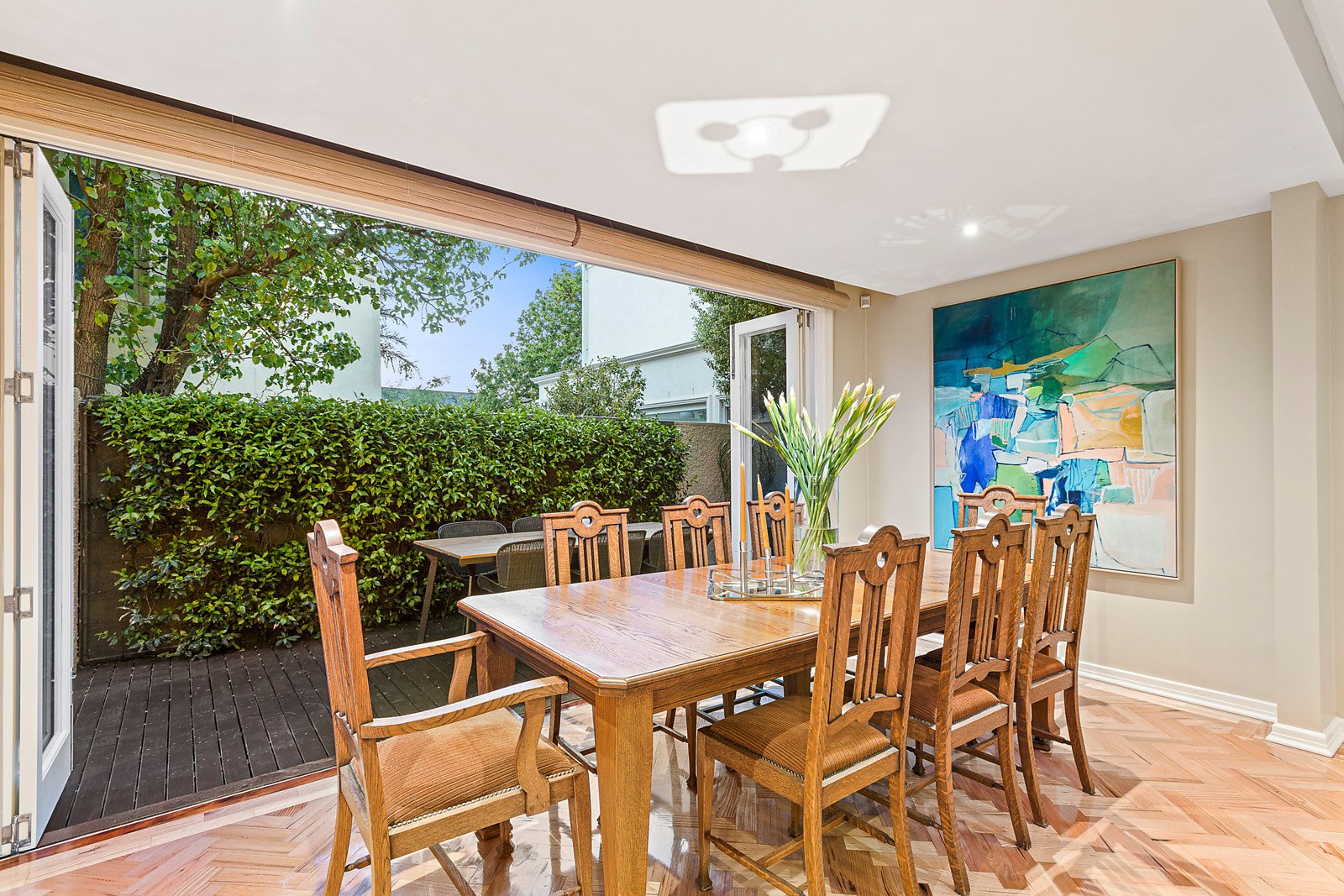 The alluring street presence is matched inside by a wonderful blend of classic features and bespoke finishes. Parquetry floors flow through the entrance hall to a refined sitting room with open fireplace, a lavish state of the art kitchen boasting distinctive stone benches, premium De Dietrich appliances including a steam oven and butler's pantry. The inviting living and dining room with bi-fold doors open completely to a private north-facing decked courtyard oasis. Natural light streams through the glorious main bedroom with walk in robe and designer en suite, two additional bedrooms with built in robes and a stylish bathroom. A large 4th bedroom or retreat with kitchenette adds flexibility.