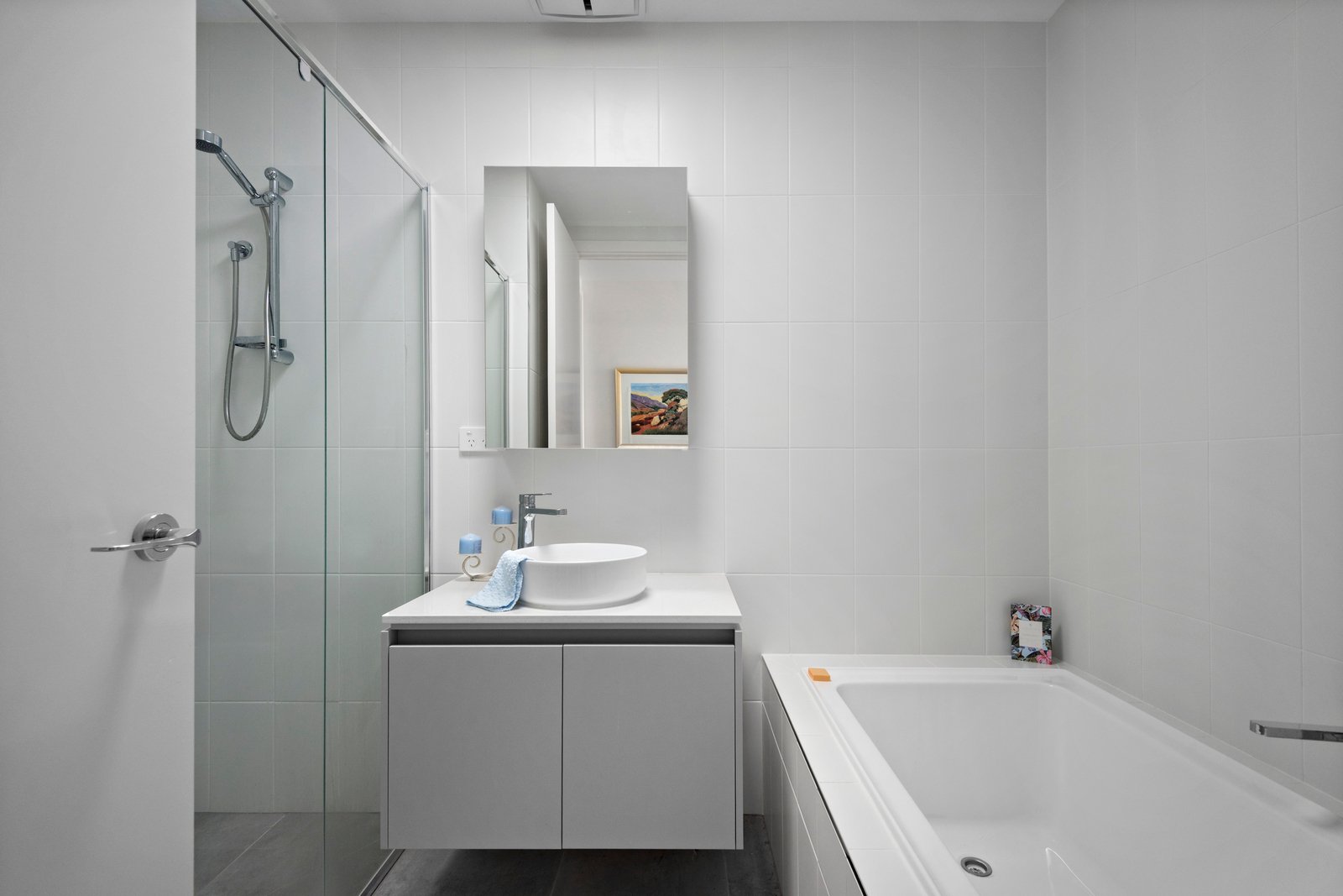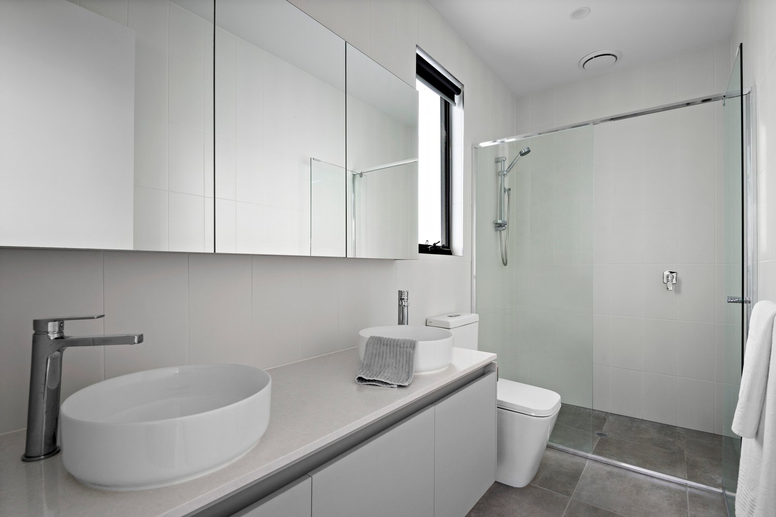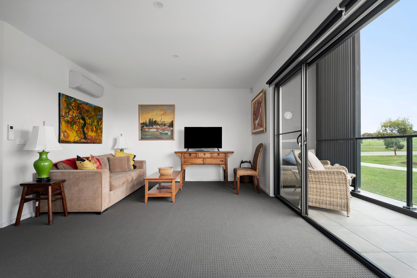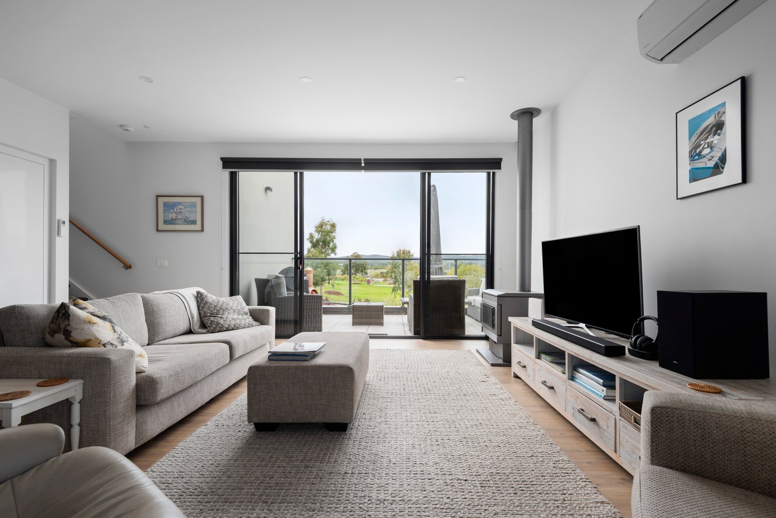 A lift links all three levels, offering a highly practical solution for downsizers who value space without the burden of maintenance, with the main bedroom occupying a serene position on the entry level, complete with a dual-vanity en-suite and a generous walk-in robe. Upstairs, two additional bedrooms each feature mirrored robes, accompanied by a second living room and a bright bathroom with a separate WC, whilst an en-suite guest bedroom on the lower level provides flexibility for visitors or as a dedicated gym or office.