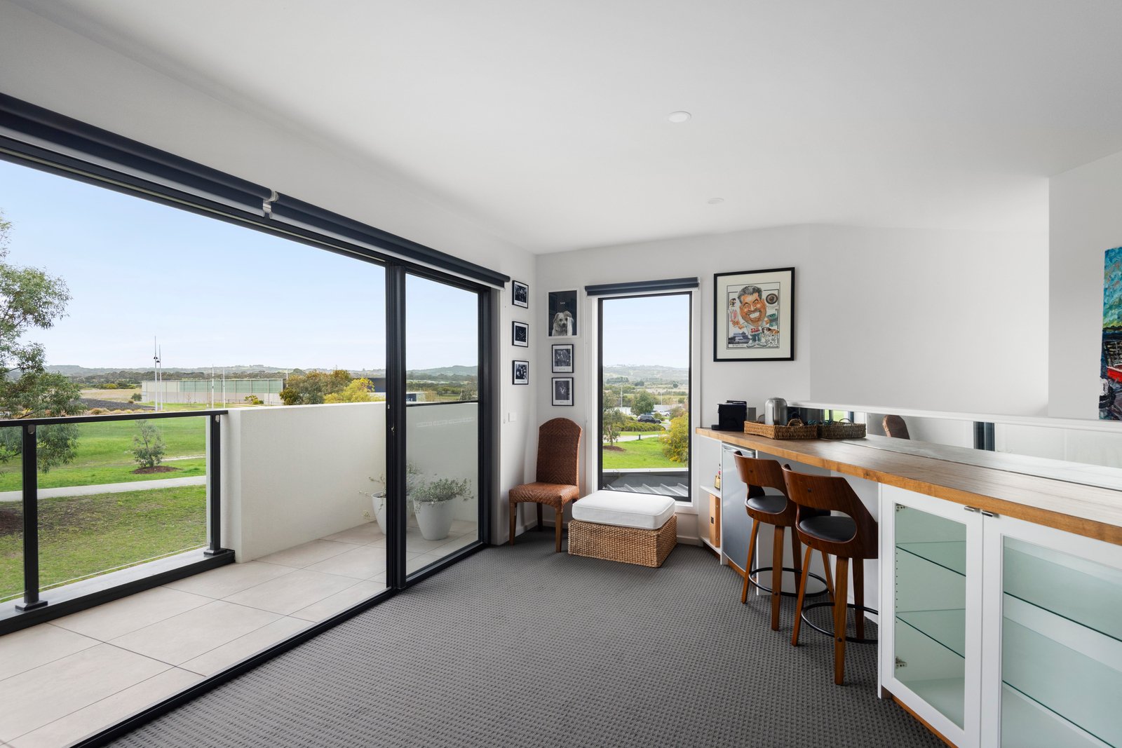 Sleek architecture unfolds over three lift-connected levels, each oriented to capture sweeping views of the adjoining parkland and the boat ramp beyond. The entry foyer introduces timber flooring and an abundance of light through oversized glazing, drawing attention to the outlook while highlighting the crisp stone finishes of the Smeg-appointed kitchen. An island bench sits front and centre, supported by a concealed butler’s pantry, a slow combustion fireplace and sliding glass doors that transition to a broad terrace, where summer evenings play out against a stunning backdrop.