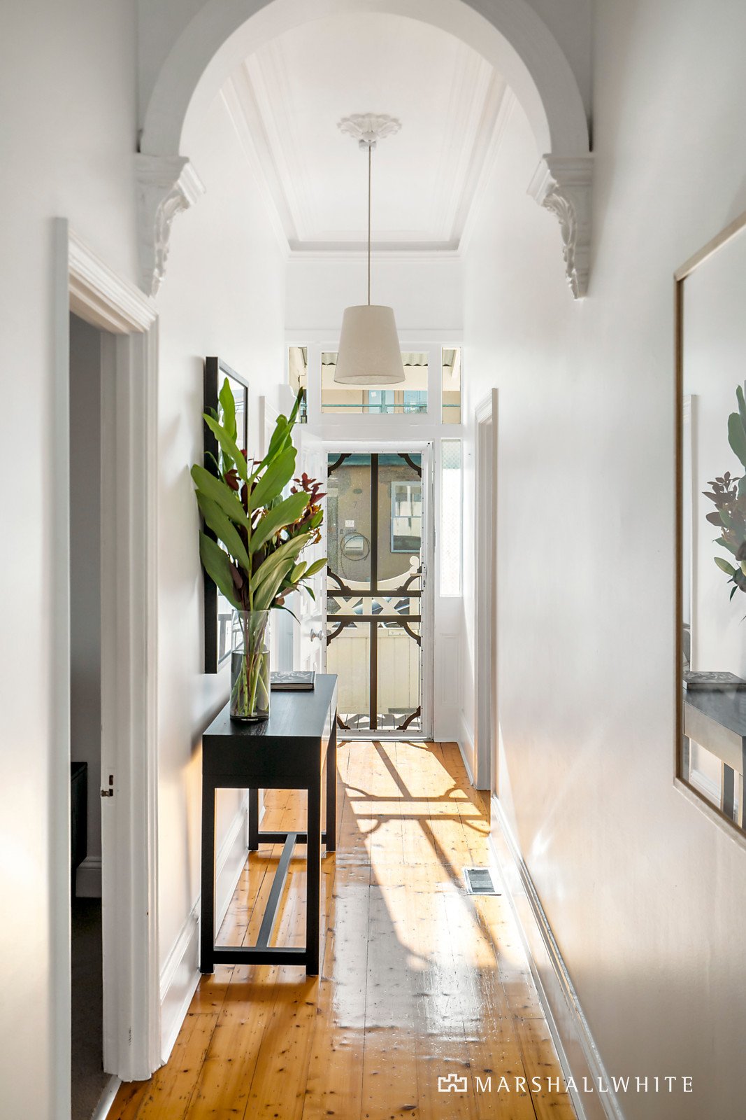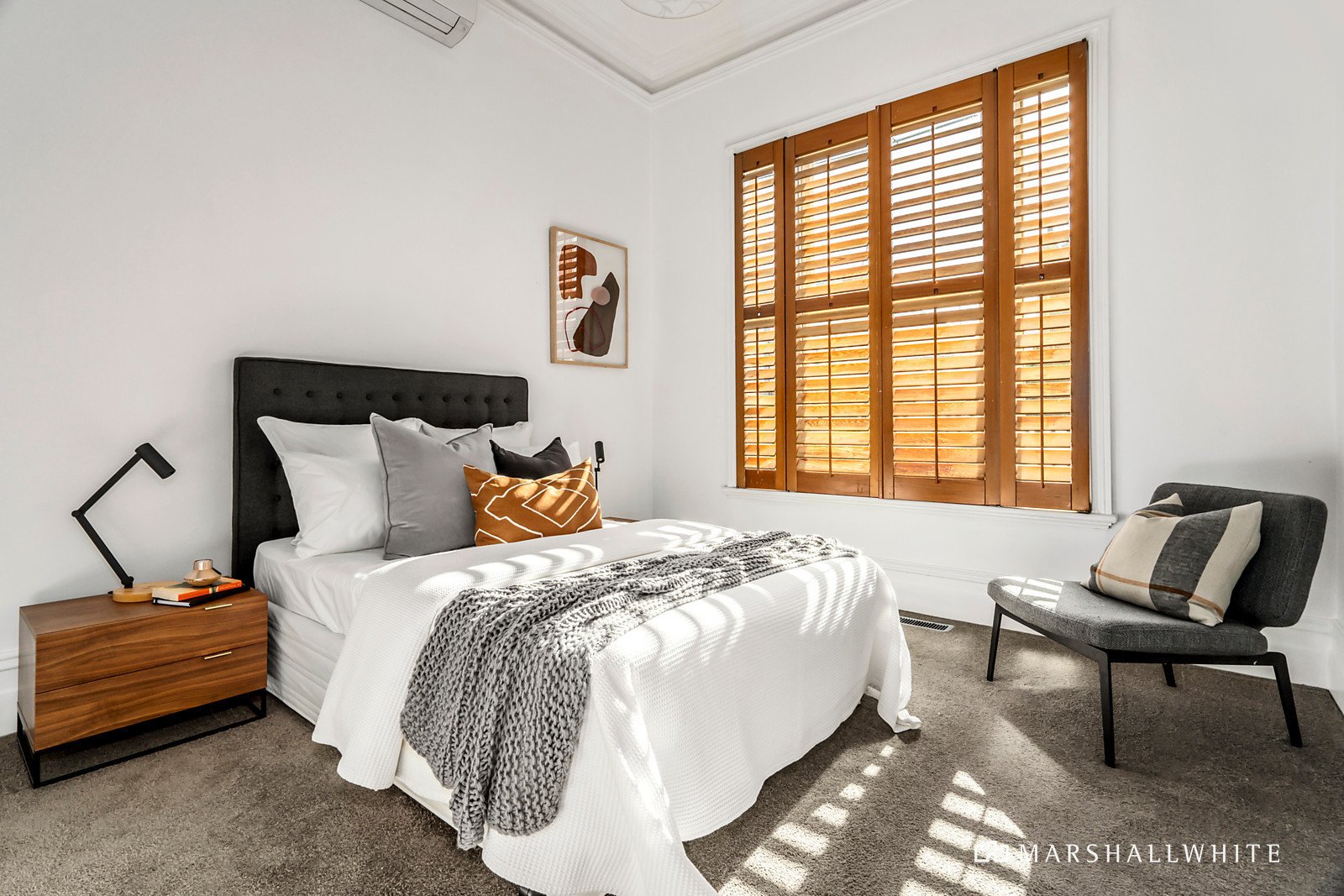 Under soaring ceilings with decorative roses and a hallway arch, the home's bright white colour palate is complemented by Baltic Pine flooring as it culminates in a pristine white kitchen / dining and living warmed by a grand marble fireplace. Effortlessly, the flow continues outdoors to the paved rear courtyard and easy care garden with a substantial shed. Further highlights include built-in robes and plantation shutters in two of the bedrooms, as well as a sparkling bathroom, ducted heating, split system cooling and pedestrian ROW access via the shed.