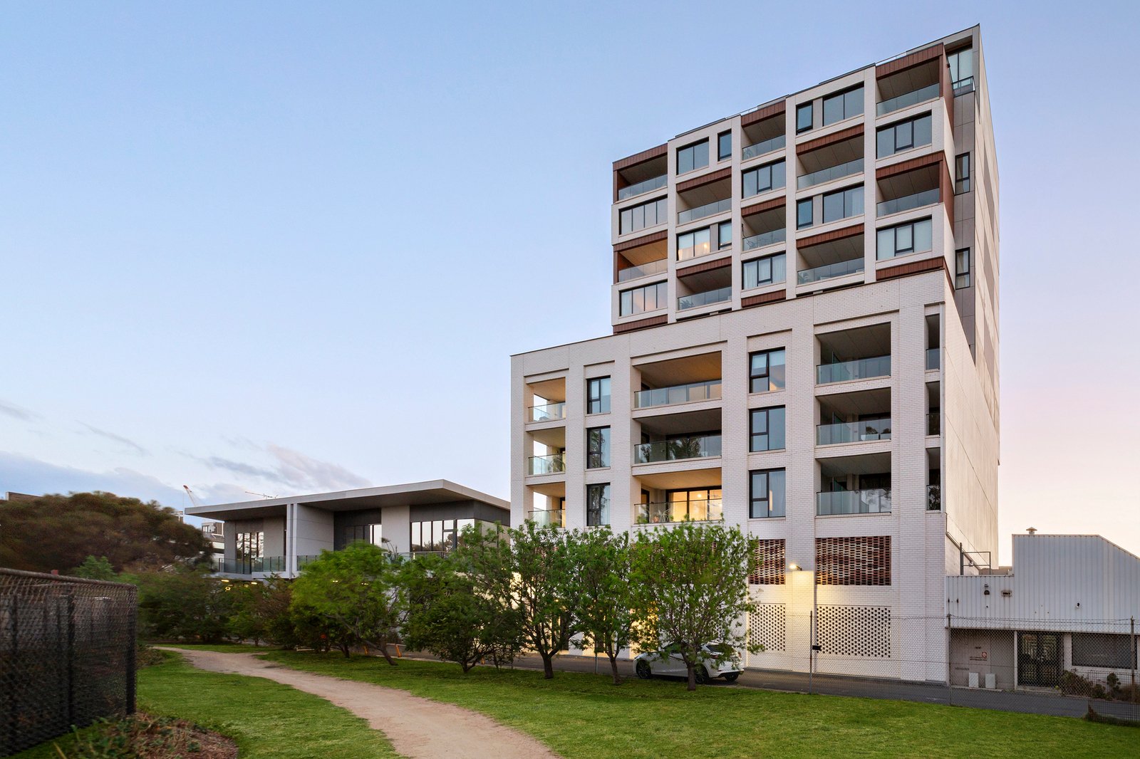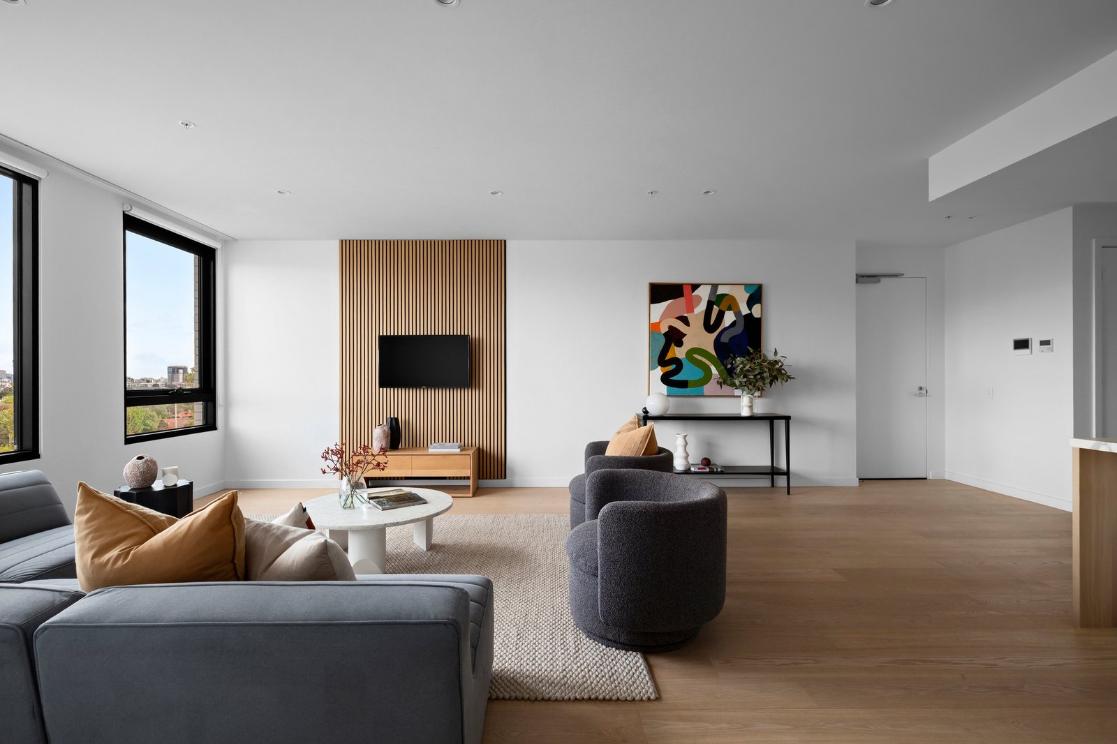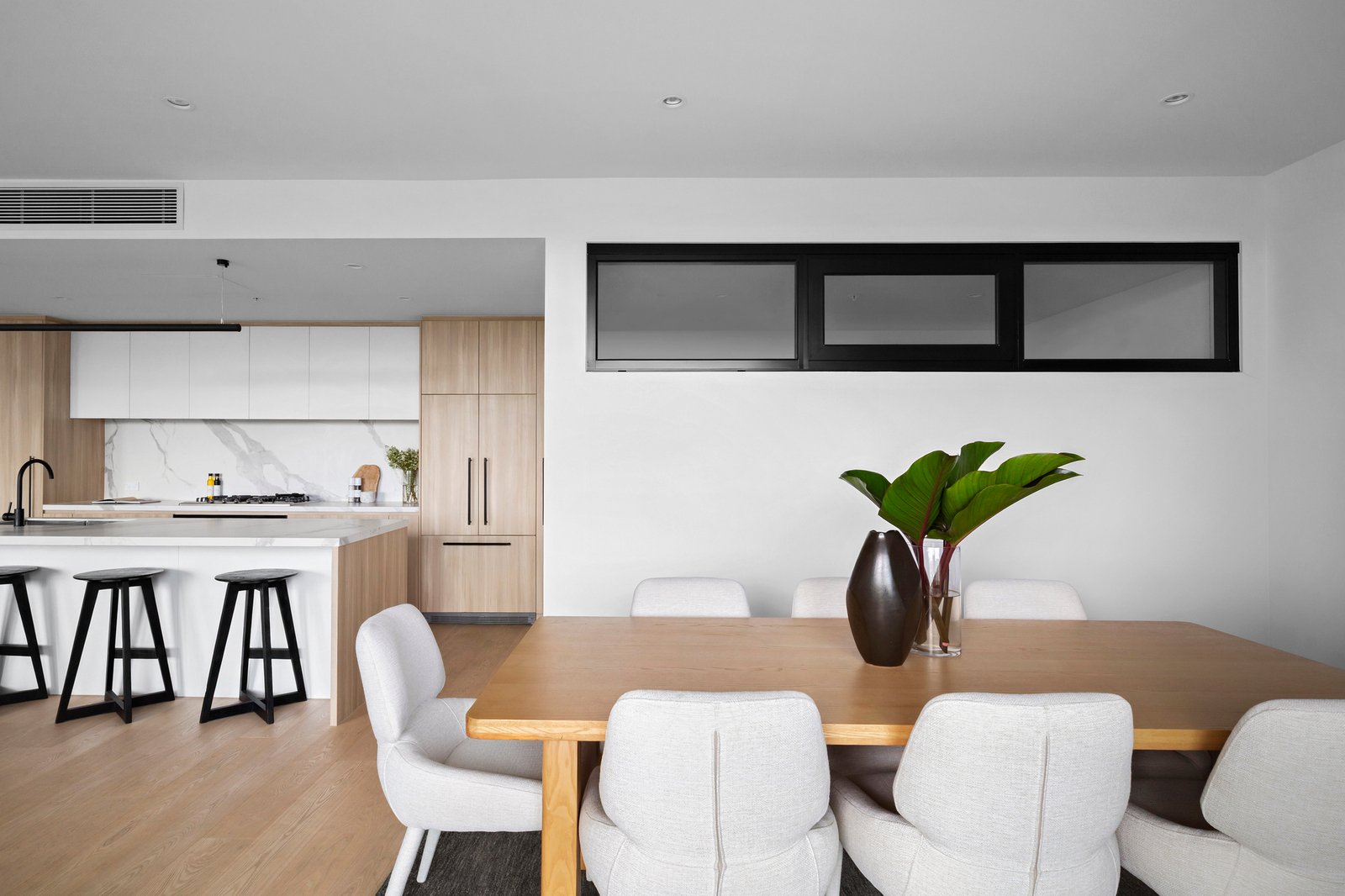 Limited to just twenty-three apartments, with only two on the seventh level, it holds an air of exclusivity above its dynamic surroundings, with Bay Street’s cafés, the beach and city-bound trams and buses all within walking distance. Inside, engineered oak floors and high ceilings create a sense of calm and continuity, extending through substantial open-plan living and dining spaces to the CBD beyond. The undercover terrace invites long lunches and evenings backdropped by the city lights, complemented by a state-of-the-art Miele-appointed kitchen, finished with honed porcelain and oak veneer surfaces.