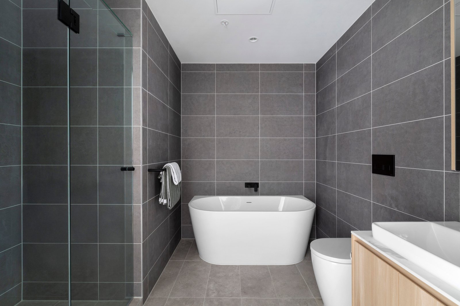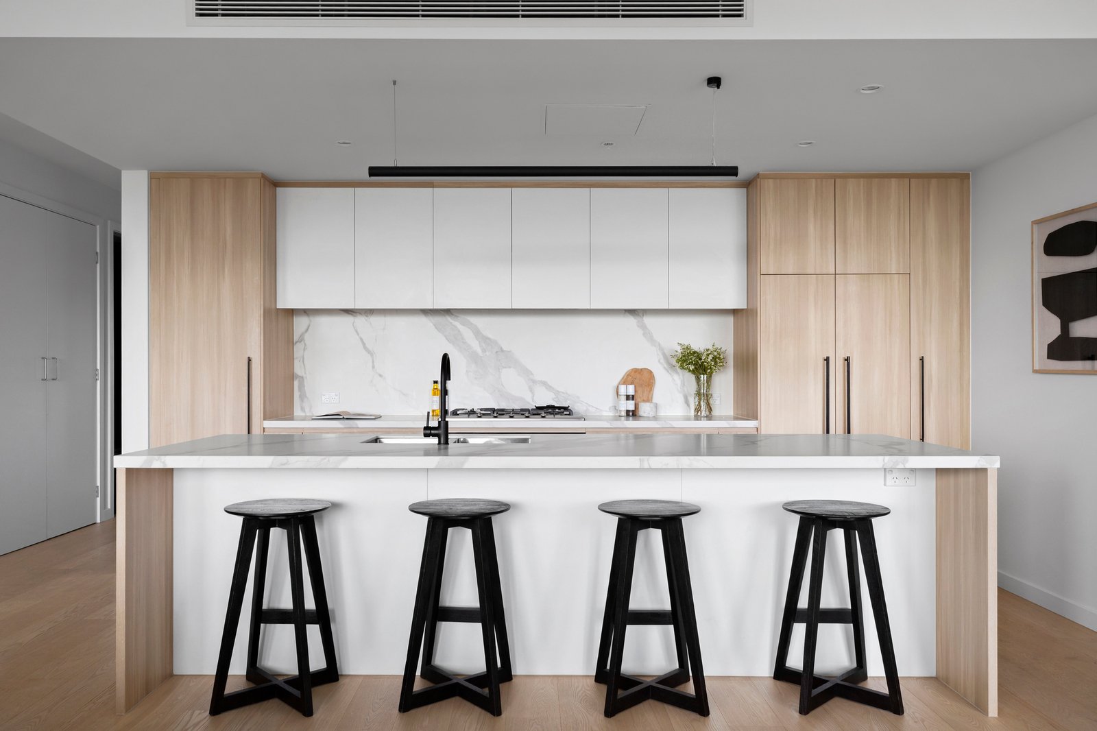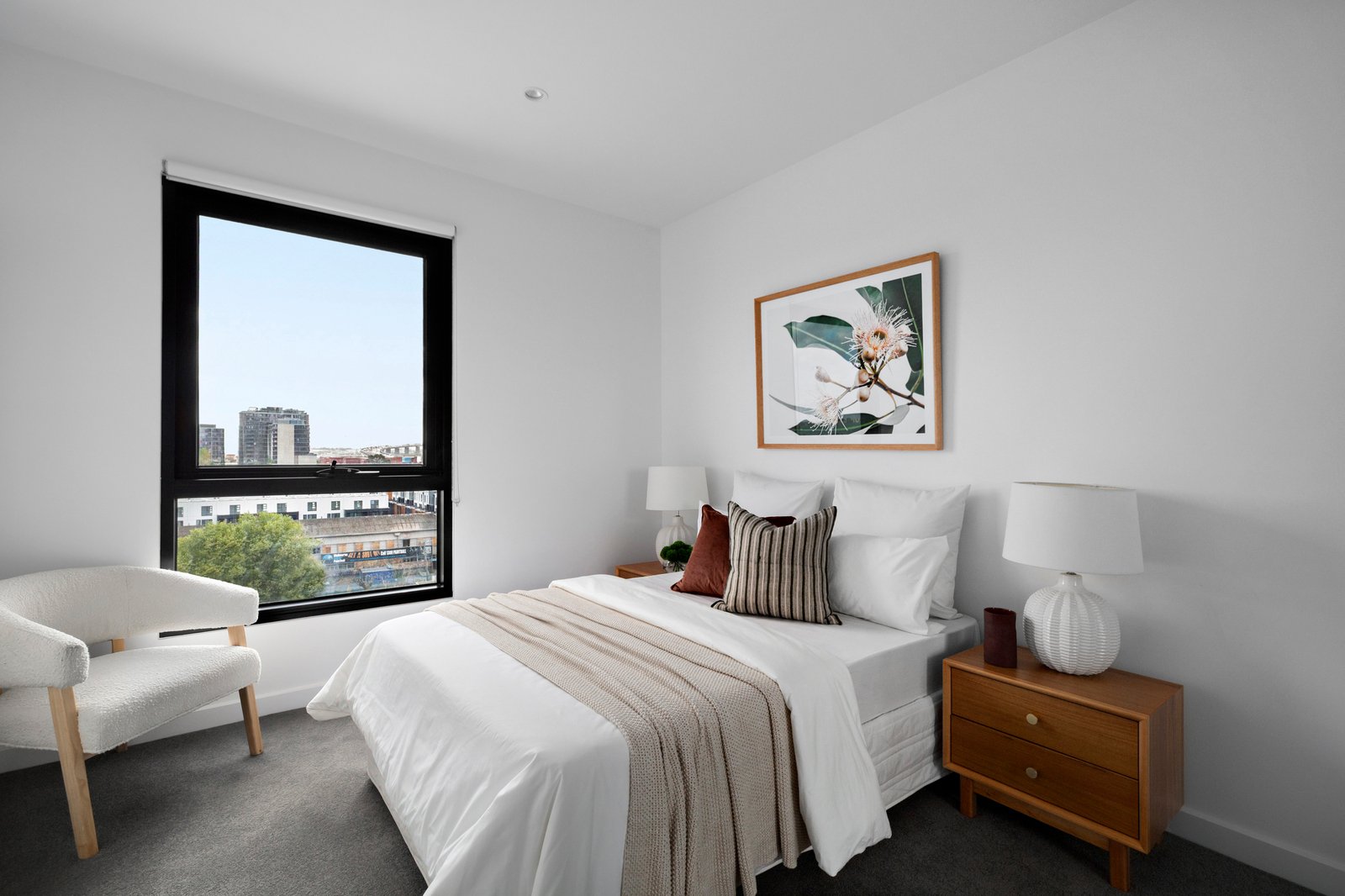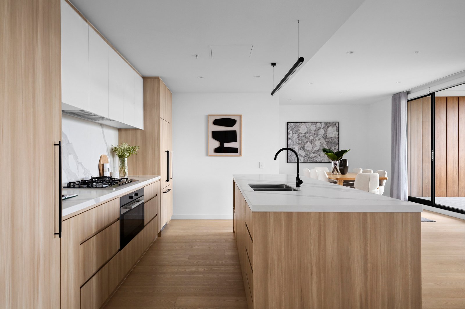 Limited to just twenty-three apartments, with only two on the seventh level, it holds an air of exclusivity above its dynamic surroundings, with Bay Street’s cafés, the beach and city-bound trams and buses all within walking distance. Inside, engineered oak floors and high ceilings create a sense of calm and continuity, extending through substantial open-plan living and dining spaces to the CBD beyond. The undercover terrace invites long lunches and evenings backdropped by the city lights, complemented by a state-of-the-art Miele-appointed kitchen, finished with honed porcelain and oak veneer surfaces.