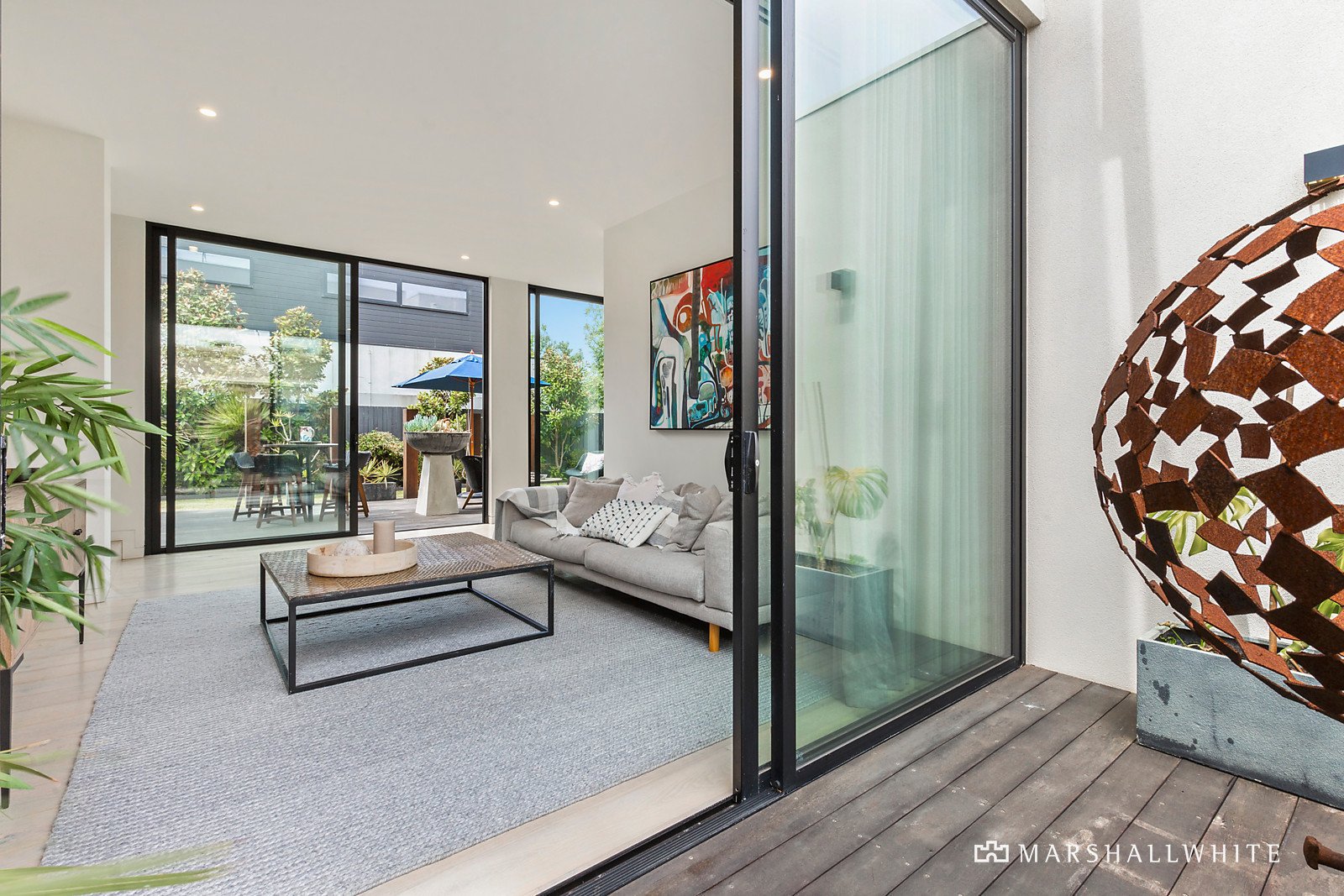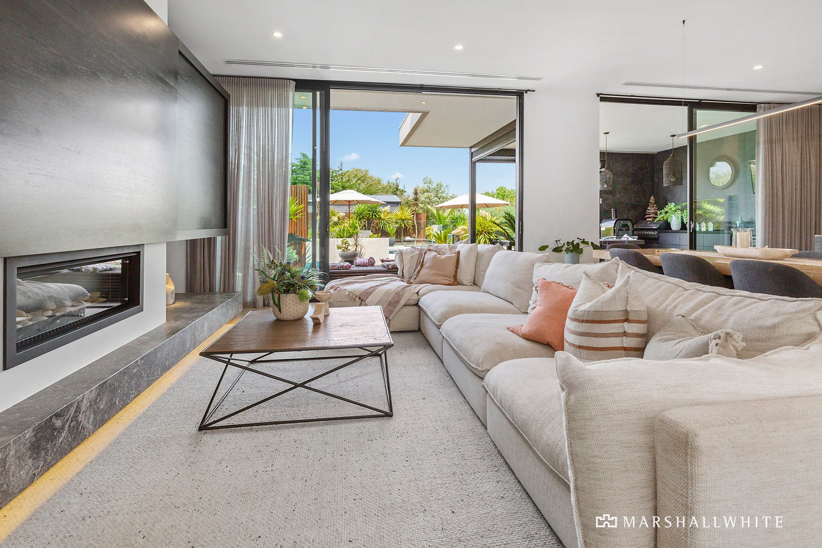 A spectacular exemplar of contemporary coastal living with soaring 3-metre ceilings, oak flooring, vast picture windows and gracious cantilevered angles, the five-bedroom abode sits amidst Zen-like landscaped gardens peppered with ornamental pear trees, magnolias, succulents and bangalow palms, offering a resort-like ambience for privileged living and exceptional poolside entertaining.