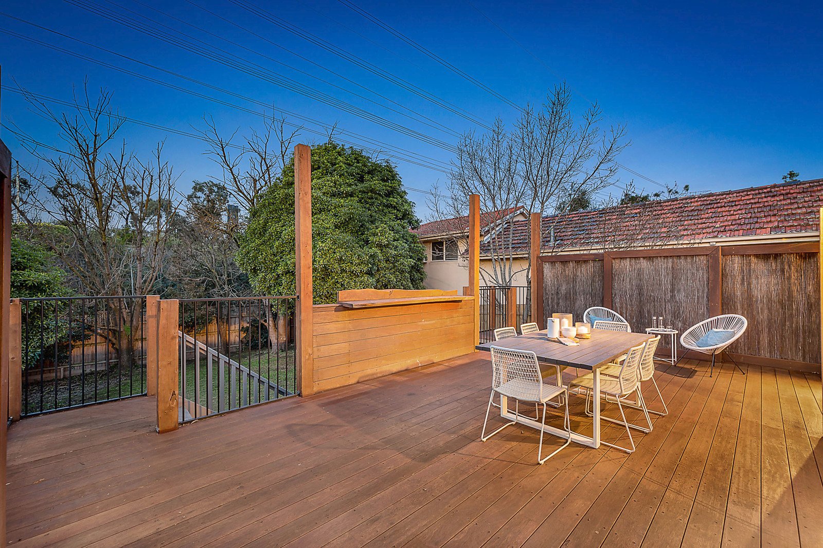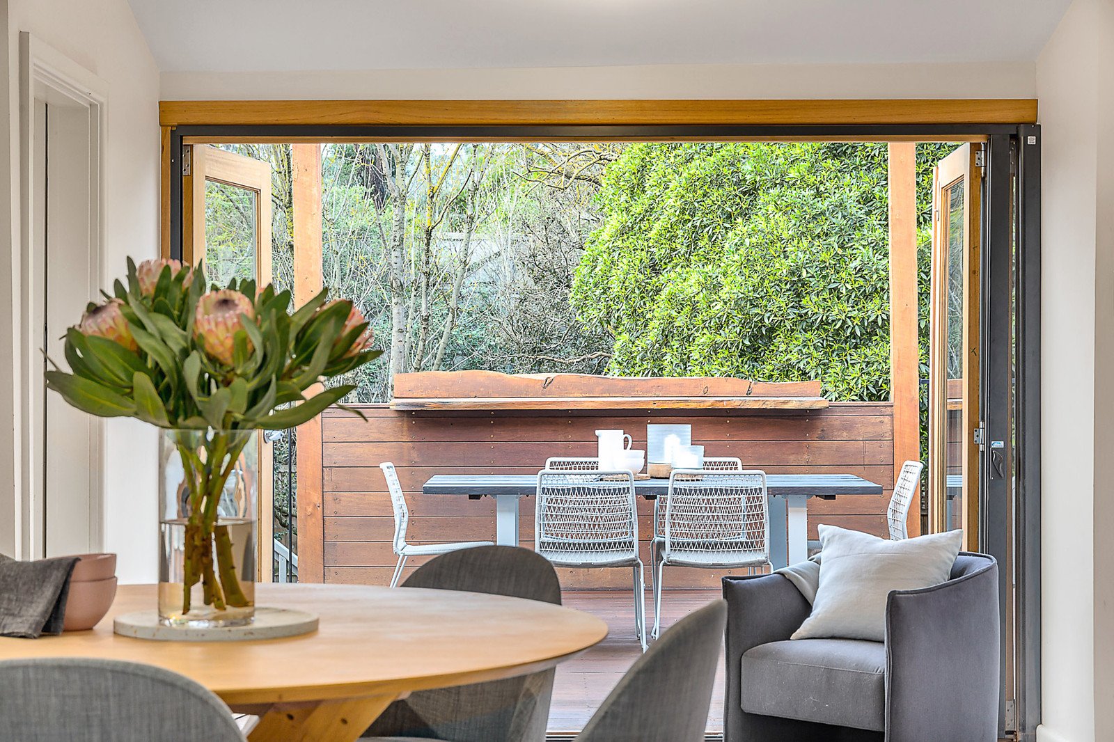 Streaming with natural light and boasting polished timber floors, the open plan living area with a stone surrounded fireplace and generous dining space are served by a gourmet kitchen appointed with a La Germania oven. Bi-fold doors open completely to a large entertaining deck overlooking the deep leafy north-facing private garden. The two double bedrooms with built in robes are accompanied by a third bedroom or study and stylish bathroom.