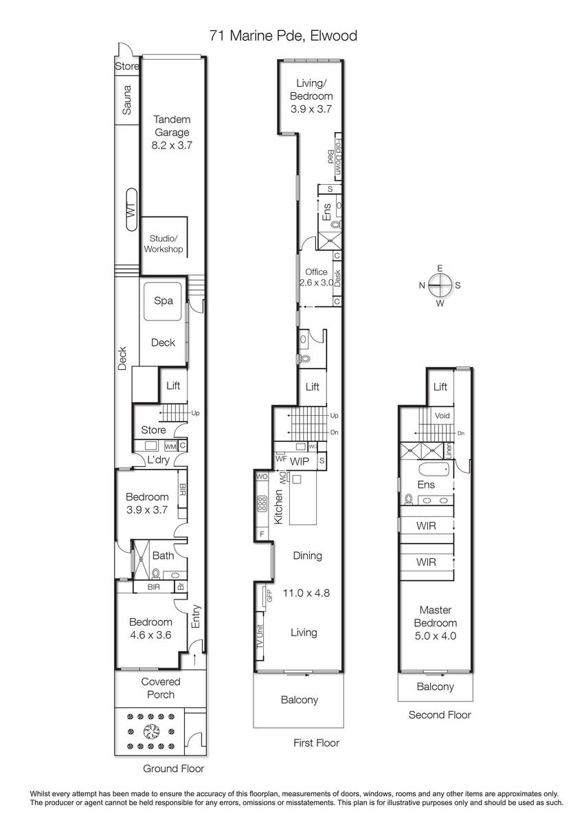 Ease of liveability along this prized stretch is assured, with rear lane vehicle access to double lock-up garage (with internal access), as well as rare (for Elwood) 24-hour permit-free parking directly out front. Behind a secure, intercom-operated entry gate is a newly planted designer garden. Upon entry you'll note the high ceilings, wide format engineered oak flooring, and gallery lights lining a long hallway. There are two bedrooms with BIRs on this level, and a luxe bathroom. Sun soaked all day, the fully-decked northern side courtyard features a large 8-person gas-heated spa, a sauna and an outdoor shower. There is also workshop/studio space at the rear of the garage. The three levels are connected by a timber staircase, or take the lift, featuring an arty photographic mural. The second level contains another large bedroom suite (or teenager's/guest retreat), another splendid bathroom, powder room, home office, and the open plan kitchen/dining and living space that is framed by the incredible bay views through floor-to-ceiling sliding (double-glazed) glass doors leading to a good-sized alfresco dining balcony. A gas-log heater, with imported tiled surrounds, and new feature lighting creates ambience and interest. Designed for gourmet entertaining, the kitchen is resplendent with marbled stone benchtops, island/breakfast bar, an extra-wide Liebherr integrated fridge, Gaggenau cooking appliances including double oven and cooktop with gas wok burner, integrated dishwasher plus fully serviced butler's pantry with Vintec wine fridge. Views from the top level master suite, include the city skyline, from the private balcony. With a luxe ensuite, (freestanding tub/double shower) plus twin, fully-fitted WIRs, this 'parental penthouse' is a real showstopper.