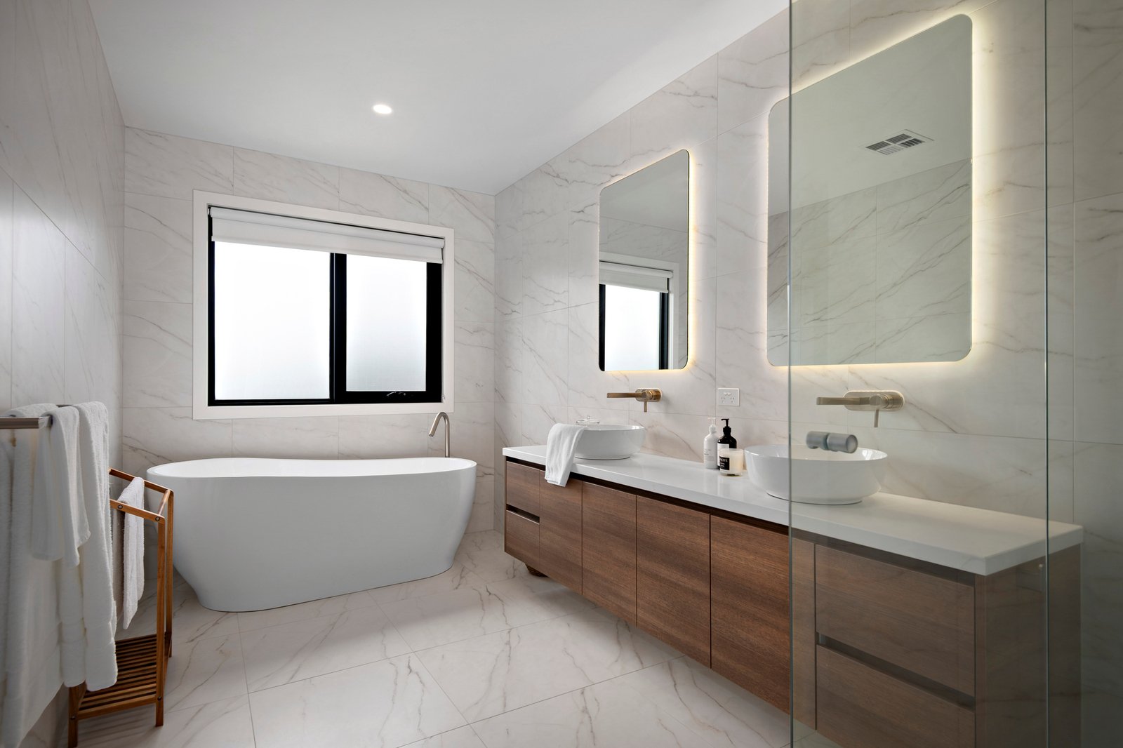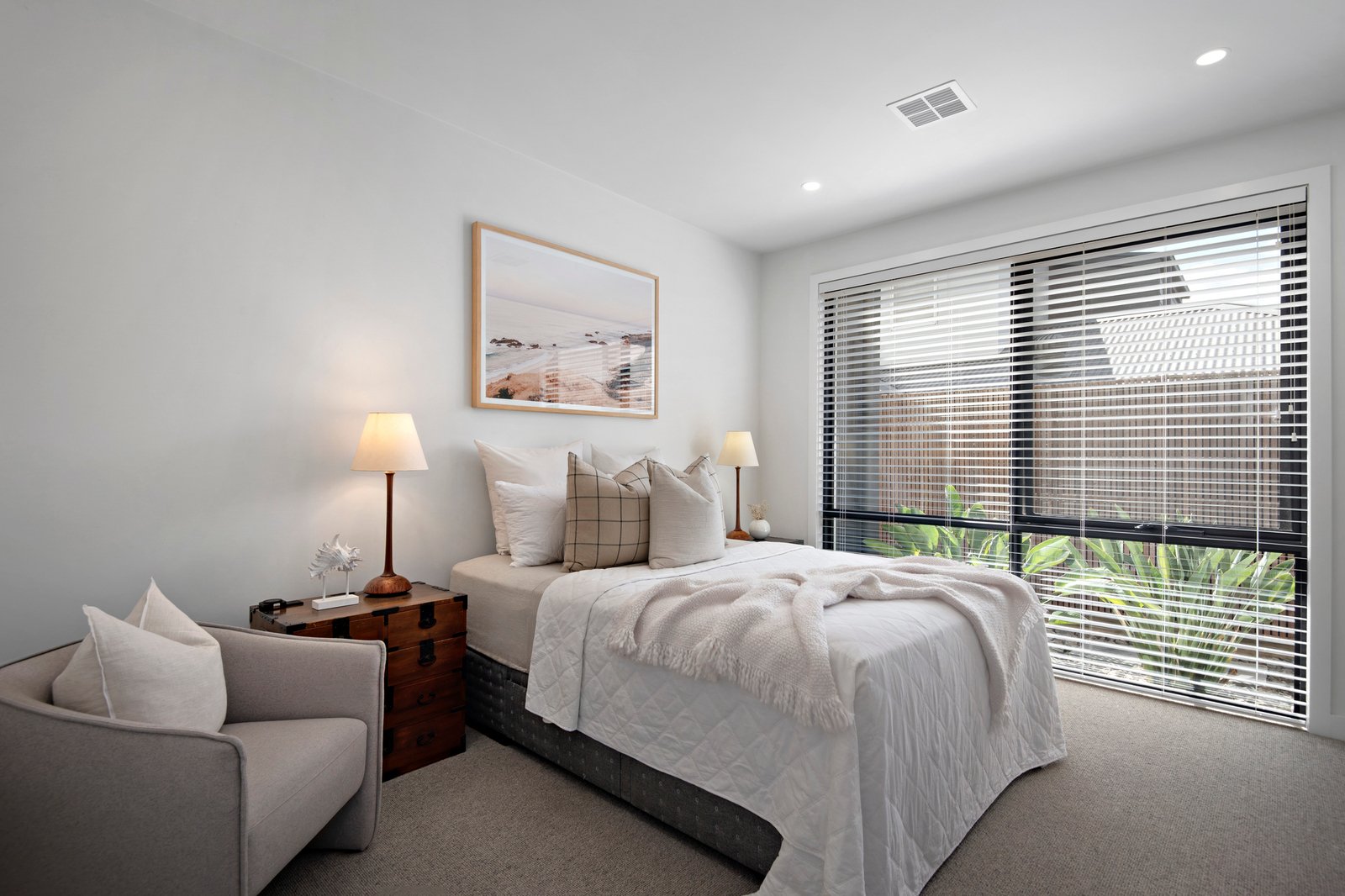 Upstairs is the second living space with coastal neighbourhood outlooks through newly installed plantation shutters, a study/home office, two spacious robed bedrooms, the five-star main bathroom with free-standing tub, twin stone vanity and walk-in dual head shower, and a second powder room.