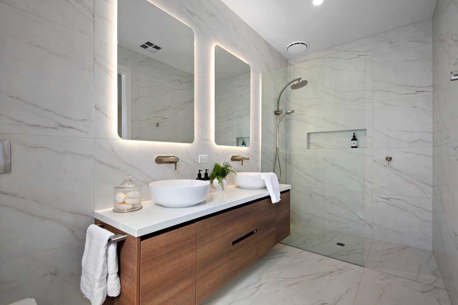 Pure wool loop pile carpet is sumptuous underfoot in the spacious main bedroom suite with custom-fitted walk-in robe/dressing room, while the ensuite introduces the home’s high-end bathroom fit-outs, showcasing gleaming floor-to-ceiling marbled porcelain tiles, stone topped vanities, and brushed nickel tapware. Also downstairs is a luxury powder room, stone benchtop laundry with external access, and access to the double garage with remote automated door, sealed concrete floors, and built-in storage.