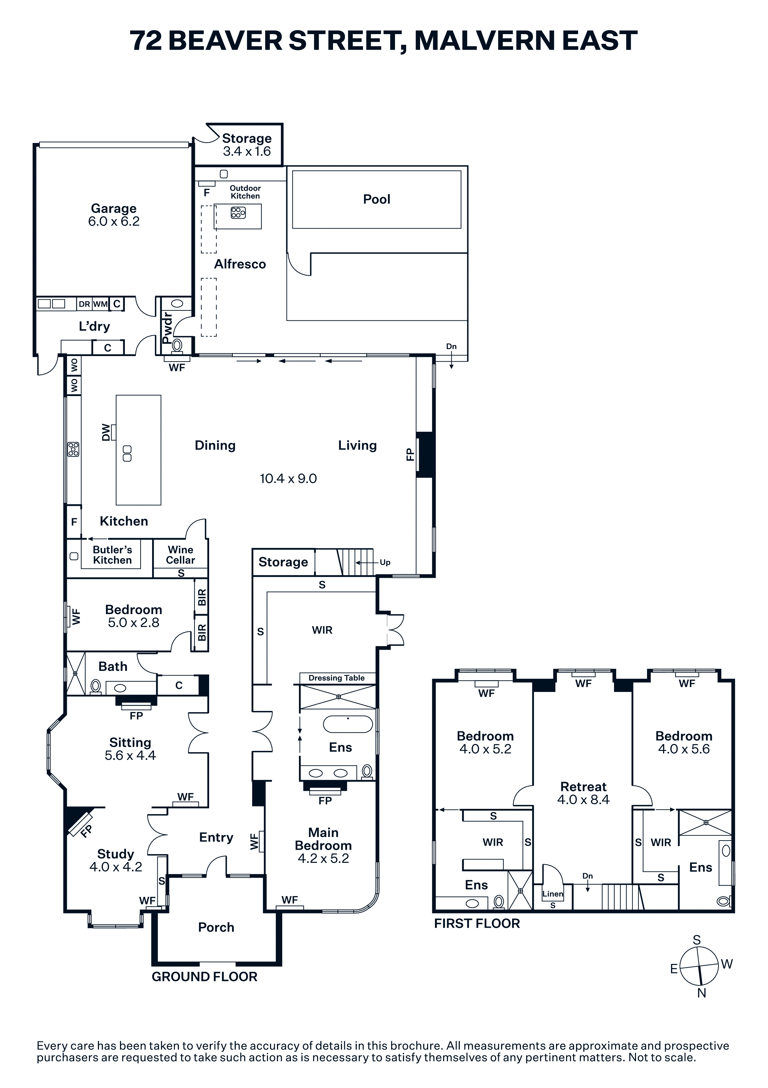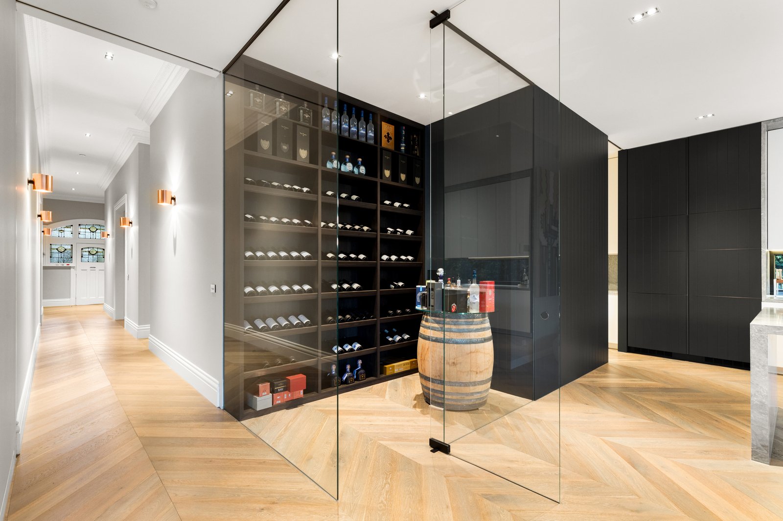 Resplendent with the elegance of the era, the generous reception hall introduces a refined executive study and gracious formal sitting room, featuring European oak chevron floors, high ceilings, leadlight windows and modern marble fireplaces. Proportioned to accommodate grand scale entertaining, the living and dining domain with a gas log fire, a glass walled wine cellar and custom cabinetry is anchored by an elegantly efficient chef’s kitchen appointed with sleek stone benches, a full suite of Miele appliances including integrated fridge/freezer and a butler’s pantry. Full height glass sliders open to a large undercover al fresco terrace with heaters and a superb BBQ kitchen overlooking a landscaped easy-care garden with solar heated pool.