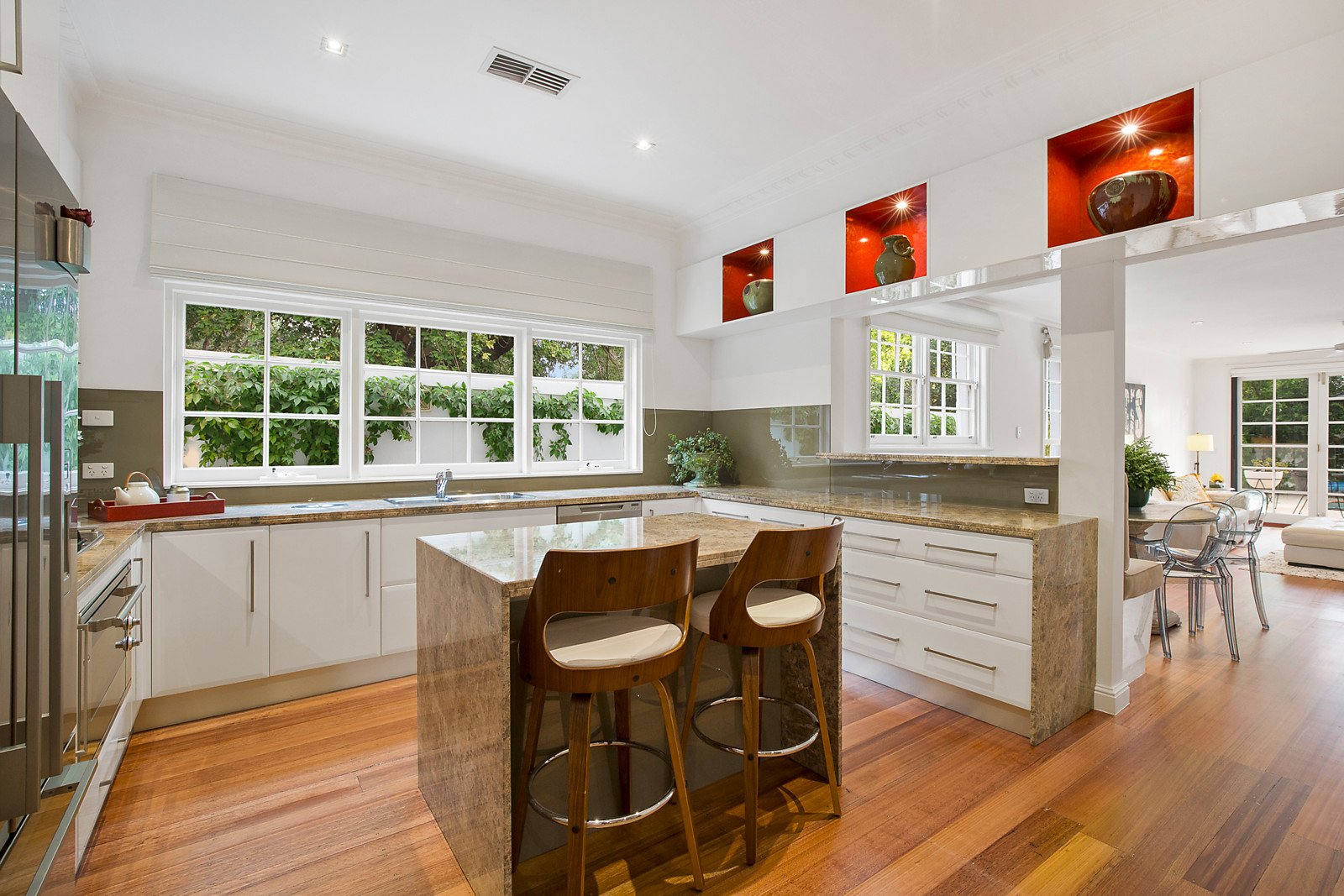 Enjoy a prestige lifestyle bordering the beautiful Kamesburgh Gardens on leafy North Road, with schools and the beach nearby. Spacious and with the bonus of a self-contained garden pavilion for poolside entertaining and working out in your own gym, this is a dream home with a sense of elegance. The beauty starts with the classic street appeal, is a feature of the separate living and dining rooms, and extends upstairs and outside to the garden and adjacent greenery. A quality renovation has enhanced every room, including the marble kitchen with a 90cm Ilve oven, twin-drawer dishwasher and workstation. The family room impresses with banquette seating in the casual meals area, and has bifold doors opening onto a garden terrace where you can admire one of Brighton's finest parks. This is a well-zoned family home, with three bedrooms and a study, and ground-floor parents' retreat with a sitting area, spa ensuite and walk-in wardrobe. Impressive design features a total of four living areas, three bathrooms, two-car basement garage, remote-control gates, wine refrigeration, attic storage, kitchen workstation, and portico entry. Central address is near many schools, you can walk to the beach in minutes, and Martin Street's cafes, shops and station are a stroll away from this fine home.