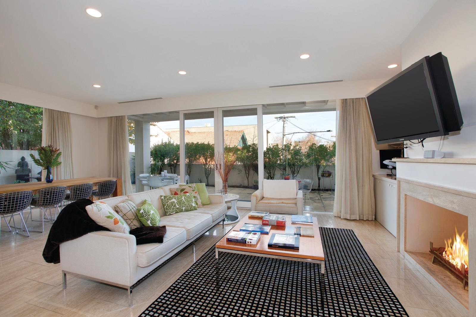 In signature style, travertine floors flow seamlessly while floor to ceiling glass doors connect every living area with the expansive surrounding completely private leafy terraces to provide wonderful spaces for relaxing or entertaining. A generous sitting room with open fireplace is complemented by an equally spacious living and dining room also with an open fire and a sleek, streamlined Miele kitchen featuring Corian benches. A skylit gallery leads to the main bedroom with travertine en-suite and walk in robes, two further bedrooms with built in robes and a second bathroom.