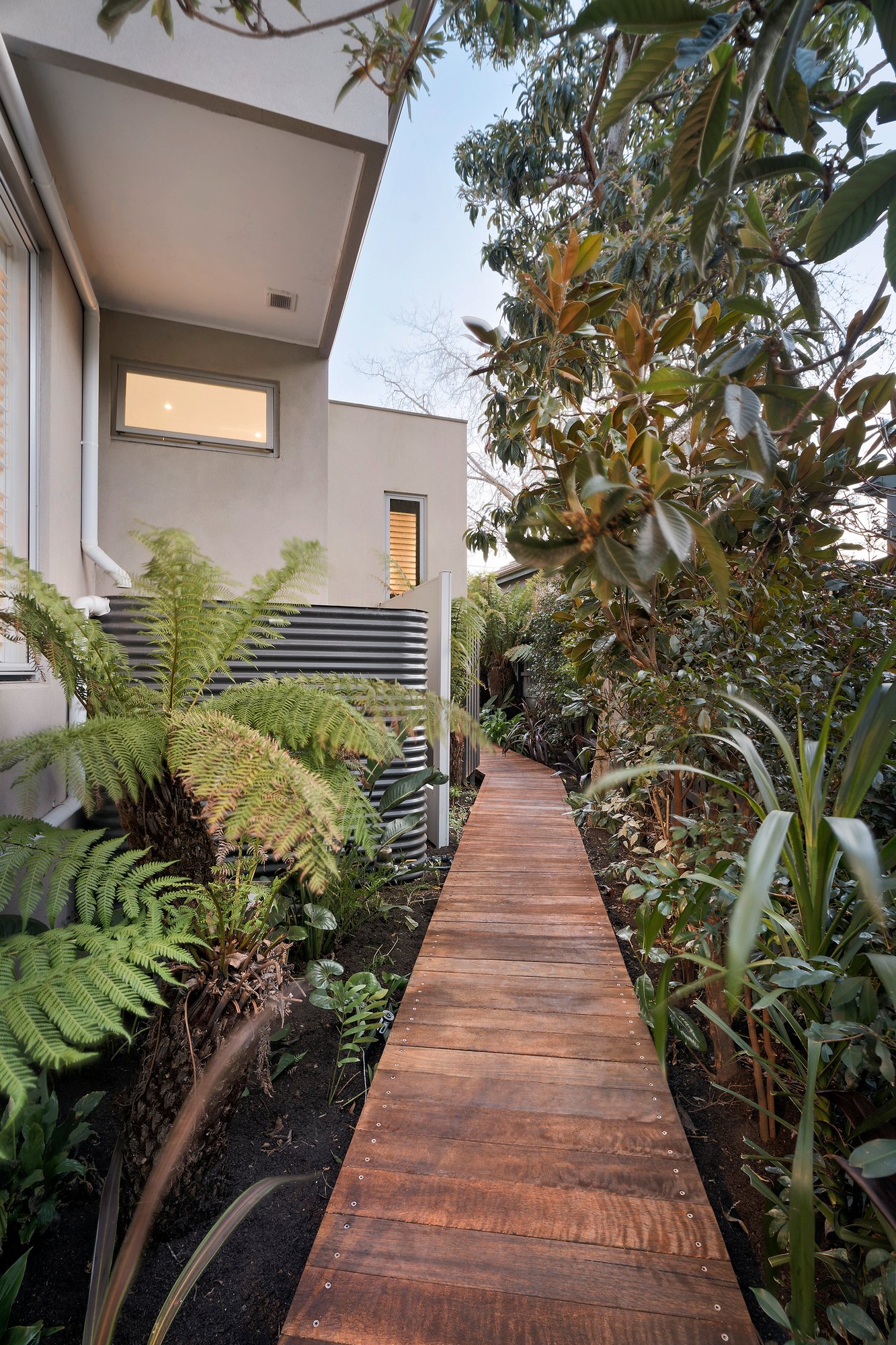 Creating an evocative street presence with rendered concrete complemented by striking natural timber accents, the home’s oversized timber front door swings open to reveal a broad hallway and attractive open-plan that fills with northern light while framing verdant garden outlooks. Underpinned by a gourmet kitchen where a heritage-style showpiece black SMEG oven / cooktop holds pride of place, the space is arranged around a stone-topped breakfast bar that is perfect for the morning rush.