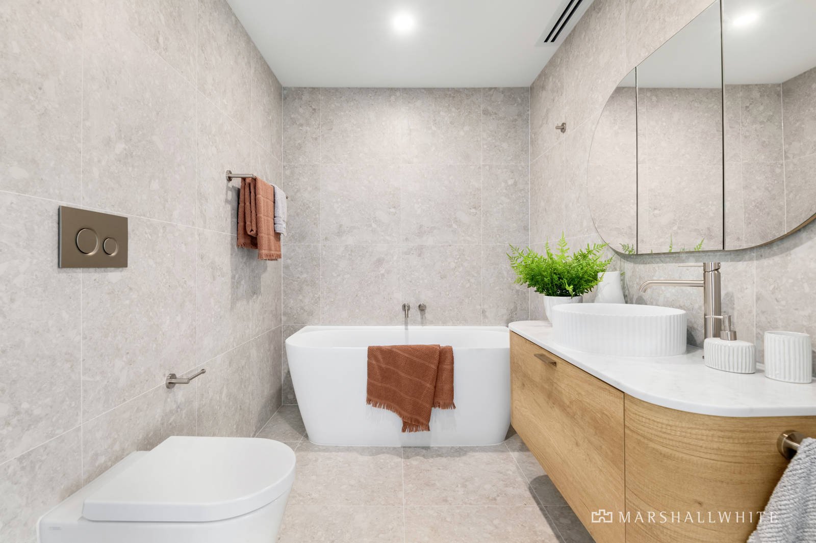 Upstairs, the master bedroom evokes the feel of a private sanctuary with more stunning views, walk-in robes, built-in bench seating, custom made cabinetry and a fully-tiled ensuite. Meanwhile, each of the remaining bedrooms has been thoughtfully completed with custom-built robes, plus there is a fully-tiled family bathroom - with a frameless screened shower and independent bathtub - as well as a powder room.