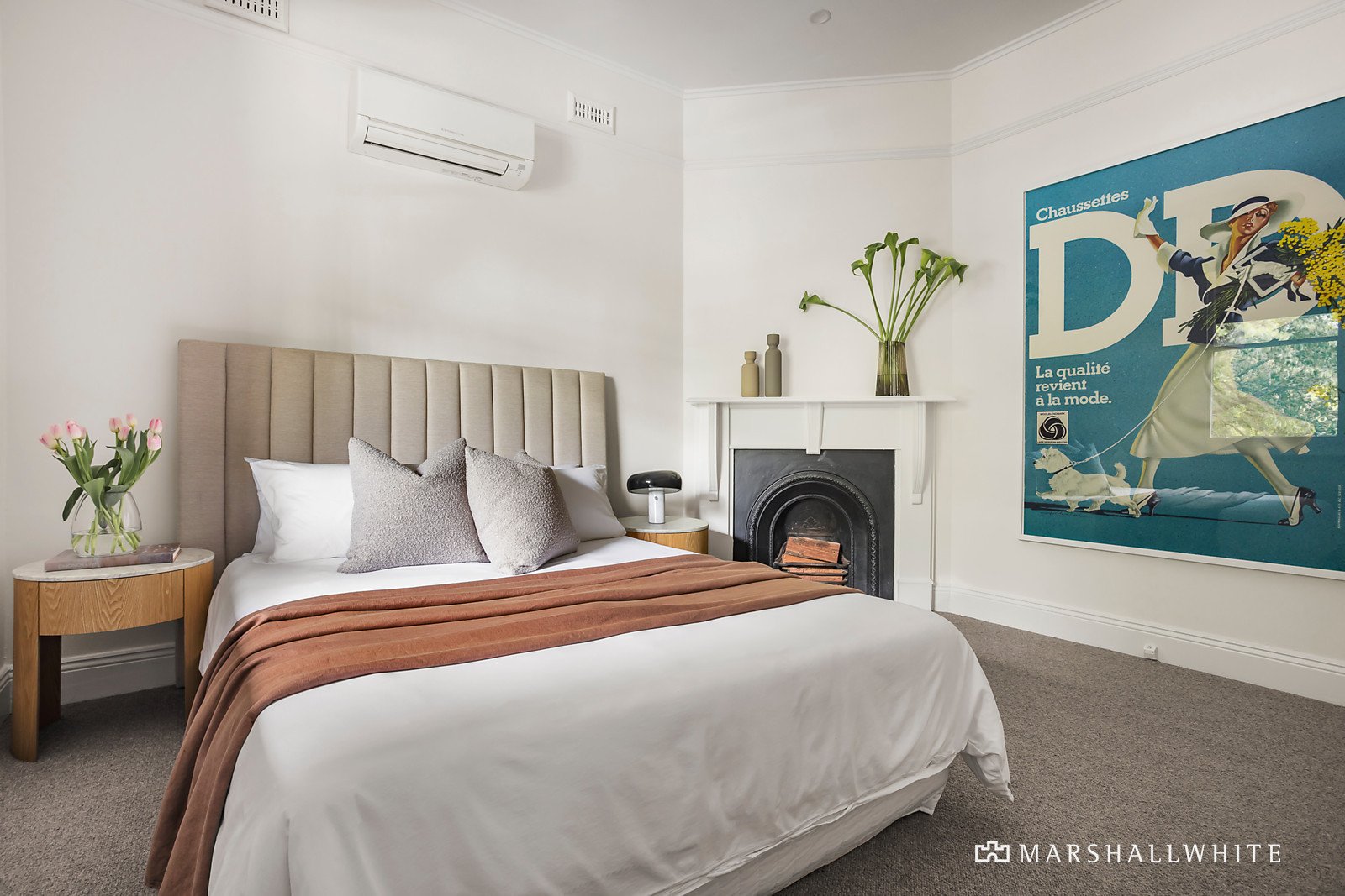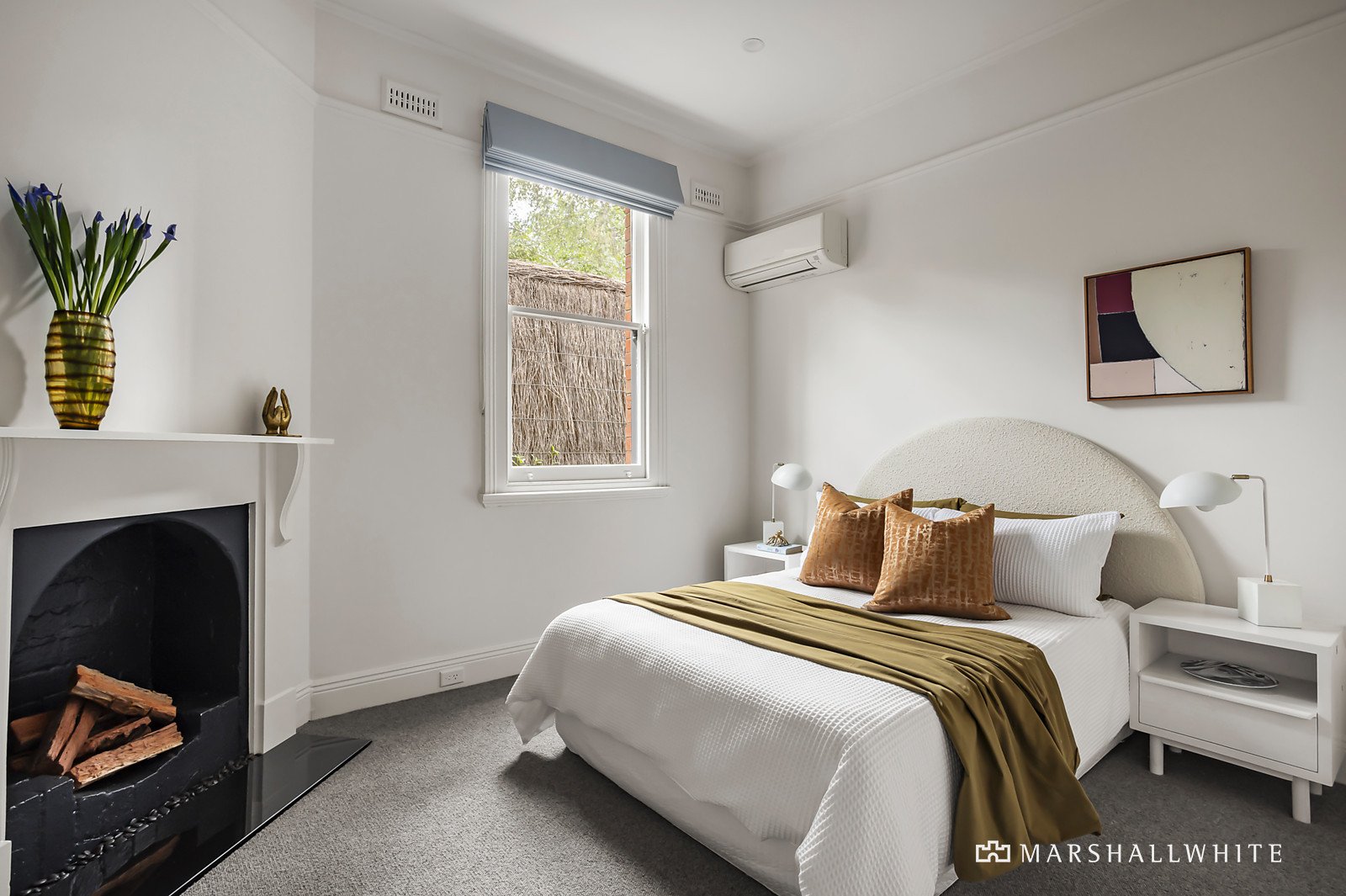 An elevated entrance reveals limed Baltic pine floors in the wide entrance hall leading to two double bedrooms with robes and fireplaces, a versatile third bedroom or home office and a stylish bathroom with Euro-laundry. A towering, vaulted ceiling adds to the scale of the generously proportioned open plan living and dining room with a sleek gourmet kitchen appointed with Corian benches. French doors open the living space to a large entertaining terrace and the private northwest leafy garden with gate to the rear right of way.