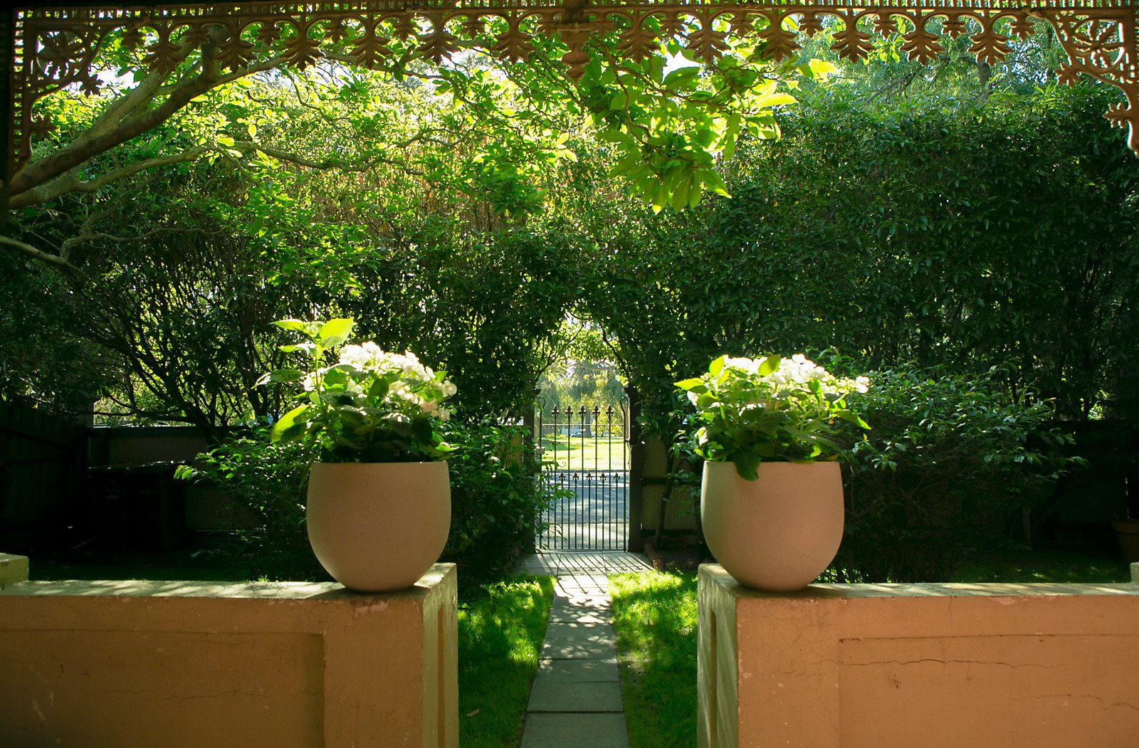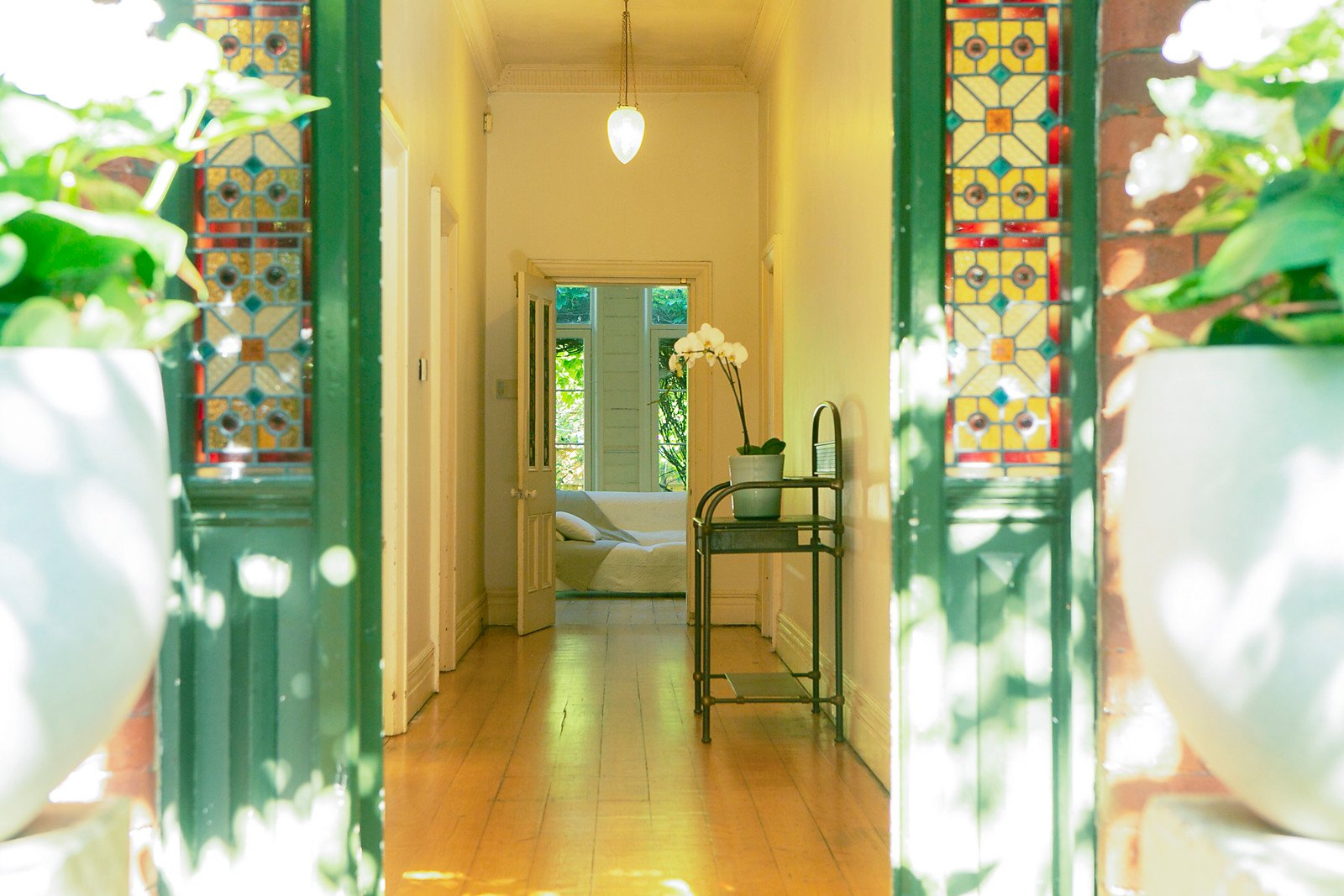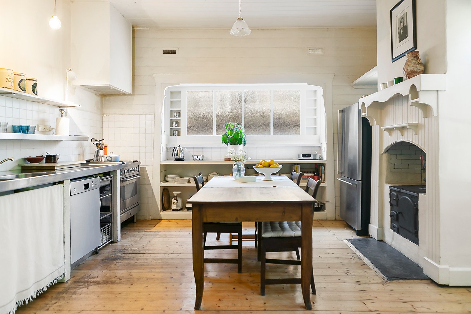 Behind the most attractive double fronted façade, a wide central hall featuring Baltic pine floors, high ceilings and a stained glass skylight introduces three beautiful double bedrooms, all with pressed metal ceilings and open fireplaces. A patch of the original hand painted wallpaper has been retained in the welcoming central lounge room with open fireplace. Tongue and groove timber ceilings and walls are featured in the rear living room and french style kitchen with Ilve oven, original wood stove and meals area. Three sets of French doors open the rear living to the deep private leafy northeast garden with potential off street parking at the rear via Pumpkin Lane.