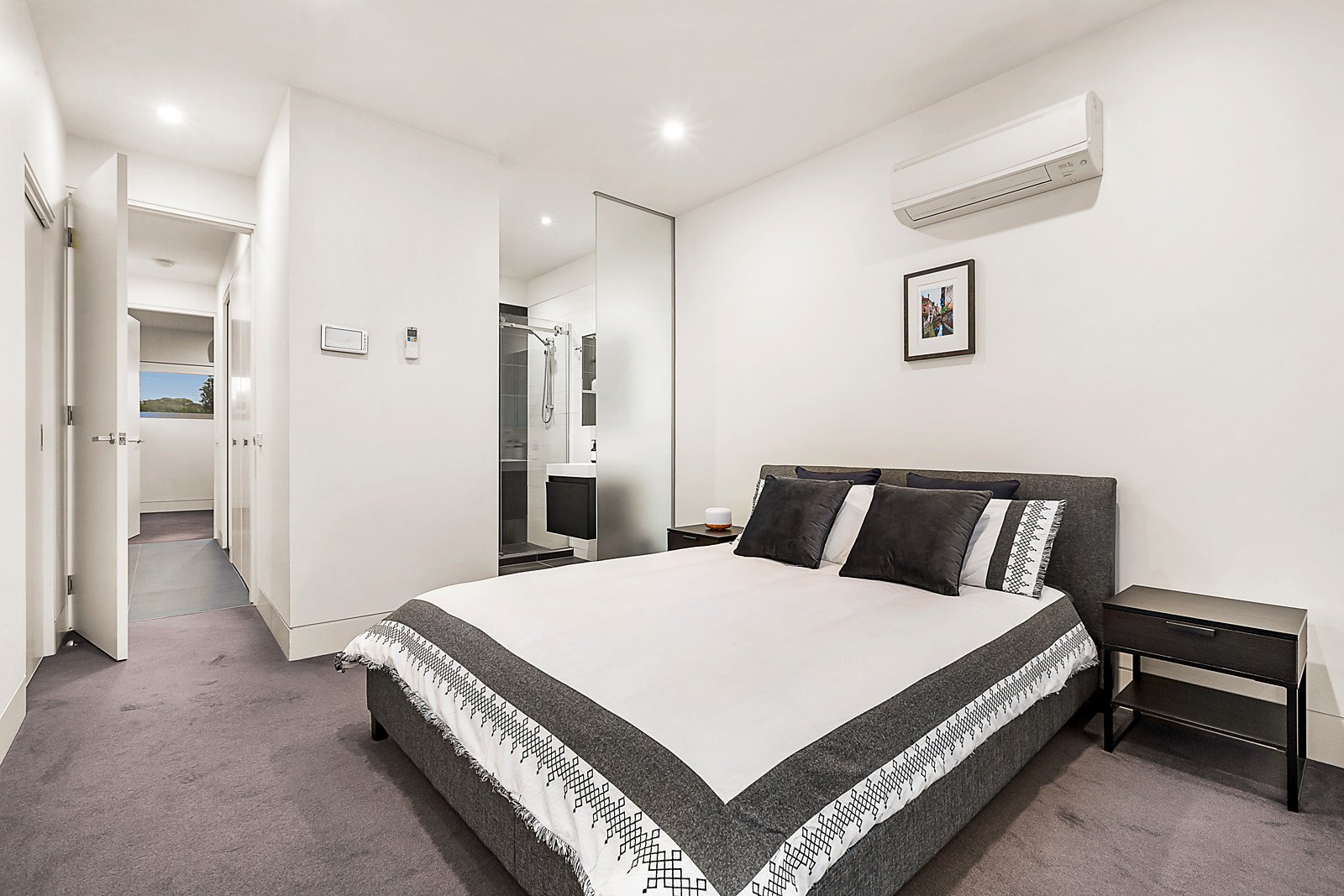 A high level of finish is highlighted by the bespoke joinery, high ceilings, auto blinds and wide oak floors featured in the generous living area and light-filled dining space served by a gourmet kitchen appointed with stone benches and European appliances. Sliding doors connect the dining room with a private north-facing decked courtyard with premium built in BBQ. The main bedroom with walk in robe and designer en suite is upstairs along with a second double bedroom enjoying city views with built in robe and stylish en suite.