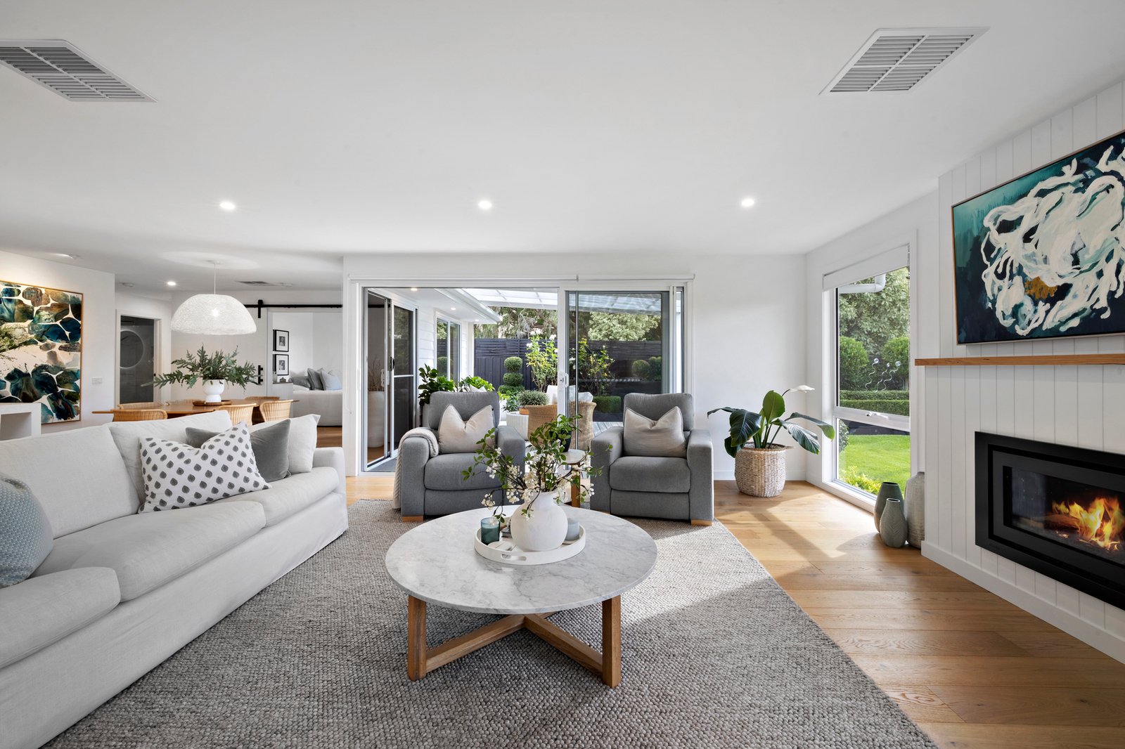 The spacious Living area has a gas log-fire heater and is drenched in northerly light, with outlooks to the landscape gardens. Inviting indoor/outdoor connectivity, glass sliding doors open on two sides to the undercover alfresco deck.