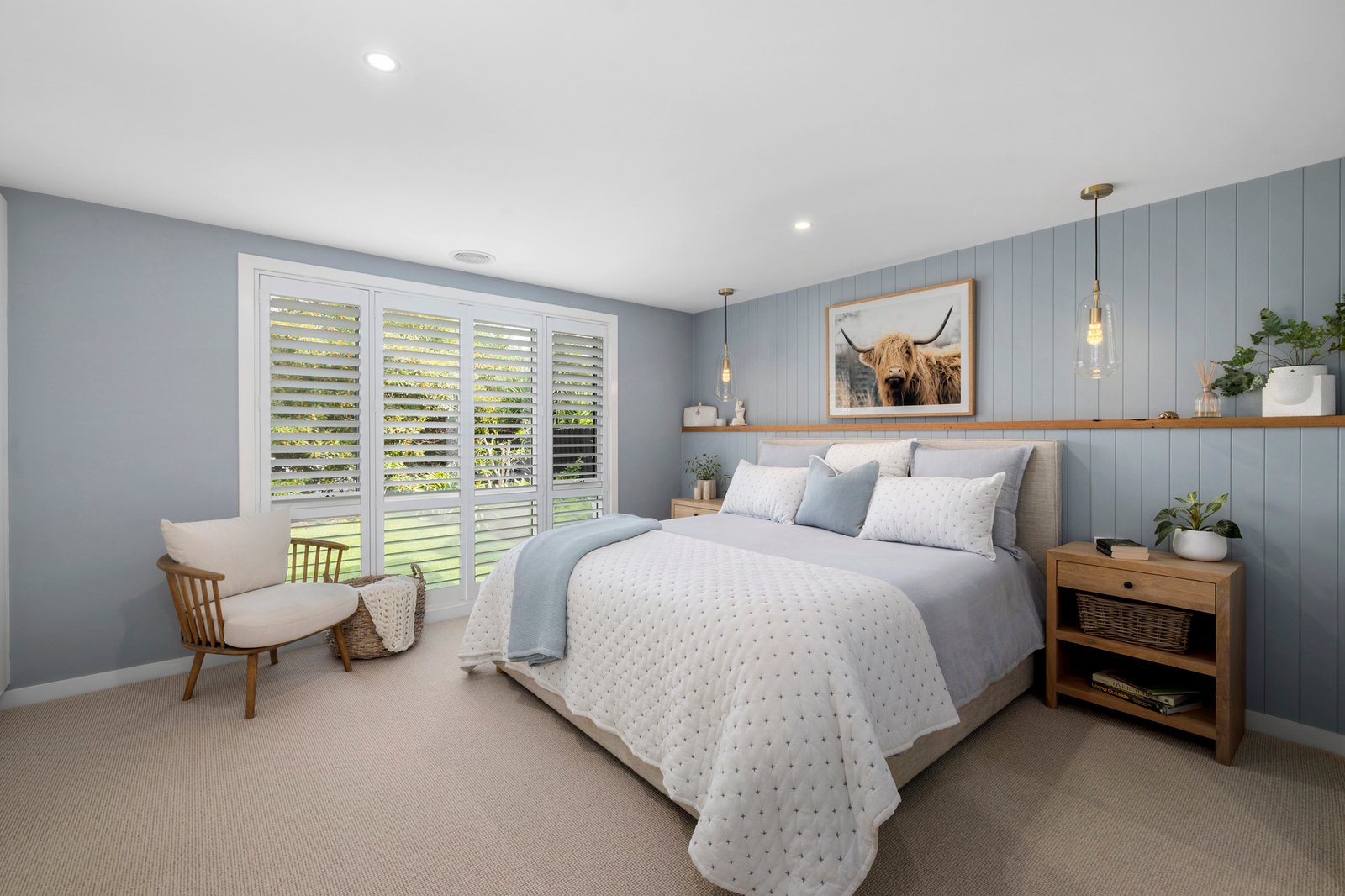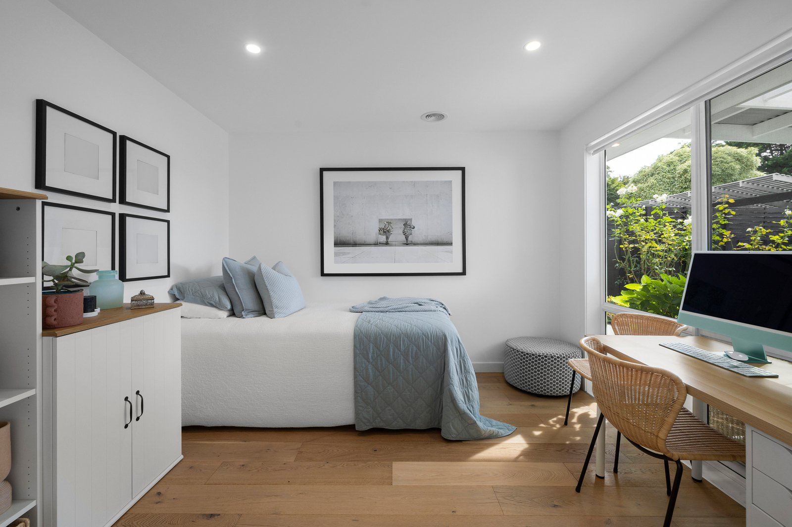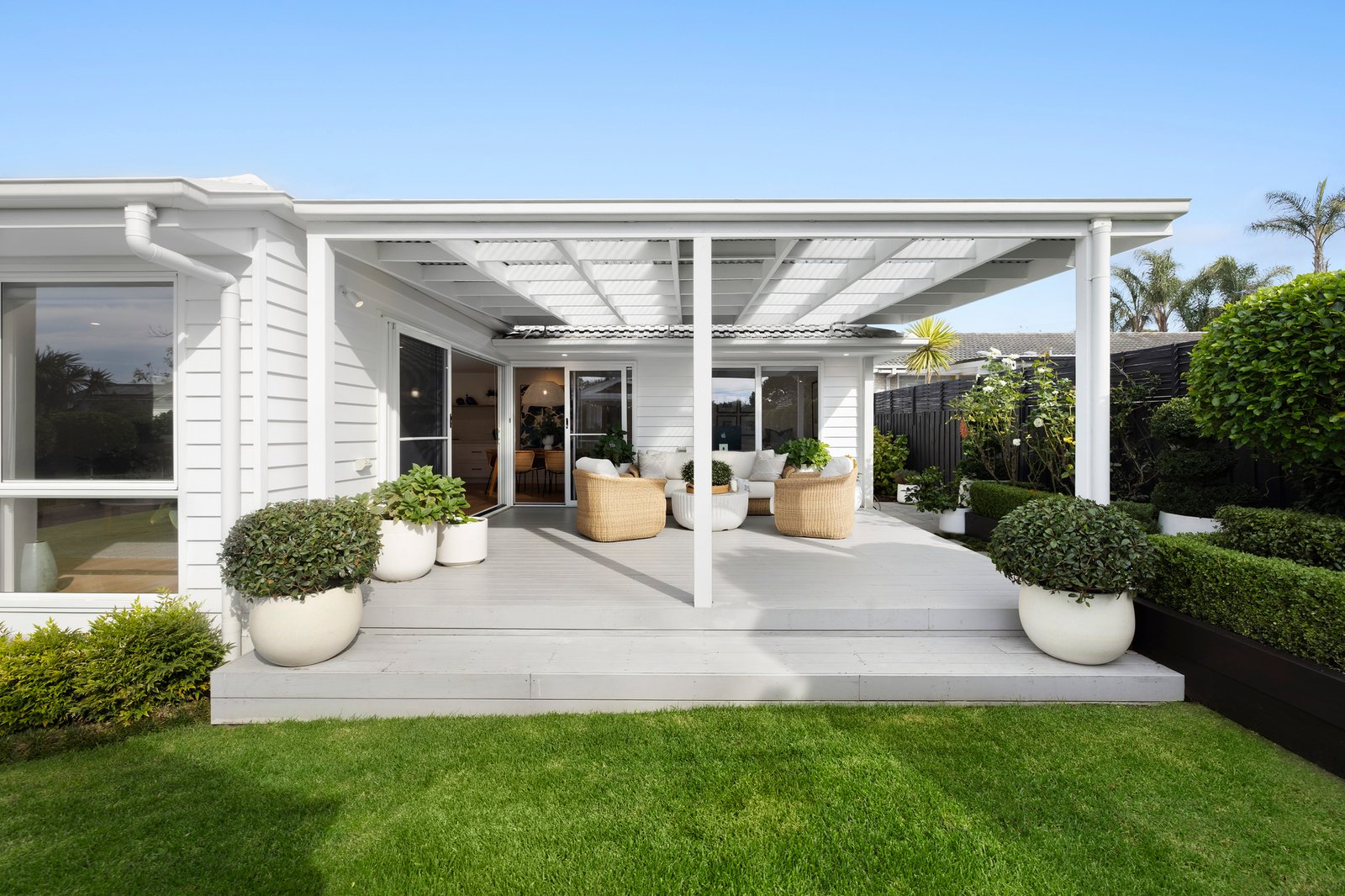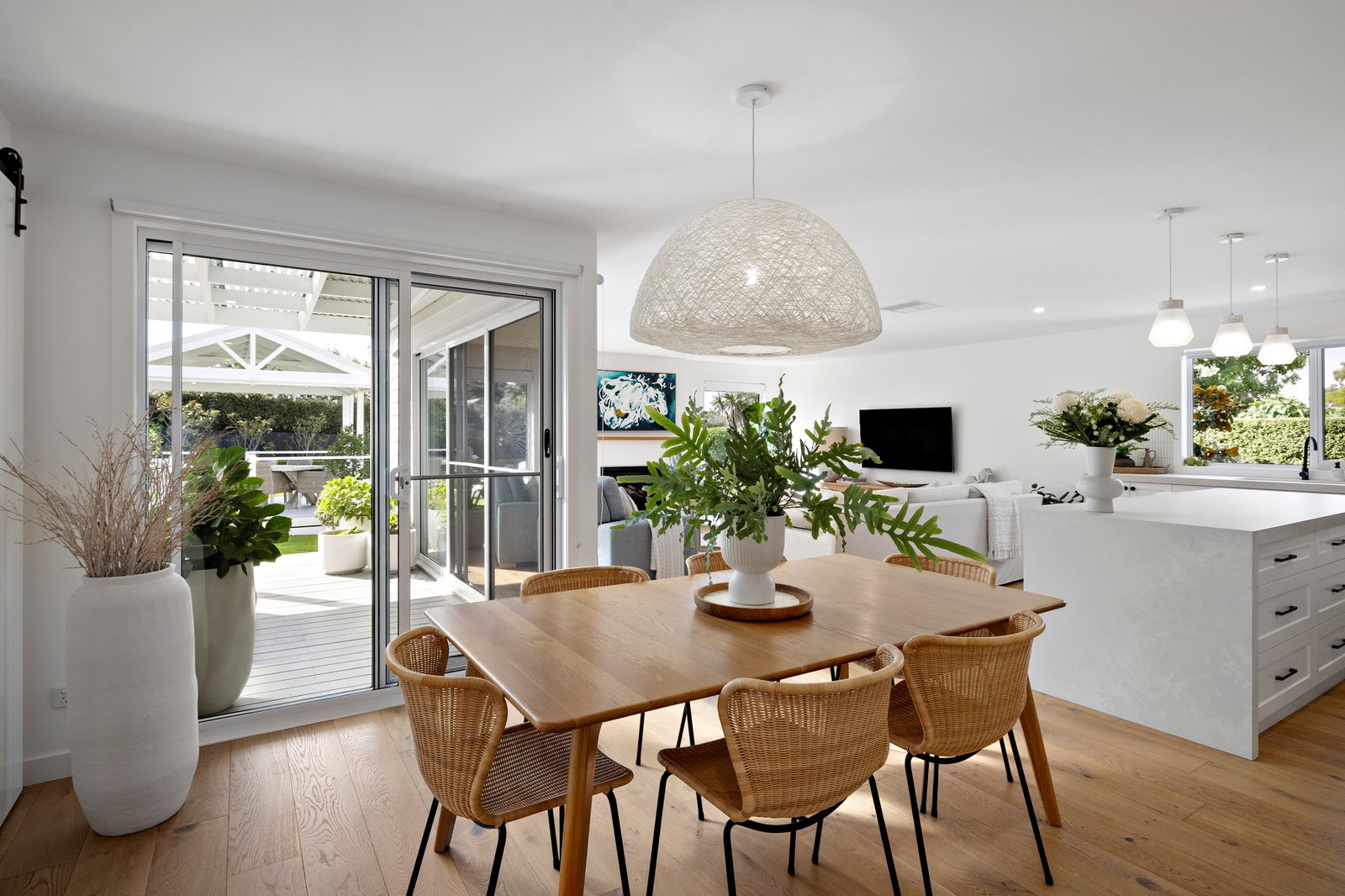 Completely transformed inside and out, the home’s refreshed Linea Weatherboard and rendered façade presents plenty of contemporary street appeal. A tiled entry verandah hints at the Hamptons style to be found within, with engineered oak floorboards, a neutral colour palette, timber wall panelling, pure wool loop pile carpets, plantation shutters, and bespoke joinery.