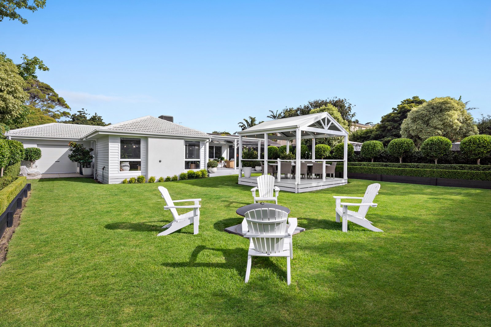 A garden gazebo, with lighting and pull-down shade blind, is the perfect spot for entertaining or sunset sips, while admiring the private gardens which feature clipped hedge borders, ornamental trees, lush lawns and a fire pit area.