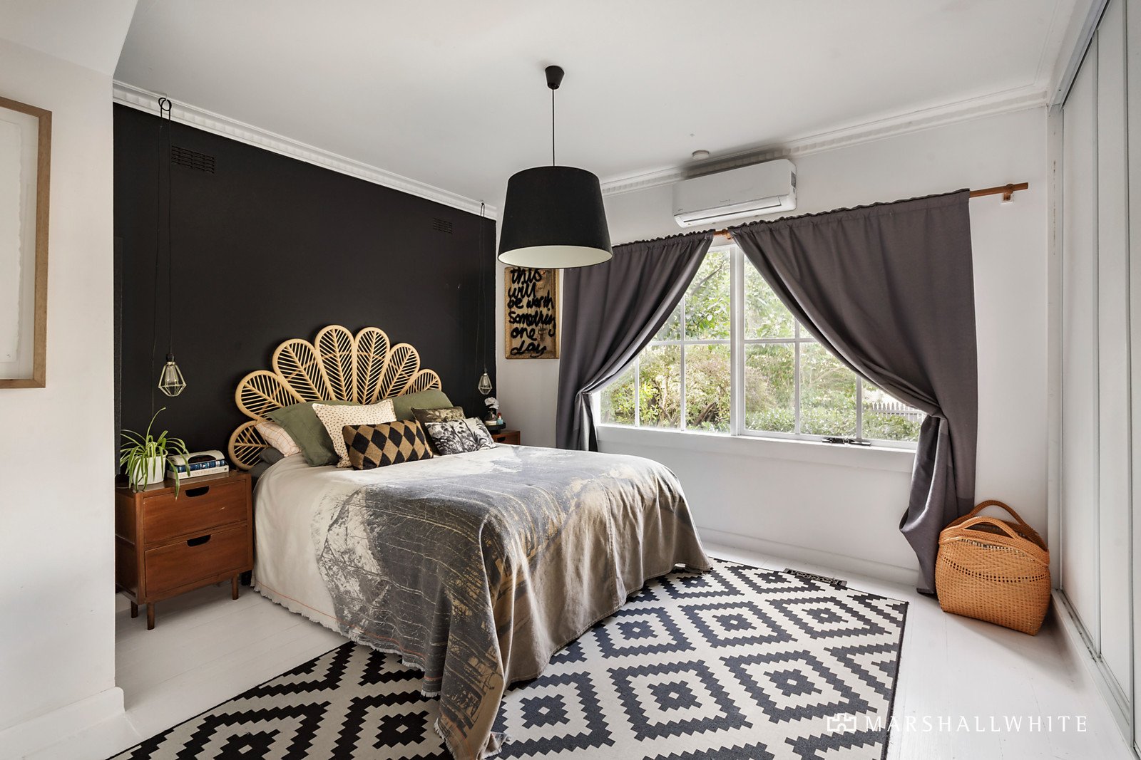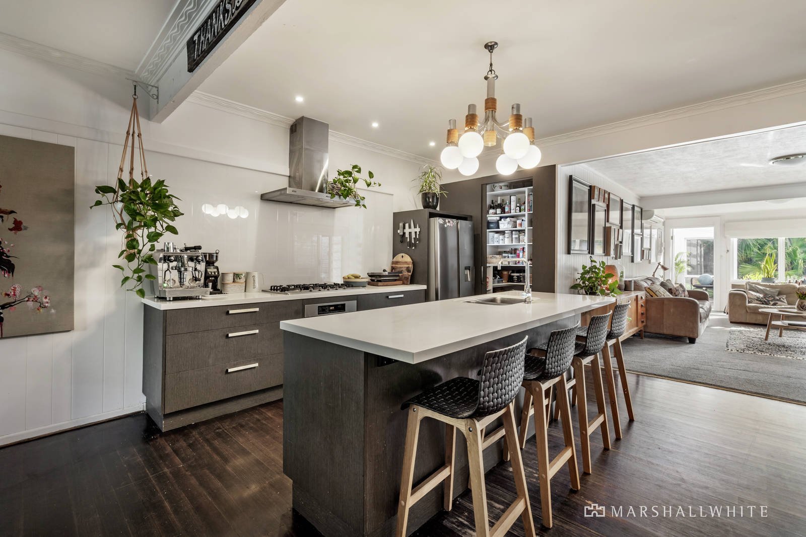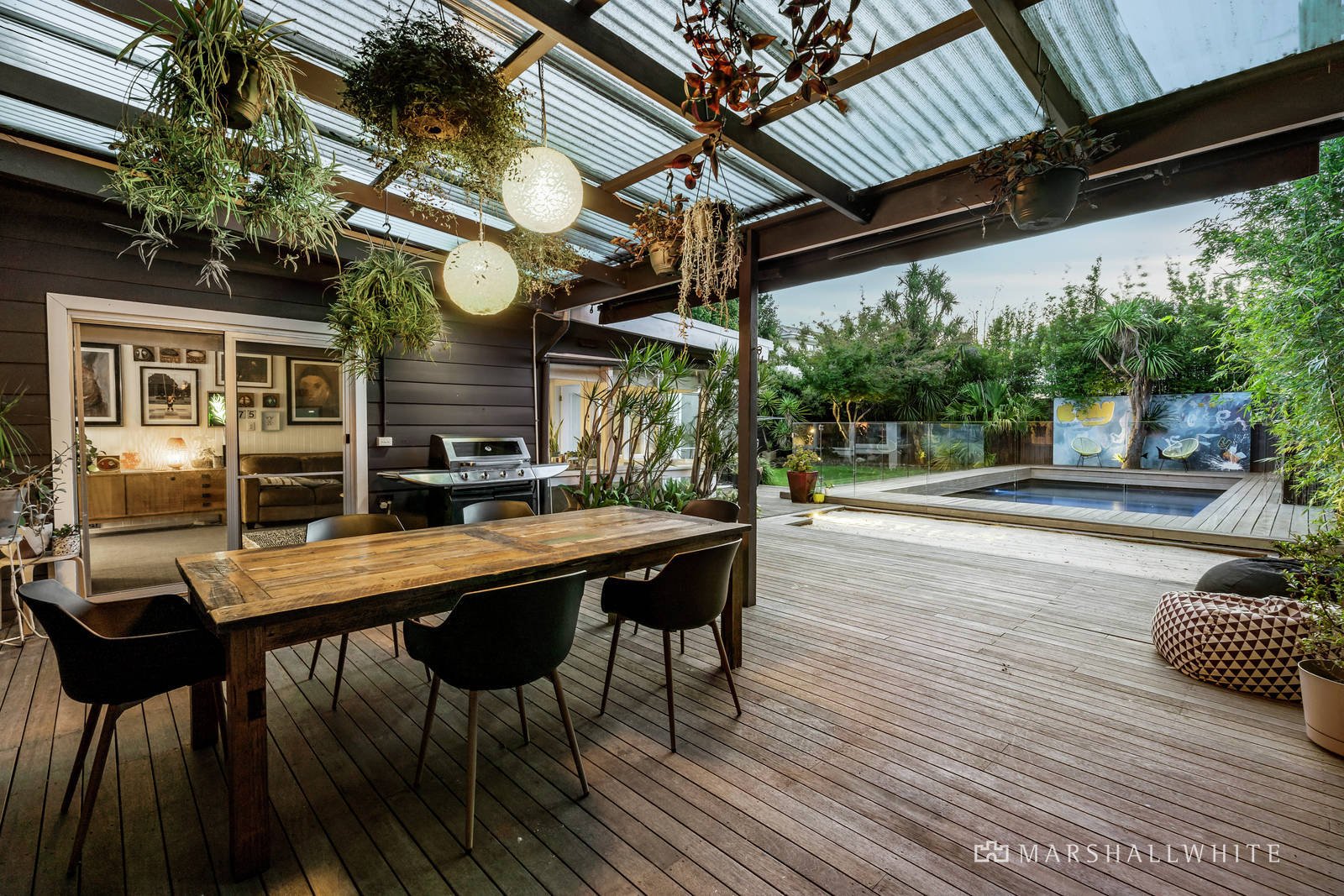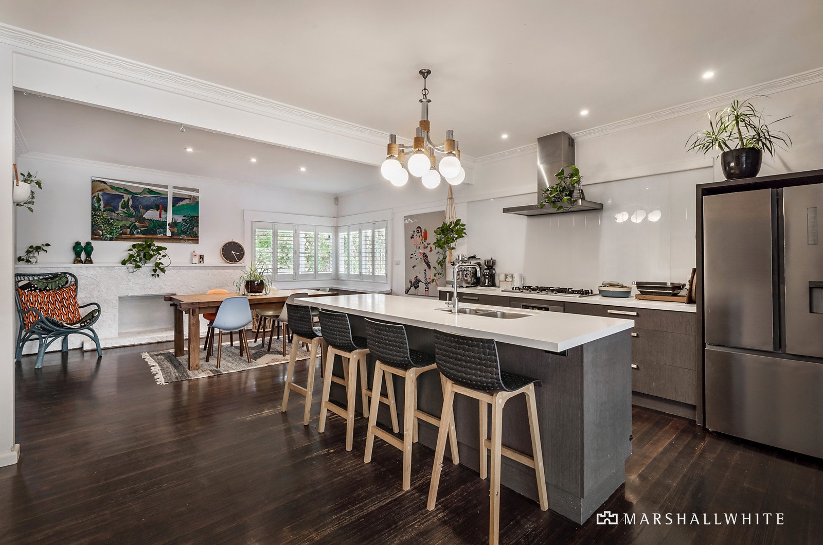 White painted floors make an impact in the entrance hall, while dark timber flows through in the generous dining room with ornate fireplace and the gourmet kitchen boasting stone benches, Miele oven and walk in pantry. The expansive living room extends out to a large undercover deck with sun-awning overlooking the deep private northwest garden with picturesque solar heated pool. A spacious multi-purpose rumpus room with kitchenette, shower and study nook also opens to the garden. The two downstairs bedrooms, also with white floors, and a designer bathroom with freestanding bath are matched upstairs by two additional bedrooms with robes and a stylish bathroom.