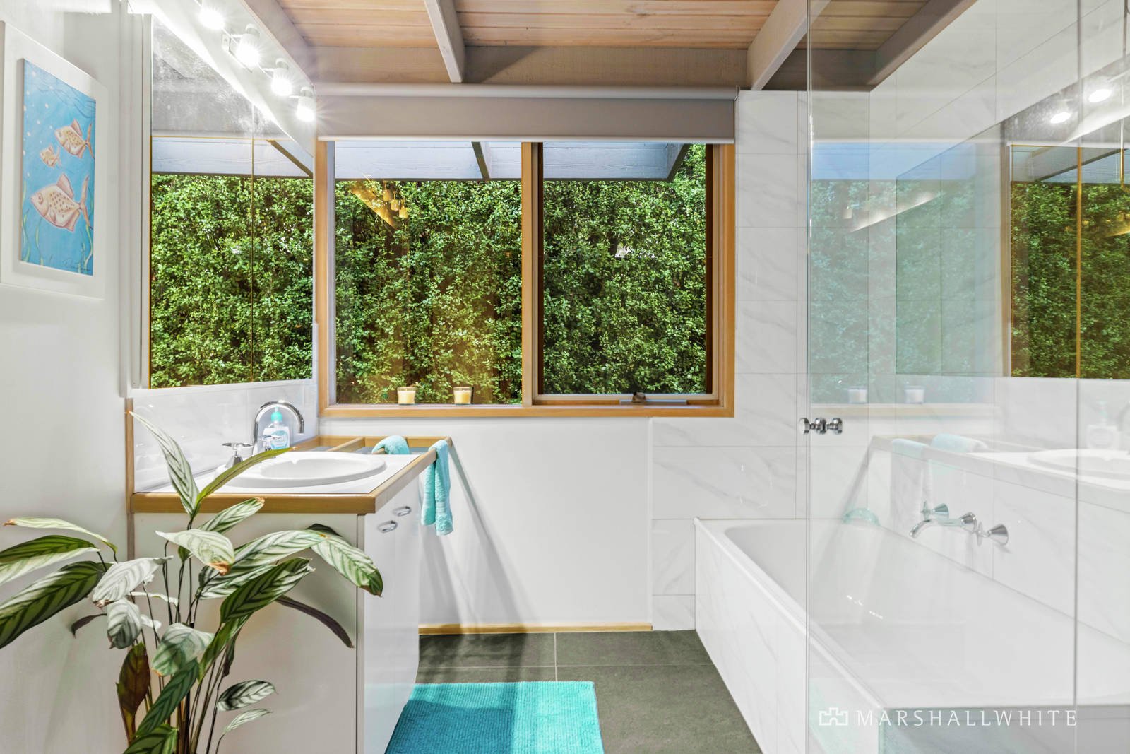 A private frontage reveals itself behind an immaculate garden and double carport, before opening to invite exploration across a sweeping entertaining zone, highlighting formal lounge and dining bridged by a feature open fireplace. Spectacular garden aspects spill inside through expansive windows, introducing bright pops of lush foliage and hints of colour across an otherwise cool, neutral palette. Guiding your way towards the rear of the home, the expansive outlooks doesn't stop, with the garden backdrop remaining a huge feature as the home opens to unveil a seamless dining, casual living and stone-topped kitchen with quality stainless steel appliances and garden window. With views in every direction met with lush greenery and immaculate visual appeal, the tranquil ambiance inside offers a truly calming space to live.