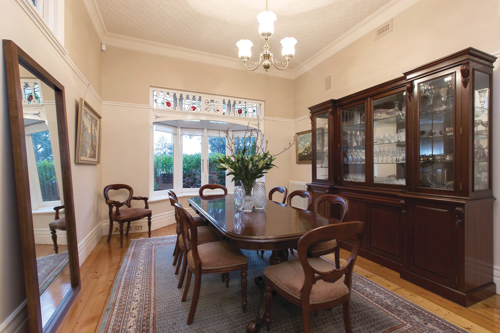 Glorious pressed metal ceilings, leadlight windows and Baltic pine floors highlight the wonderful period allure through the versatile floorplan. The wide entrance hall introduces the three formal rooms, an elegant sitting room, refined formal living room and inviting formal dining, all with marble fireplaces. A built in fish tank adds a serene ambience to the superbly appointed Miele gourmet kitchen featuring granite benches, a coffee maker and walk in pantry with wine cellar. The spacious, light-filled living and dining room opens out to a fabulous private west-facing outdoor entertaining precinct with Vergola, wood fire oven, full BBQ kitchen and tranquil water features. The beautiful main bedroom with stunning en-suite and walk in robe enjoys downstairs serenity, the three additional large bedrooms and a large family bathroom are upstairs.