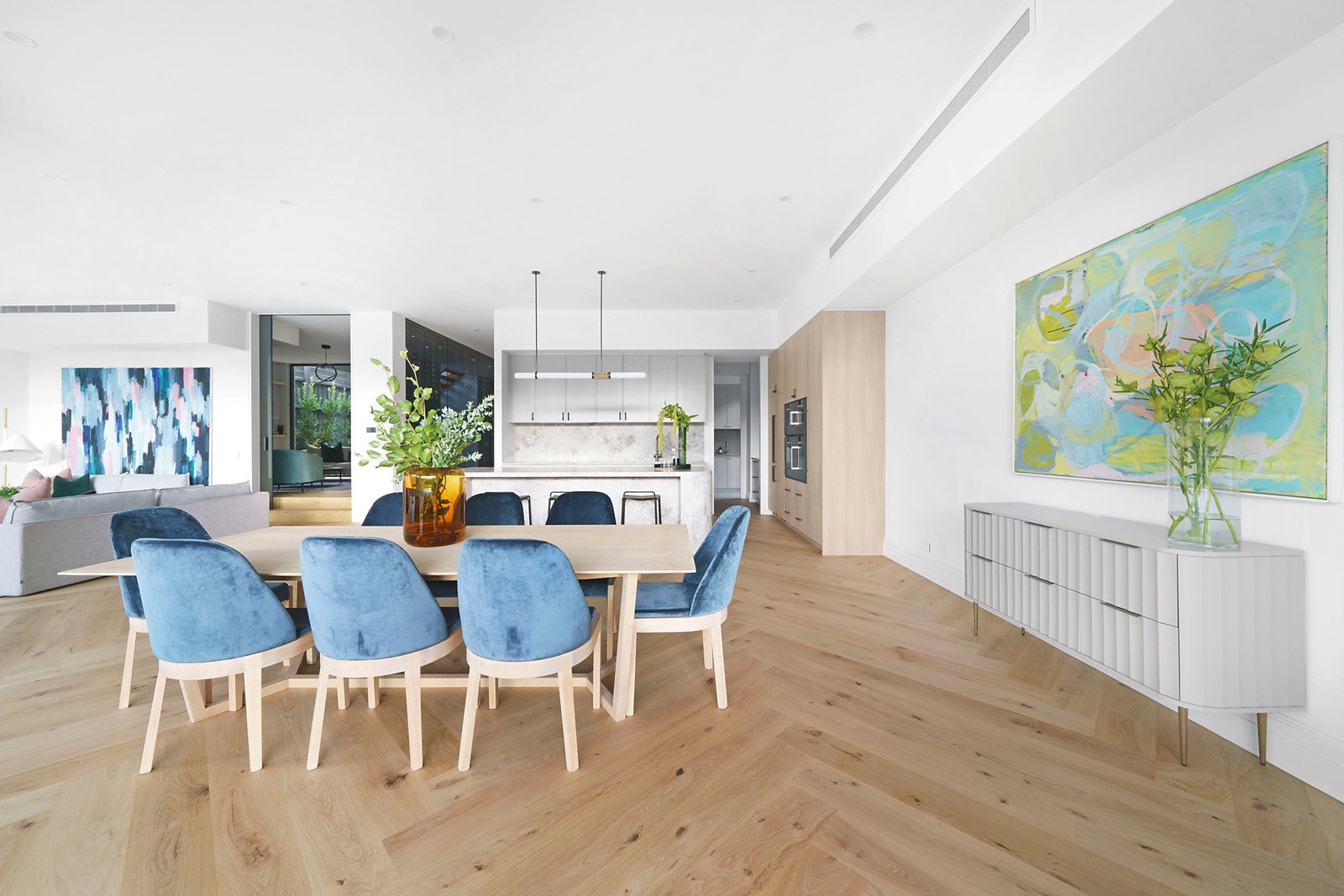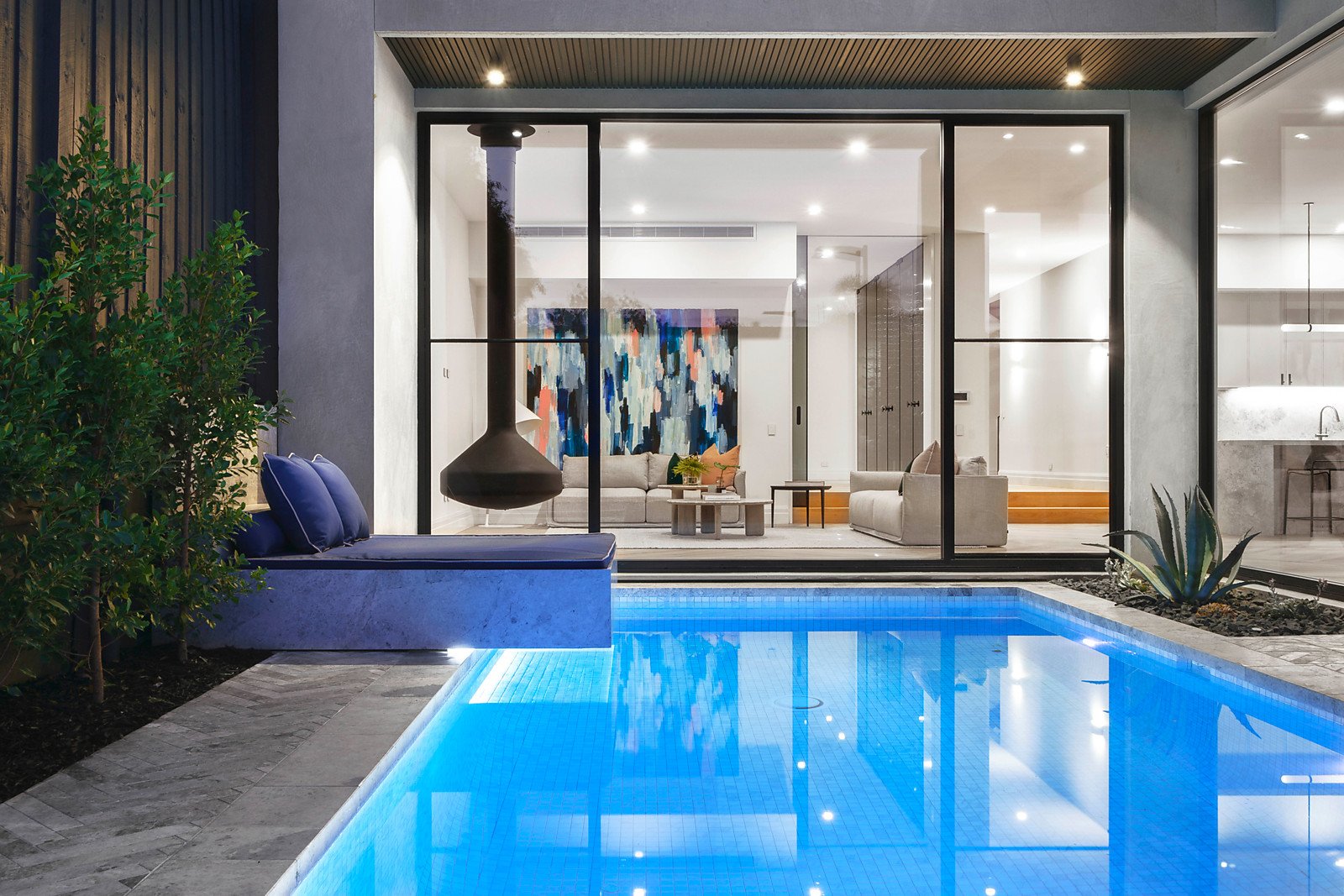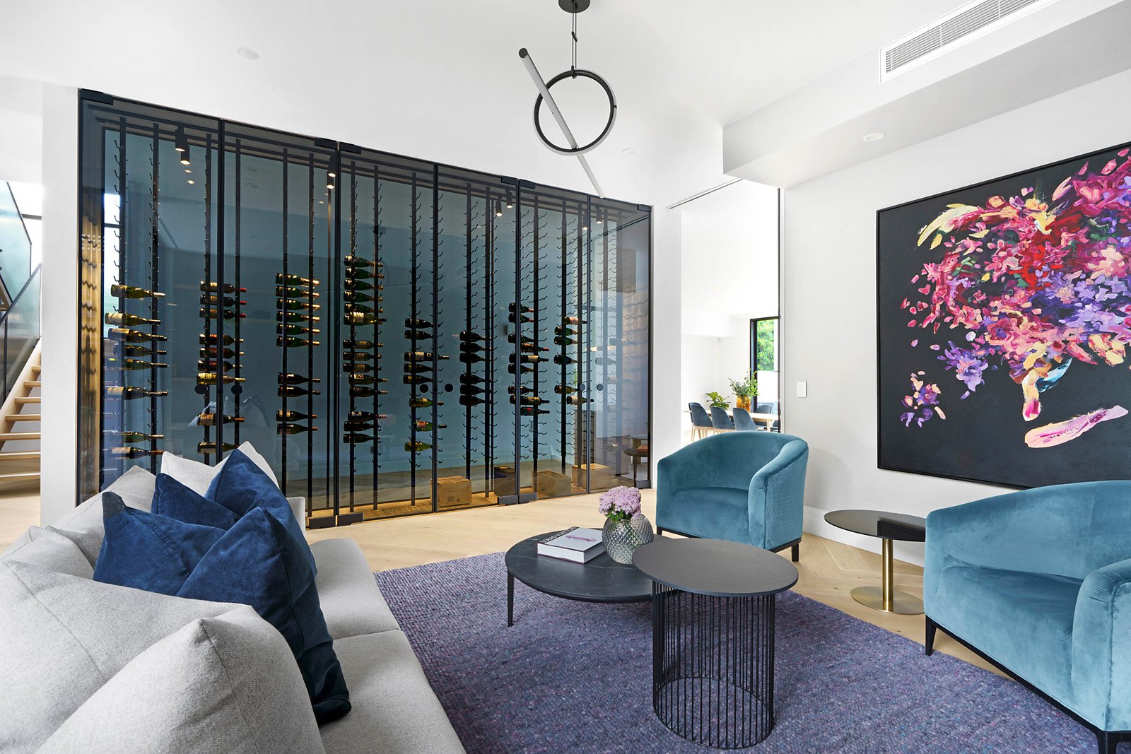 The quiet, gallery-like interior features a striking white and grey themed decor, high ceilings and herringbone parquetry flooring flowing through the entrance foyer leading to a downstairs bedroom with WIR and ensuite, sitting room with gas fireplace, wine room and powder room. Through to a stunning open-plan informal living domain incorporating a state-of-the art prestige Gaggenau and Ocean tundra marble appointed kitchen with a butler's pantry and large laundry. All opening to an outdoor alfresco entertaining area with pool and gas mains barbeque kitchen - perfect for year round indoor/outdoor entertaining with family and friends. The upstairs area has a huge retreat and four further bedrooms, three with ensuites plus a family bathroom - a sumptuous master bedroom includes a dressing room and balcony. Leading through a remote Gorter roof hatch to a third level, rooftop entertaining area complete with a second gas mains barbeque kitchen and City skyline glimpses.