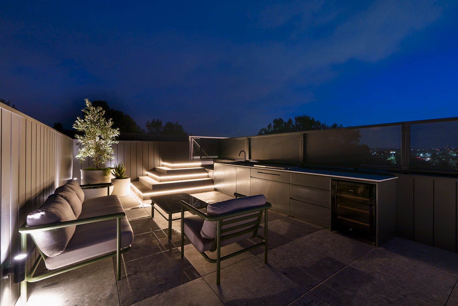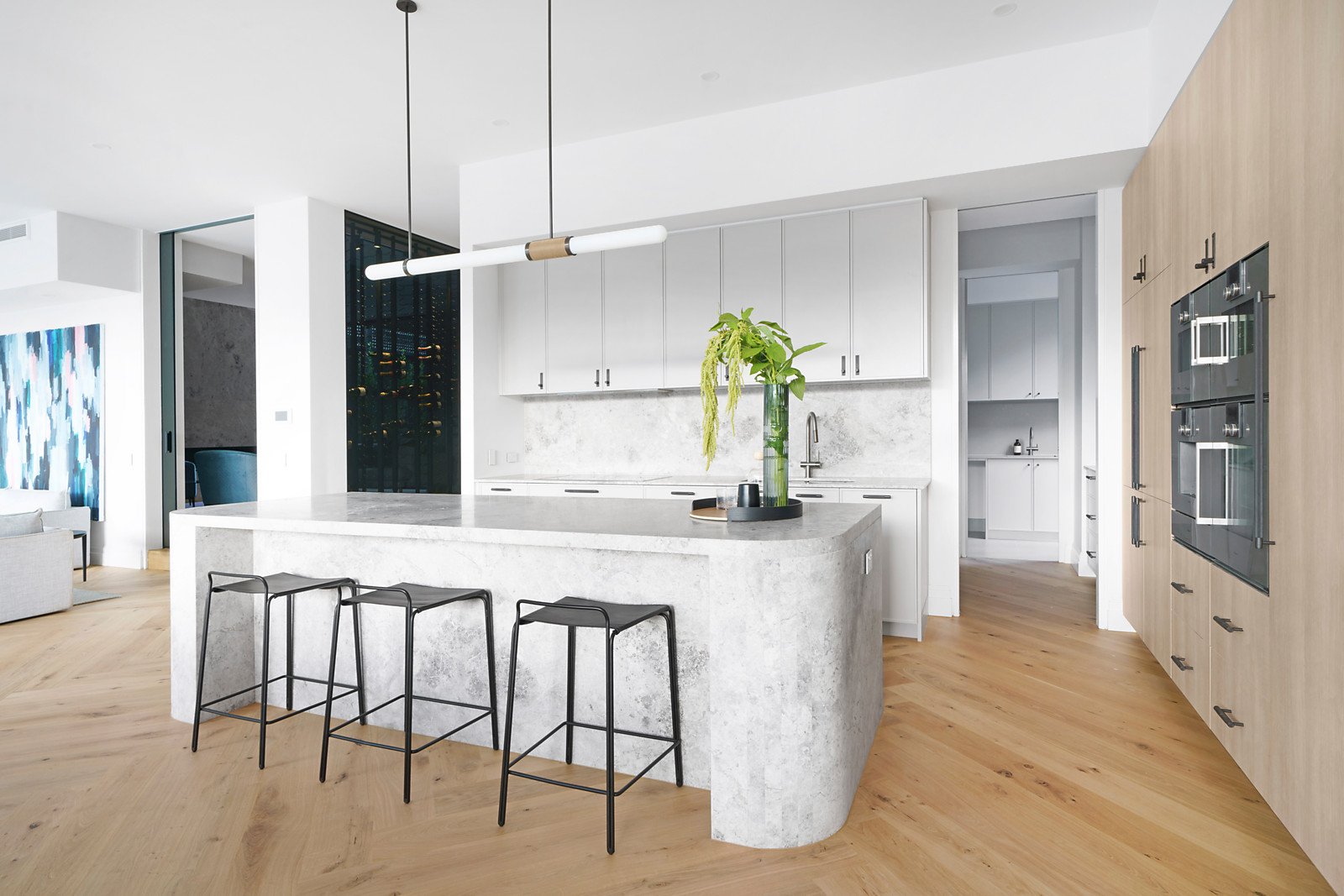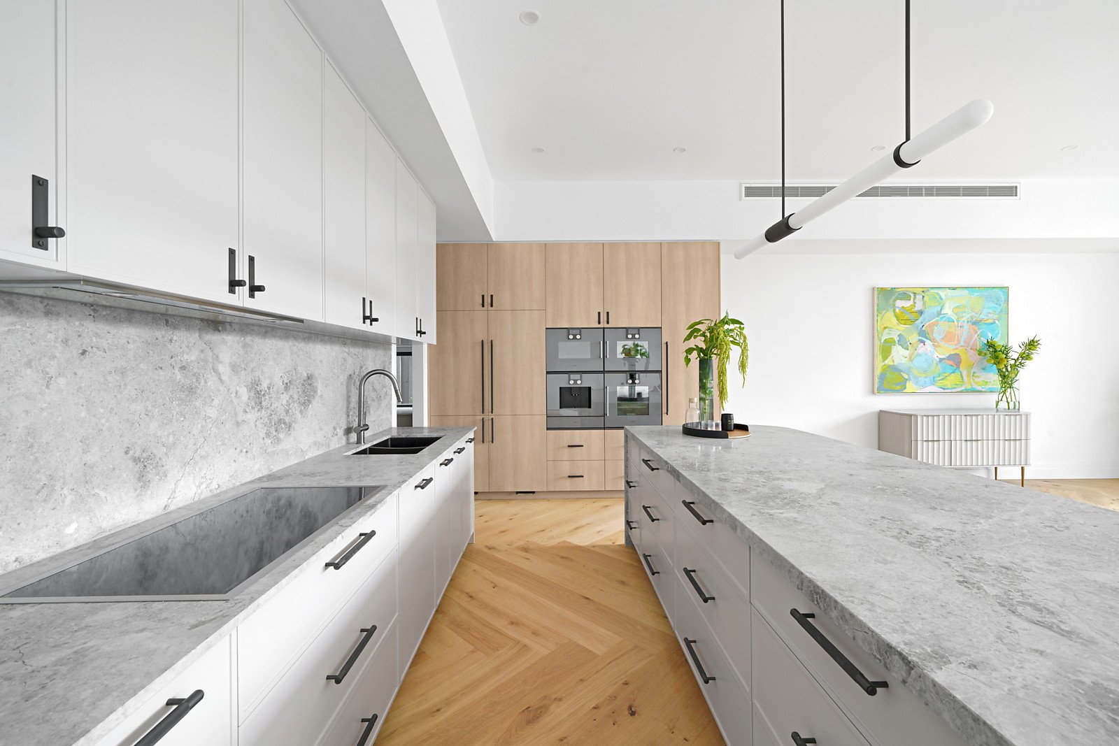 The quiet, gallery-like interior features a striking white and grey themed decor, high ceilings and herringbone parquetry flooring flowing through the entrance foyer leading to a downstairs bedroom with WIR and ensuite, sitting room with gas fireplace, wine room and powder room. Through to a stunning open-plan informal living domain incorporating a state-of-the art prestige Gaggenau and Ocean tundra marble appointed kitchen with a butler's pantry and large laundry. All opening to an outdoor alfresco entertaining area with pool and gas mains barbeque kitchen - perfect for year round indoor/outdoor entertaining with family and friends. The upstairs area has a huge retreat and four further bedrooms, three with ensuites plus a family bathroom - a sumptuous master bedroom includes a dressing room and balcony. Leading through a remote Gorter roof hatch to a third level, rooftop entertaining area complete with a second gas mains barbeque kitchen and City skyline glimpses.