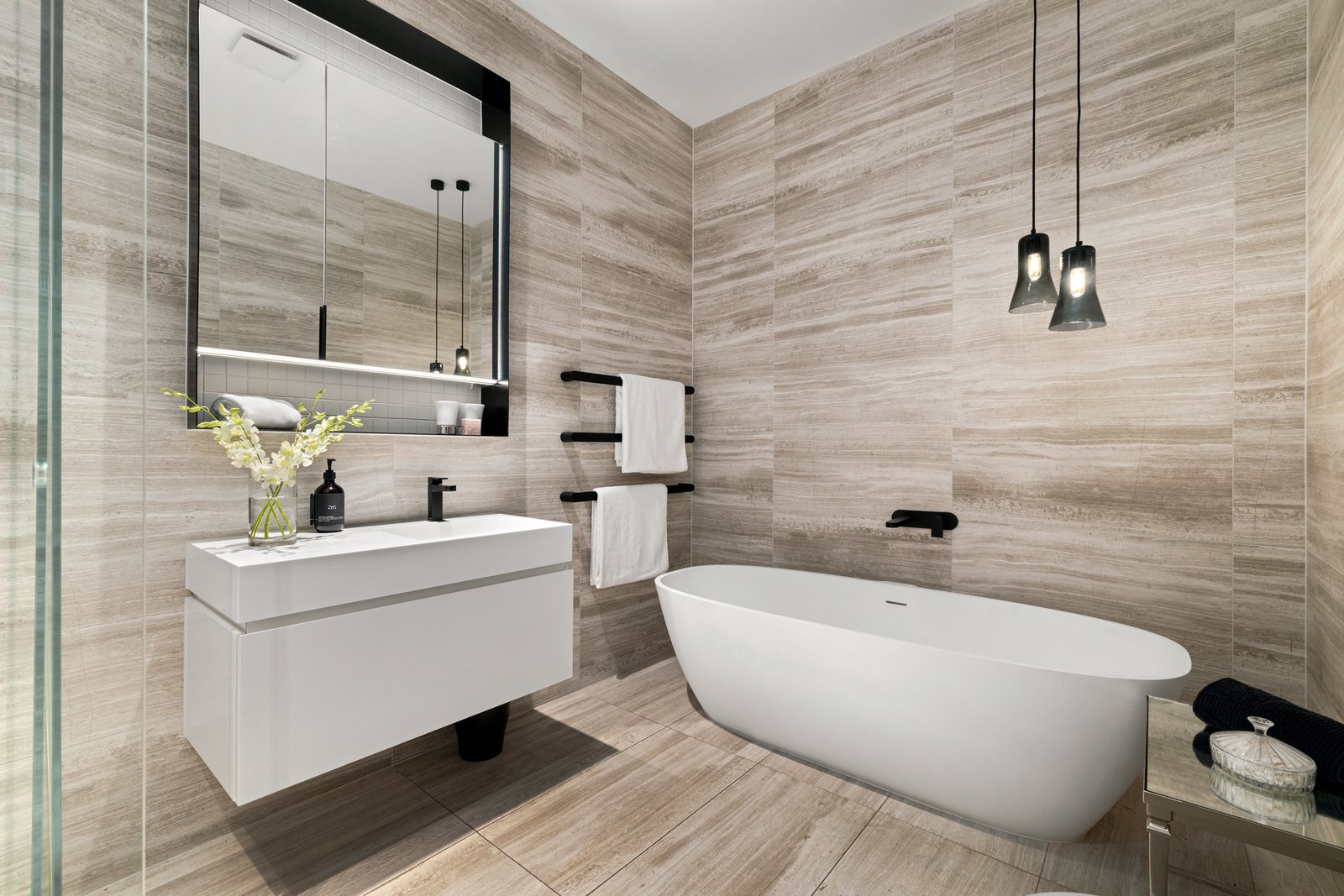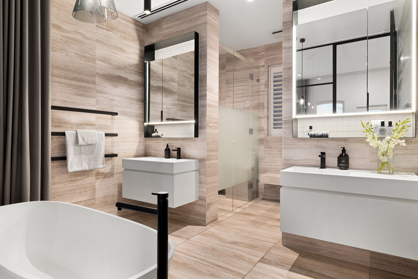 Interiors defined by soaring ceilings and full-height glazing draw the eye directly to the bay, ensuring spectacular water and city vistas are present from almost every room. Three generously proportioned bedrooms and multiple living areas occupy the ground floor, each appointed with full-height robes, integrated desks, and immediate access to a luxurious central bathroom. A substantial upper level is dedicated to entertaining, unfolding to the open-plan living, dining and kitchen, fitted with Vintec wine storage, stone surfaces, and a suite of premium Miele appliances, including side-by-side refrigeration, with city views to one side and the bay to the other. A separate lounge flows to the lower terrace, where a heated spa, gas fireplace, commercial-grade barbecue kitchen and motorised ceiling create a genuine all-weather outdoor entertainment destination. The city skyline unfolds across the full panorama as the lift ascends to the grand main bedroom above, featuring a private study and gallery of fitted walk-in robes, an ensuite finished in steel-framed glass, and a freestanding bath oriented directly to the water.