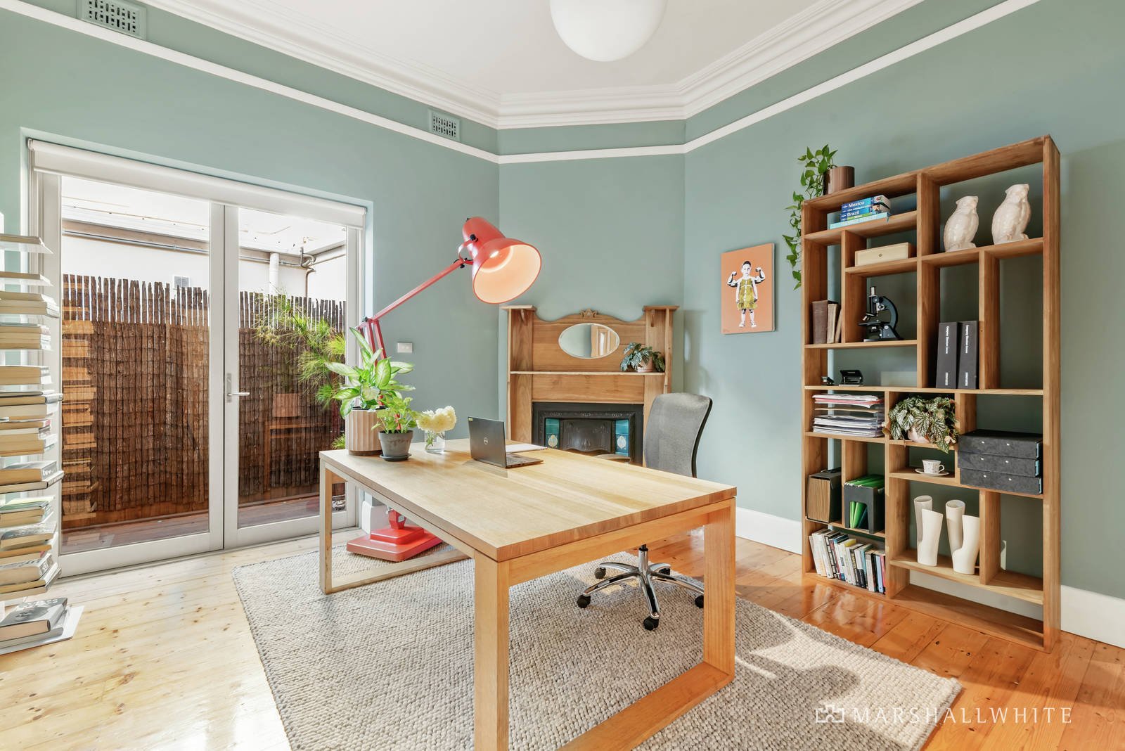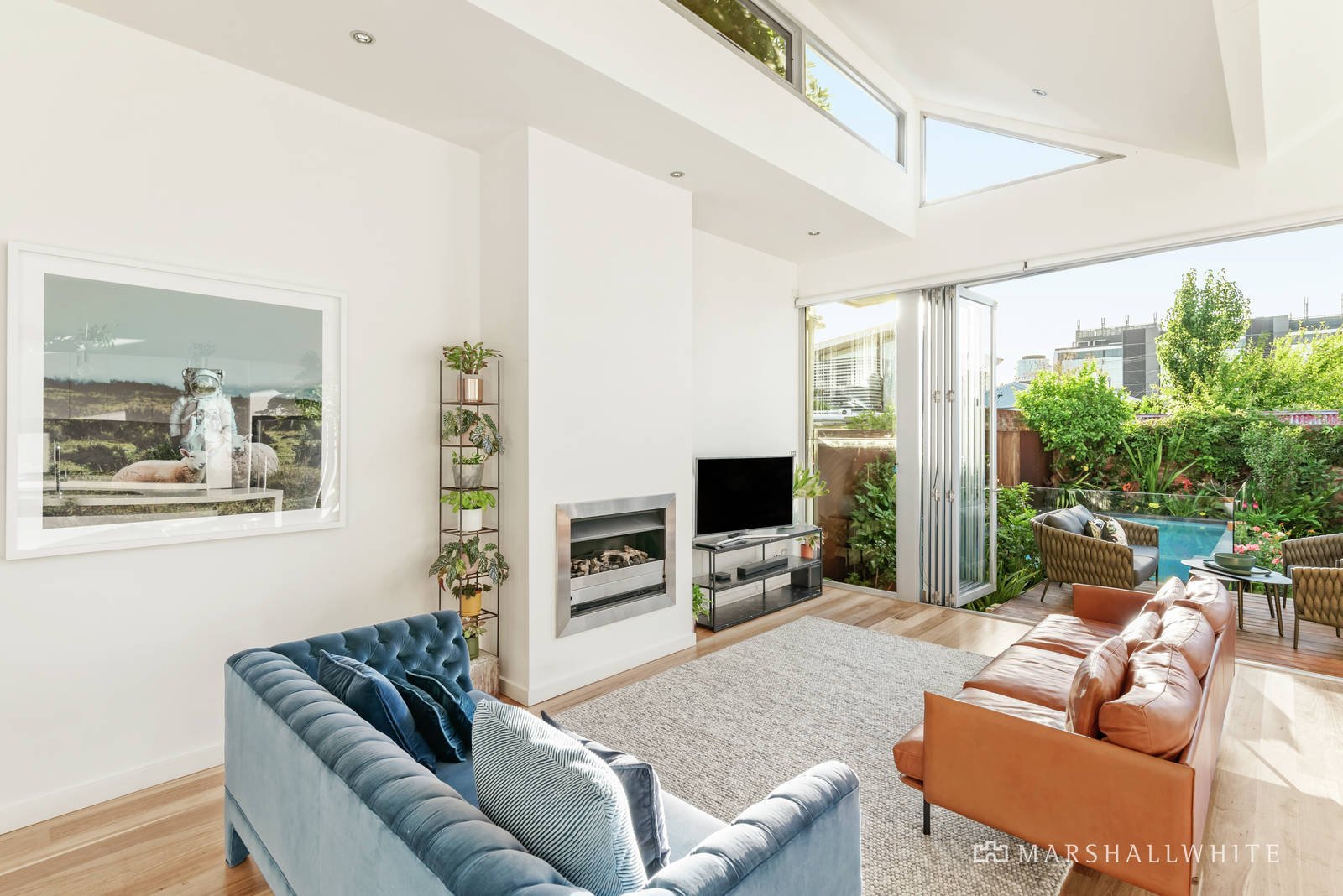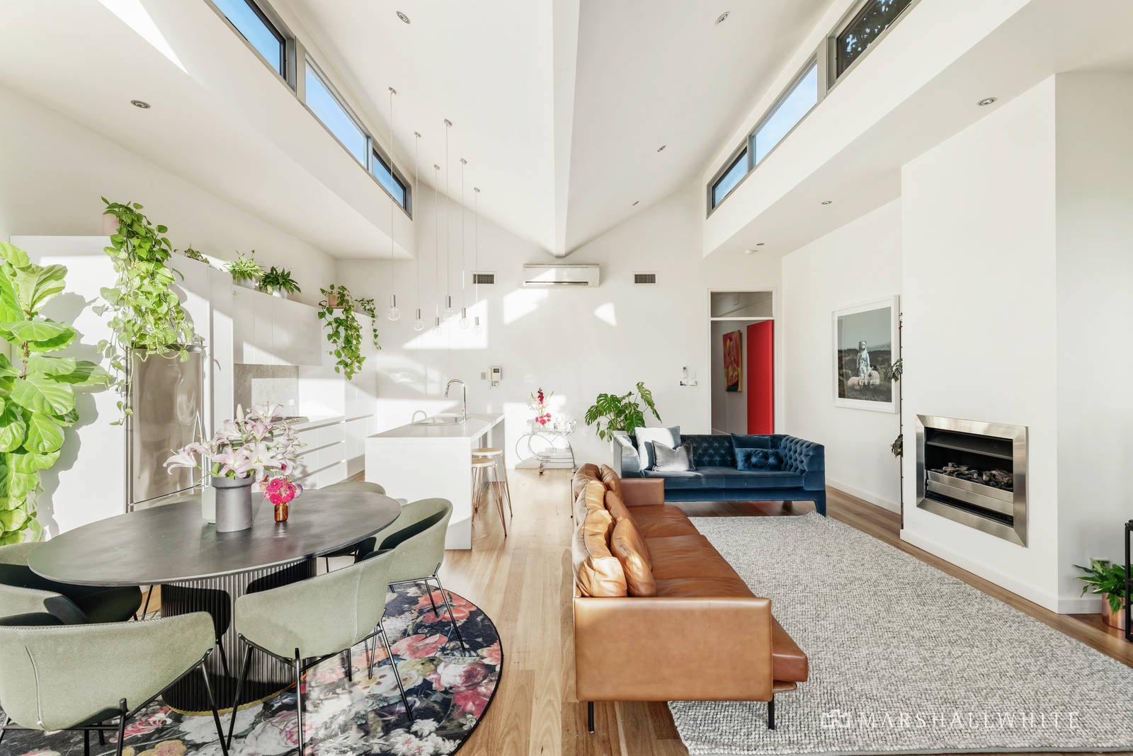 Behind a high walled landscaped garden, the skylit entrance hall featuring Baltic pine floors and high ceilings introduces the beautiful main bedroom with bay window, fireplace, walk in robe and a stunning designer en suite, two additional double bedrooms with fireplaces and robes and a stylish bathroom with bath overlooking the side deck. An oversize feature pivot door separates the expansive open plan living and dining room beneath a soaring butterfly wing ceiling with clerestory windows. Featuring a gas log fire, hardwood floors and a sleek gourmet kitchen boasting white stone benches and European appliances, the living space opens fully through bi-fold doors to the picturesque private northwest garden with large entertaining deck and a striking mosaic tiled solar heated pool.