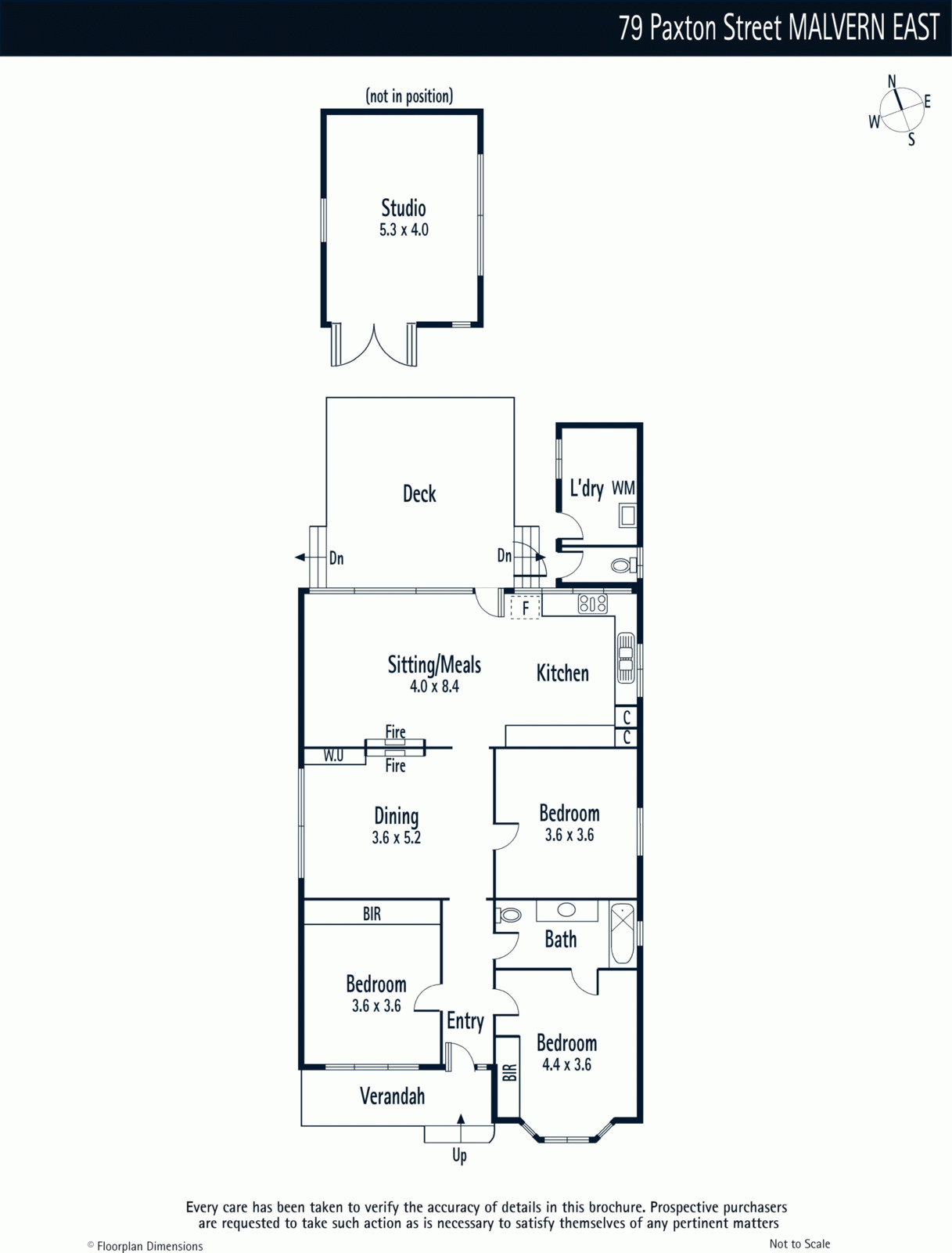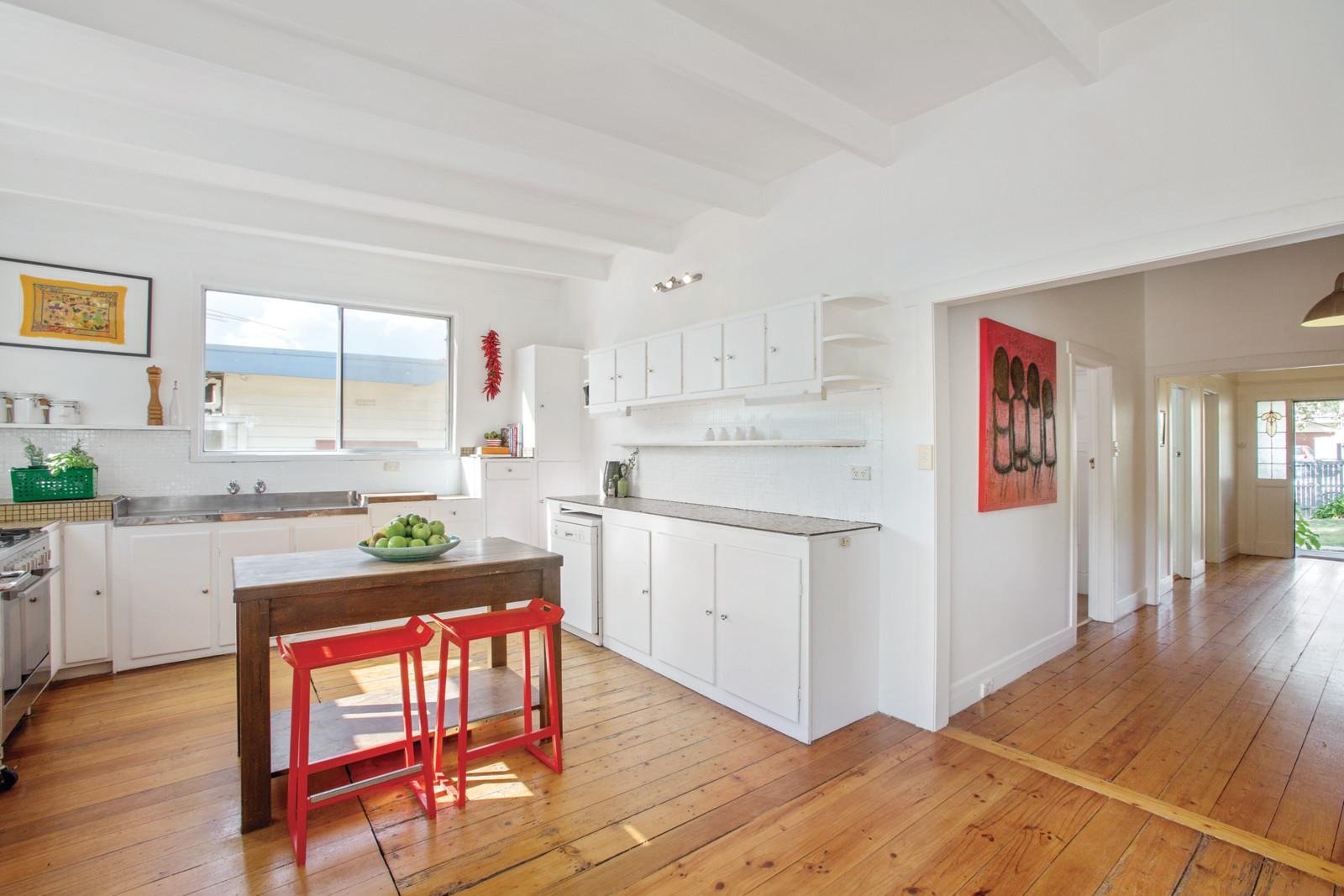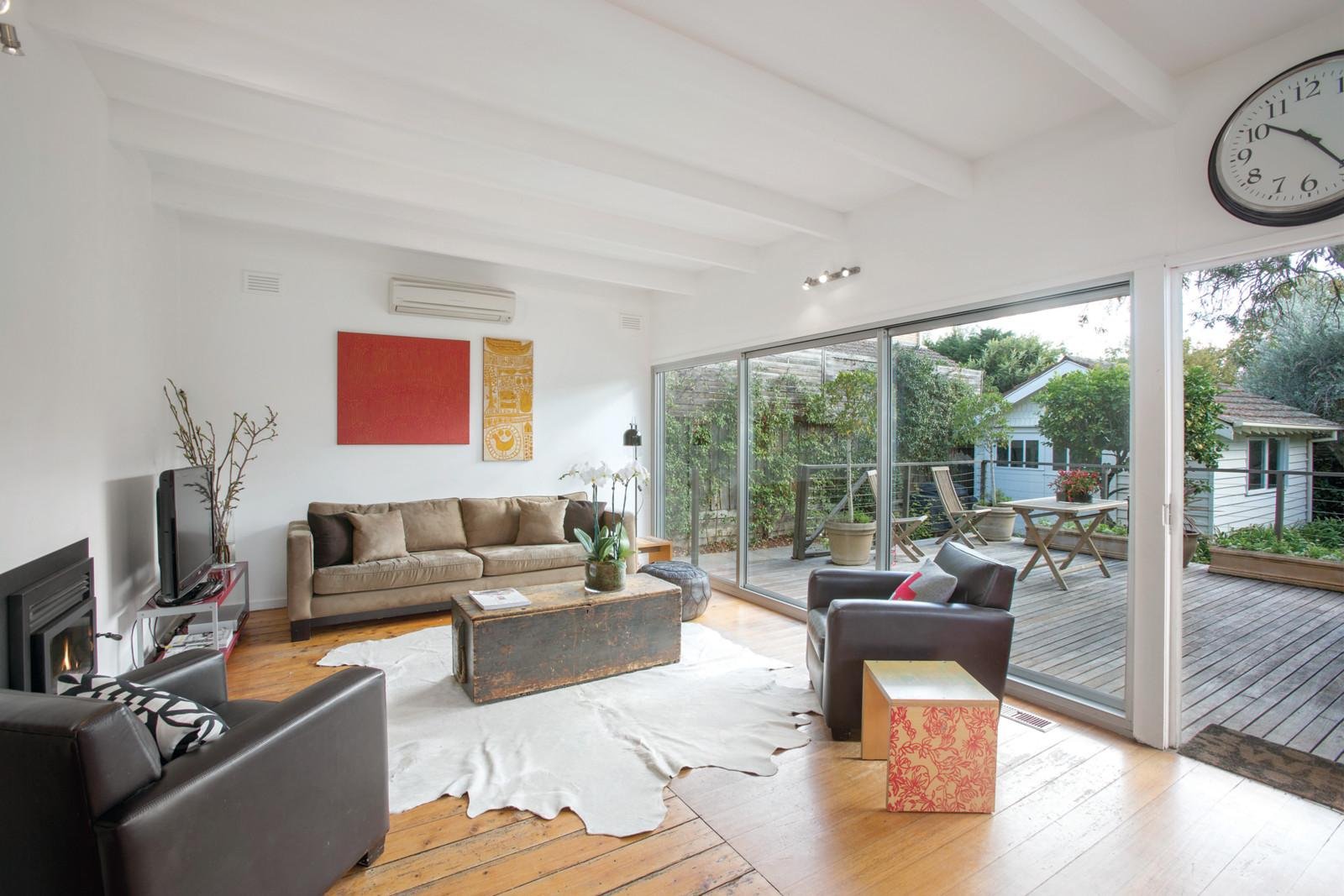 The picture perfect façade is an instant attraction while inside Baltic pine floors, high ceilings and plantation shutters convey an inviting ambience through the wide hallway, three gorgeous double bedrooms and a bright bathroom. The generous dining room and sun-drenched living room sharing a dual fireplace are adjacent to a large kitchen featuring a 90cm commercial oven. A wall of sliding glass extends living out to a spacious north-facing deck overlooking the deep leafy private garden with freestanding playroom/studio.