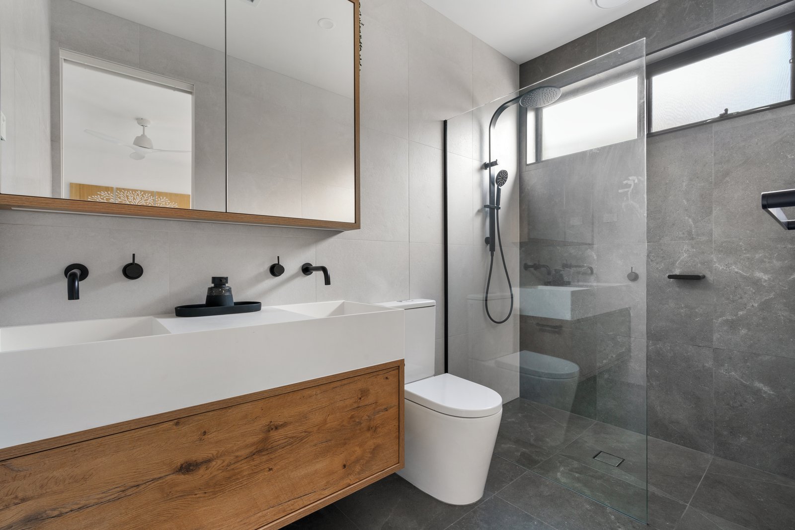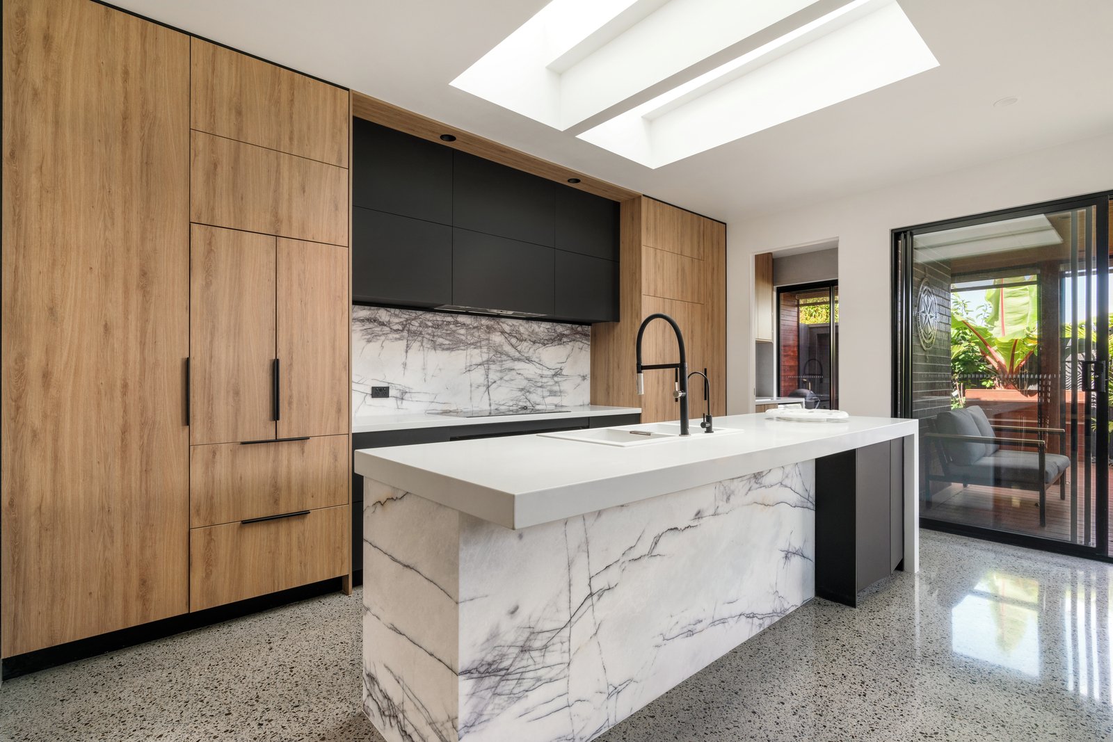 The bright, contemporary interiors instantly evoke a sense of calm, with expansive double glazing framing views of lush greenery. Downstairs, there is a secondary master bedroom with an ensuite, and a spacious open-plan kitchen, dining, and living area complete with marble/stone countertops and top-quality European appliances. Sliding doors open to a low-maintenance rear garden and covered deck, making this the perfect family beach house or primary residence.